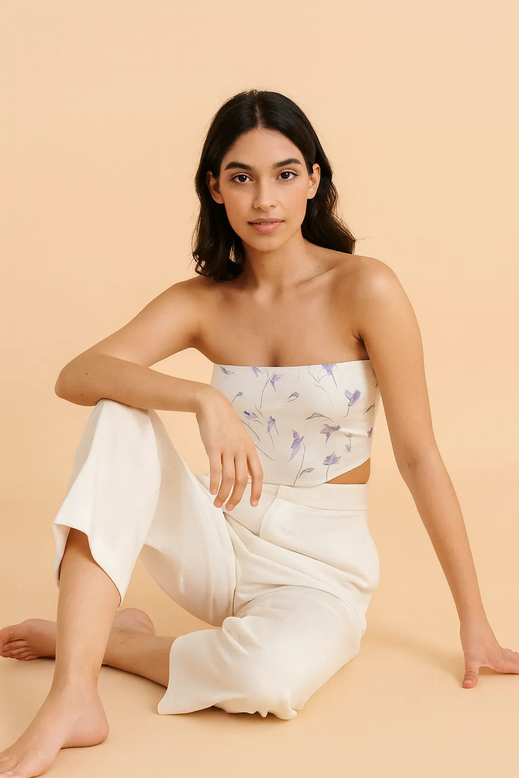 Woman wearing a strapless floral top and white wide-leg pants on a plain background