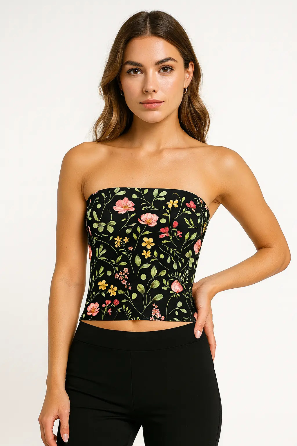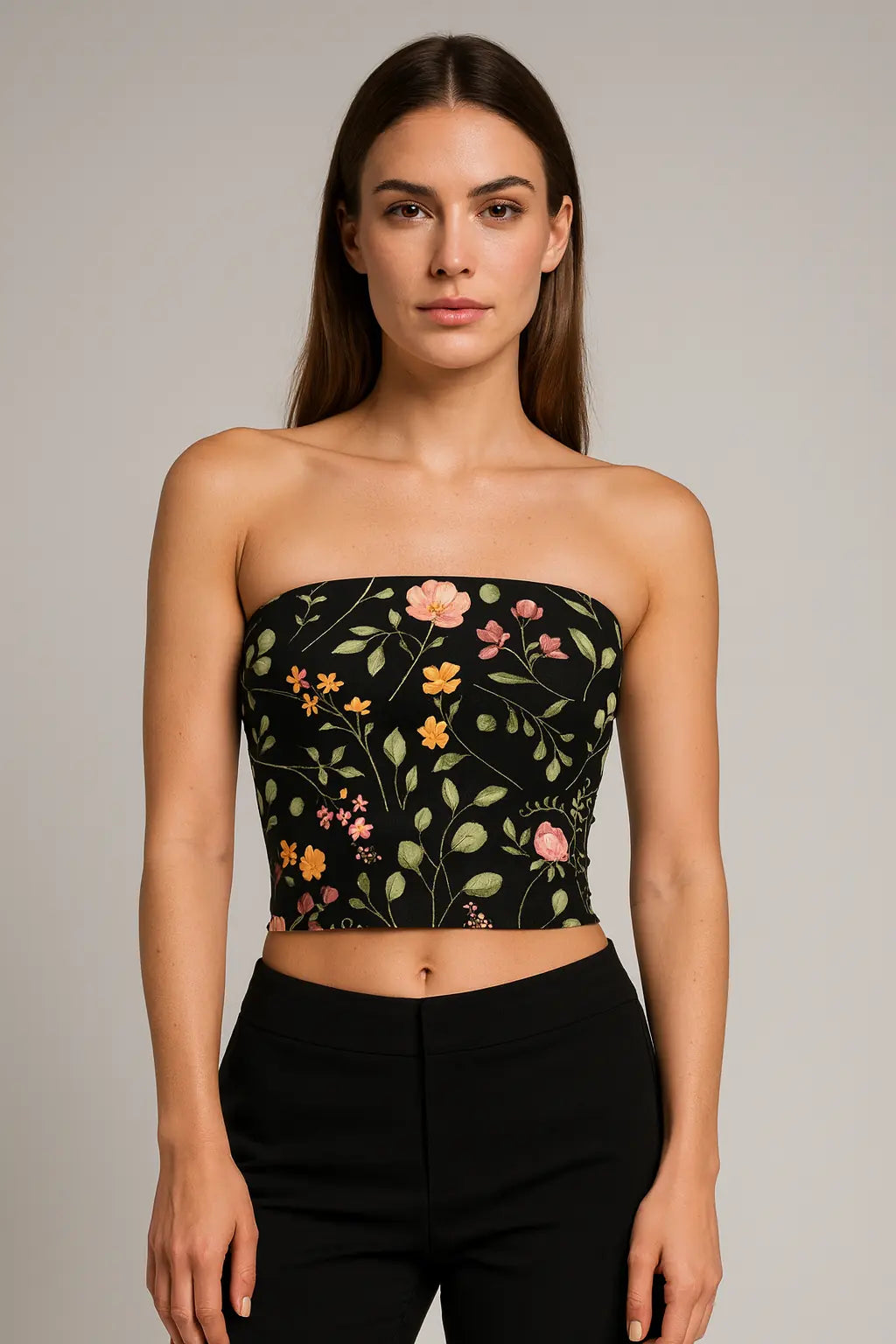 A chic black tube top featuring an elegant flower pattern. Its regular fit provides comfort and style, perfect for pairing with jeans or skirts. Ideal for casual outings, parties, or summer looks with a touch of sophistication.