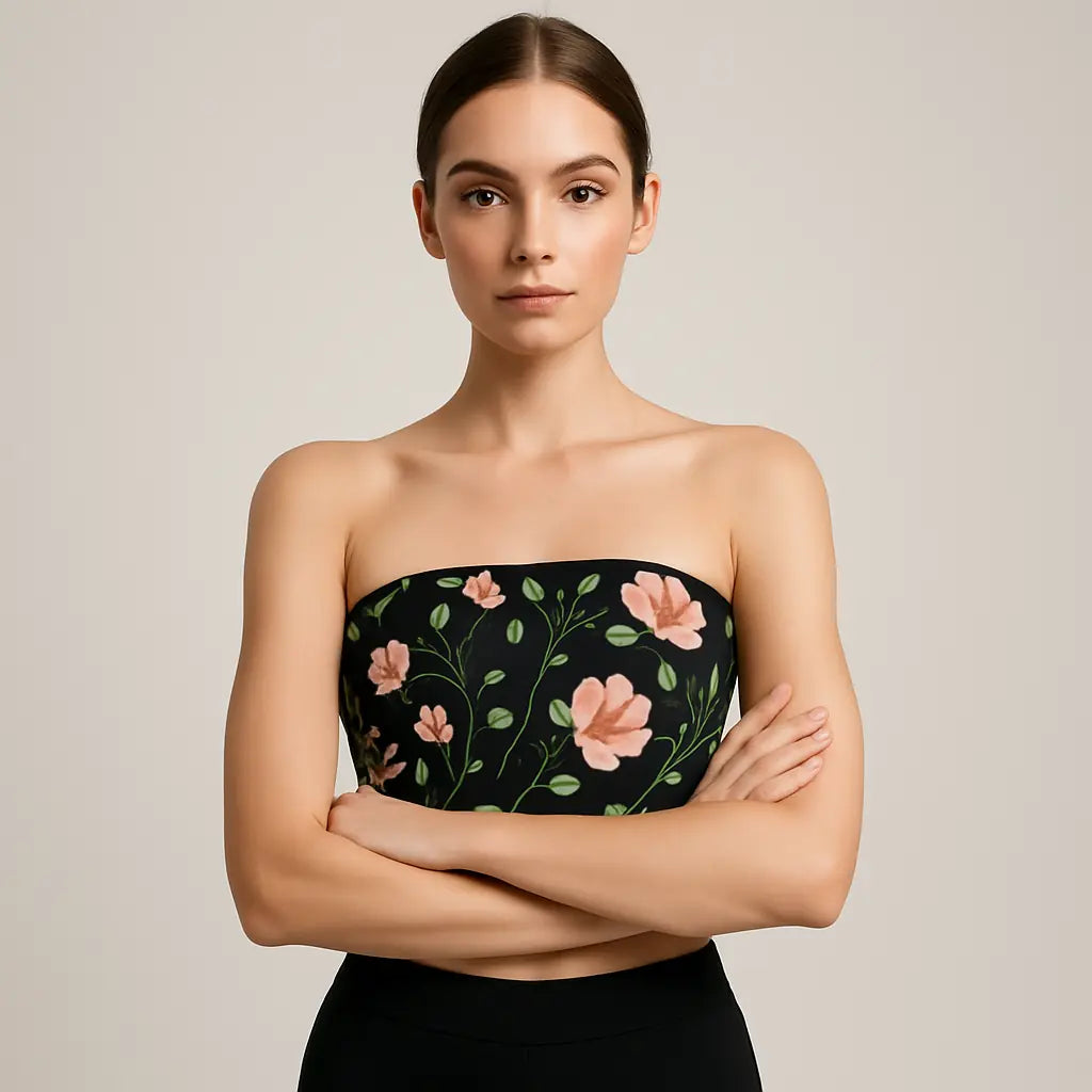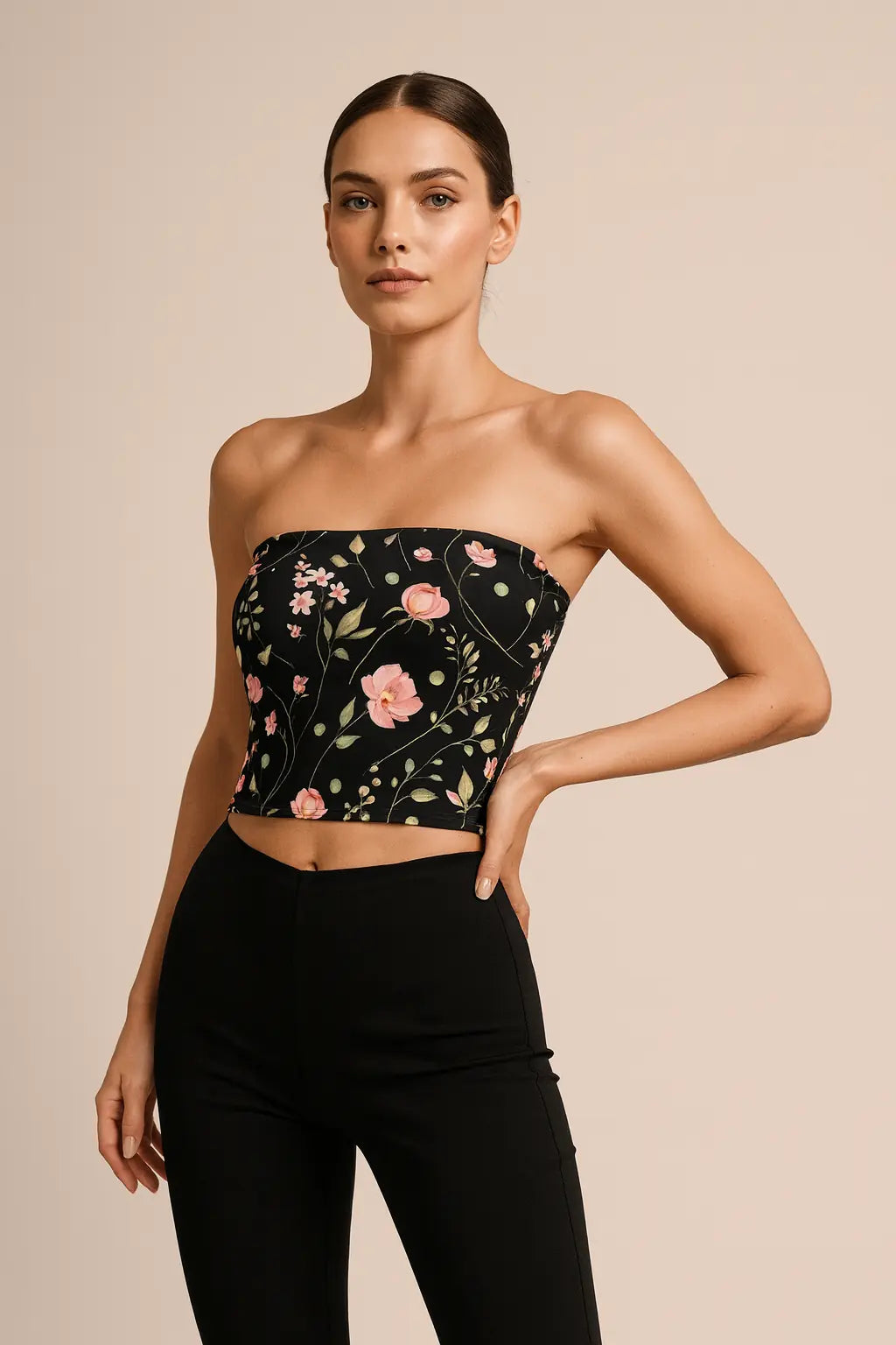 A chic black tube top featuring an elegant flower pattern. Its regular fit provides comfort and style, perfect for pairing with jeans or skirts. Ideal for casual outings, parties, or summer looks with a touch of sophistication.