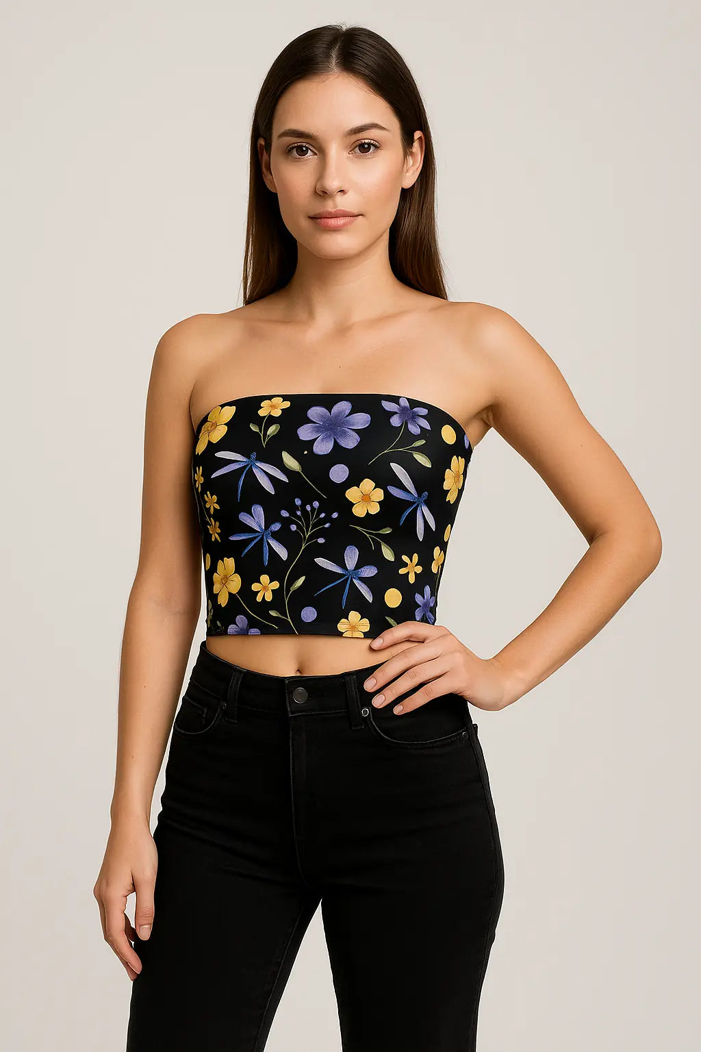 A chic black tube top featuring an elegant flower pattern. Its regular fit provides comfort and style, perfect for pairing with jeans or skirts. Ideal for casual outings, parties, or summer looks with a touch of sophistication.