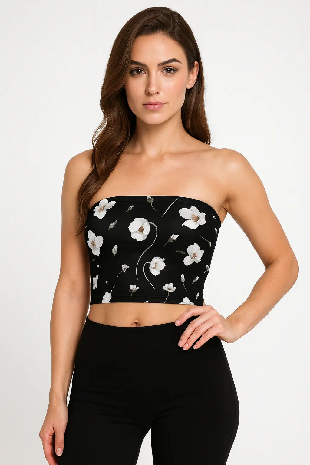 A chic black tube top featuring an elegant flower pattern. Its regular fit provides comfort and style, perfect for pairing with jeans or skirts. Ideal for casual outings, parties, or summer looks with a touch of sophistication.
