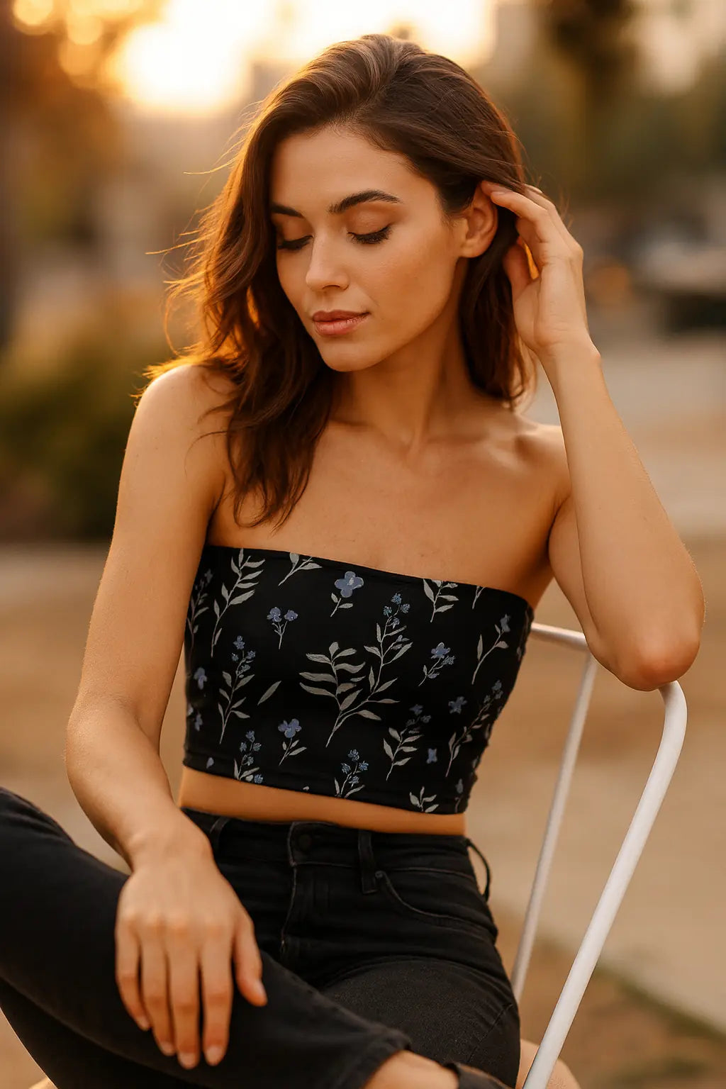 A chic black tube top featuring an elegant flower pattern. Its regular fit provides comfort and style, perfect for pairing with jeans or skirts. Ideal for casual outings, parties, or summer looks with a touch of sophistication.