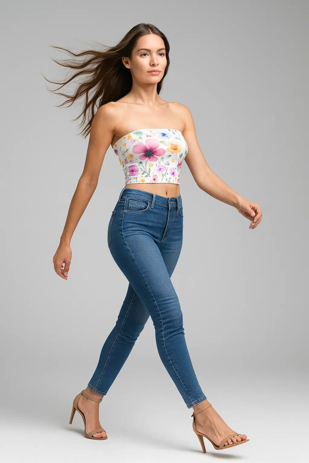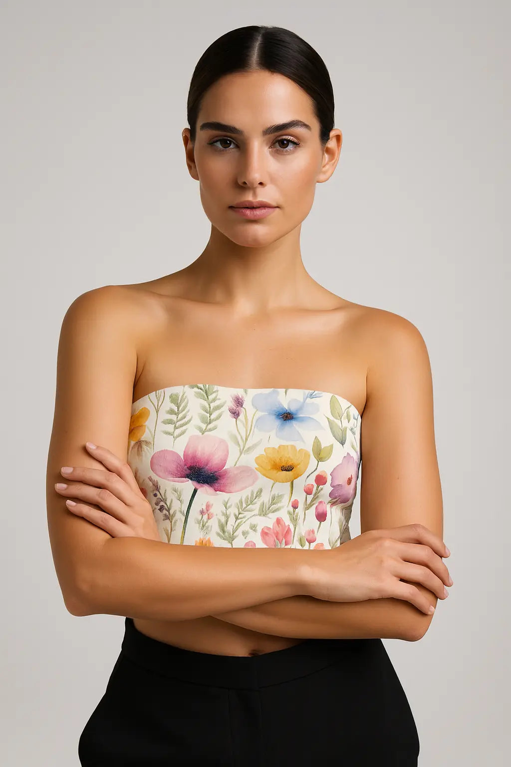 A stylish white tube top featuring delicate flower motifs, designed for everyday chic. Its regular fit provides comfort, making it a versatile piece for pairing with skirts, jeans, or layering for fashionable summer looks.