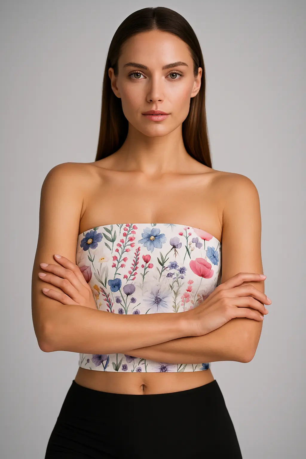 A stylish white tube top featuring delicate flower motifs, designed for everyday chic. Its regular fit provides comfort, making it a versatile piece for pairing with skirts, jeans, or layering for fashionable summer looks.