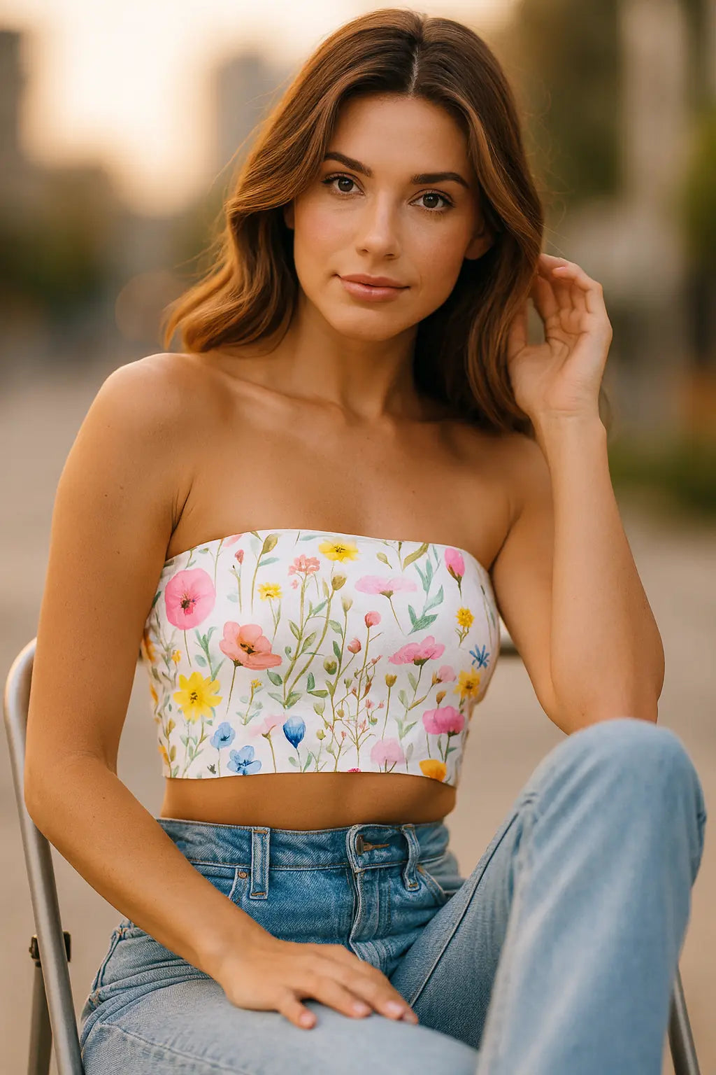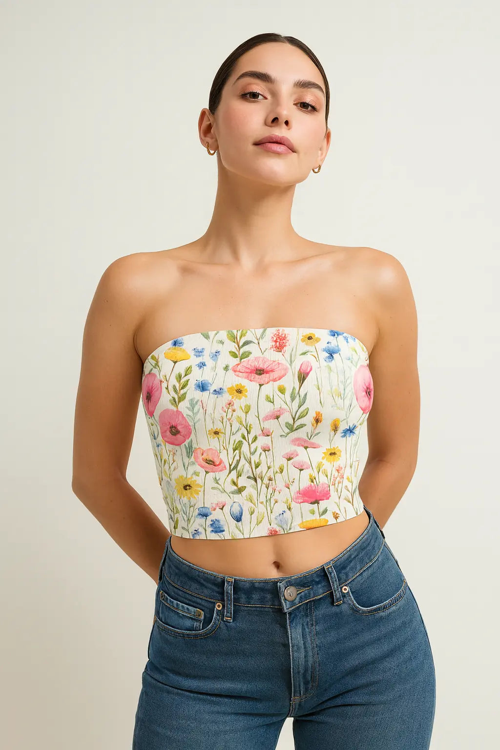 A stylish white tube top featuring delicate flower motifs, designed for everyday chic. Its regular fit provides comfort, making it a versatile piece for pairing with skirts, jeans, or layering for fashionable summer looks.