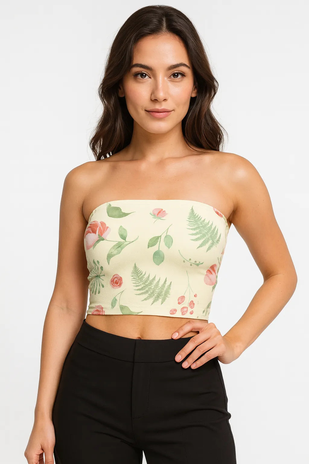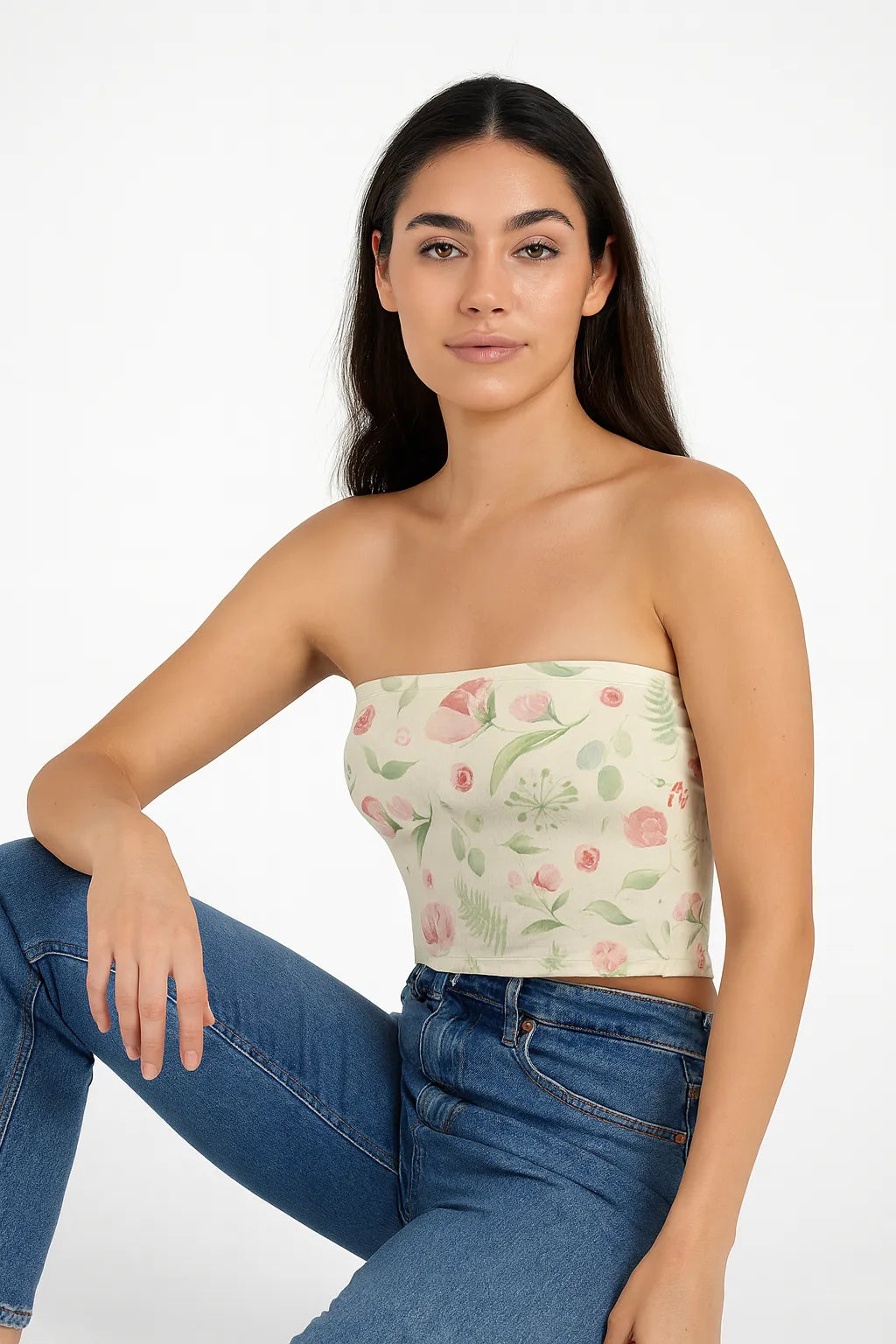 A stylish white tube top featuring delicate flower motifs, designed for everyday chic. Its regular fit provides comfort, making it a versatile piece for pairing with skirts, jeans, or layering for fashionable summer looks.