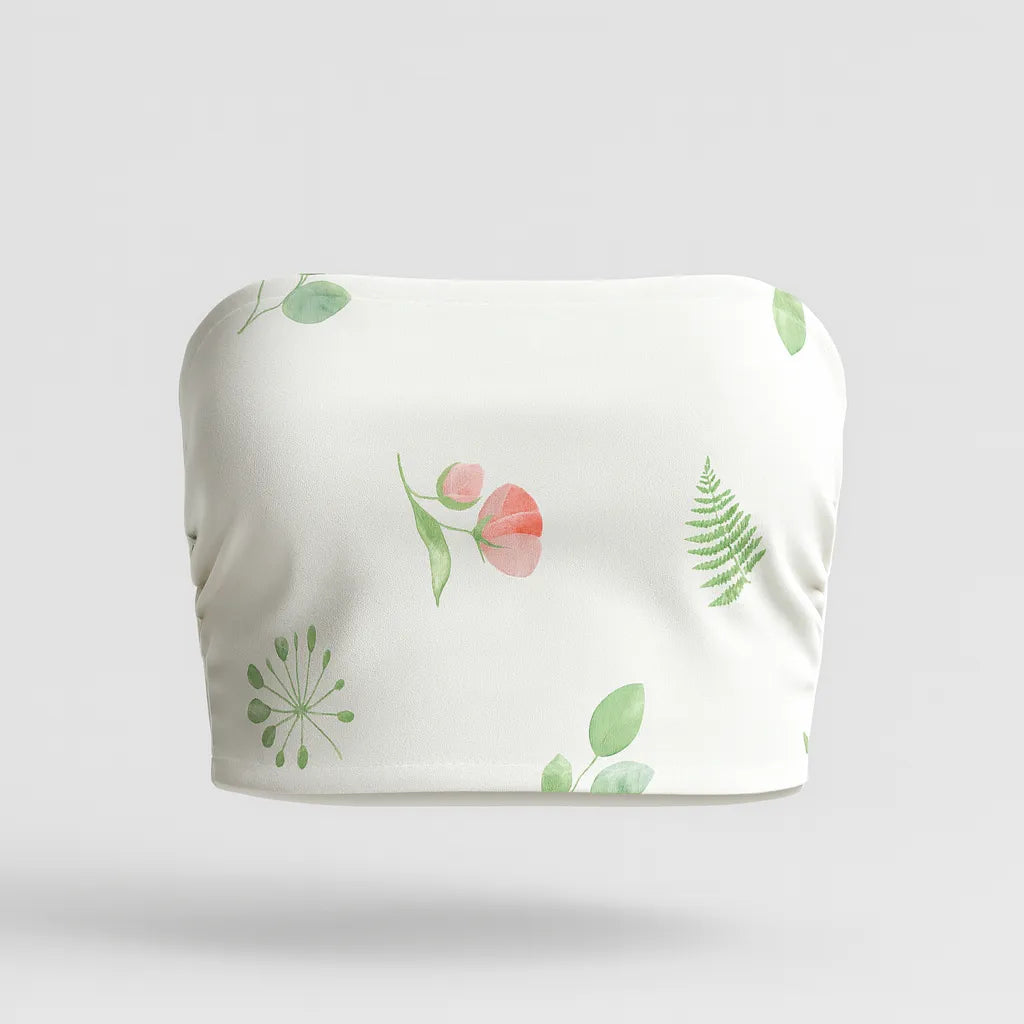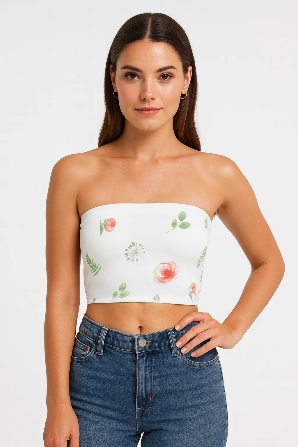 A stylish tube top featuring delicate flower motifs, designed for everyday chic. Its regular fit provides comfort, making it a versatile piece for pairing with skirts, jeans, or layering for fashionable summer looks.