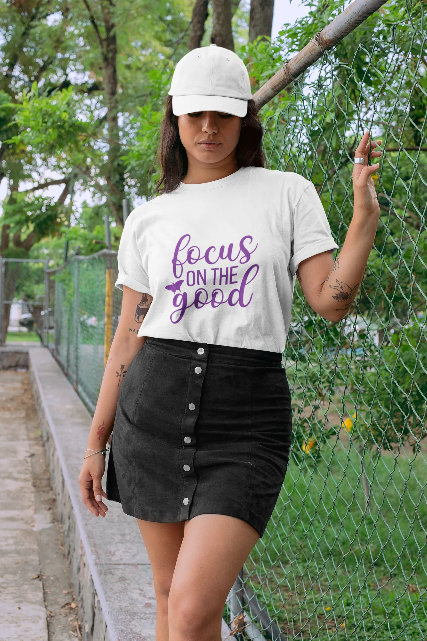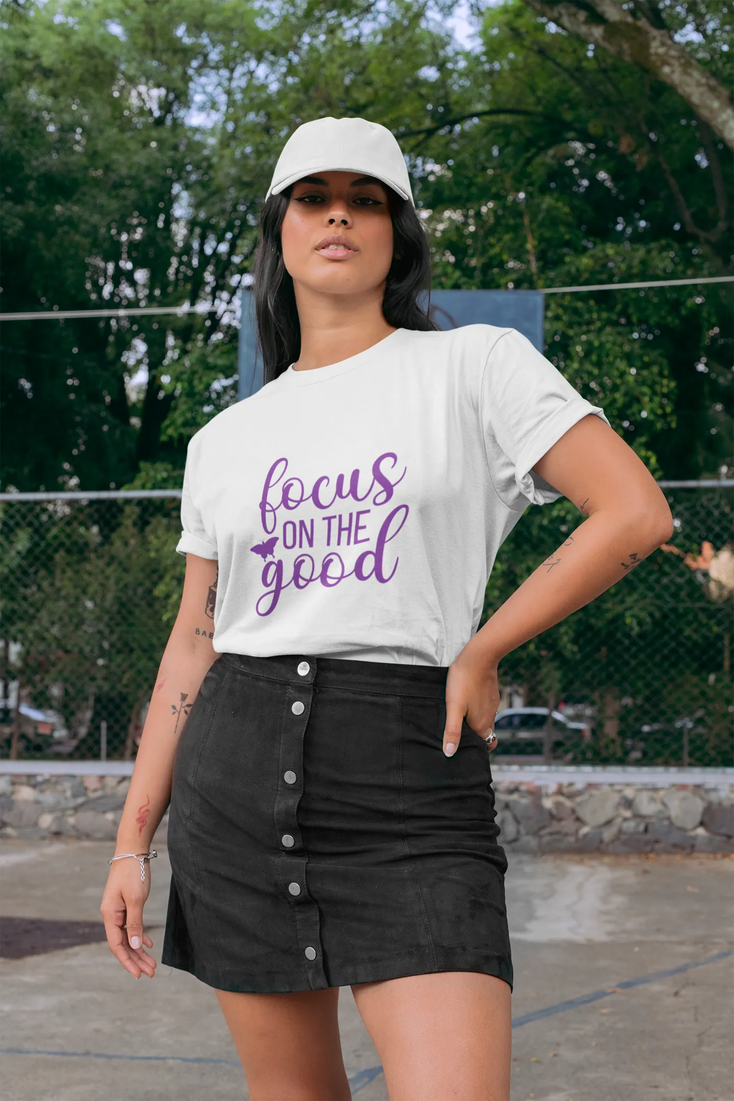 A stylish T-shirt design featuring bold typography and uplifting words like "Good Vibes Only" or "Stay Positive." Vibrant colors, minimalistic icons, and a sleek layout create an eye-catching look, spreading positivity and confidence with every wear.