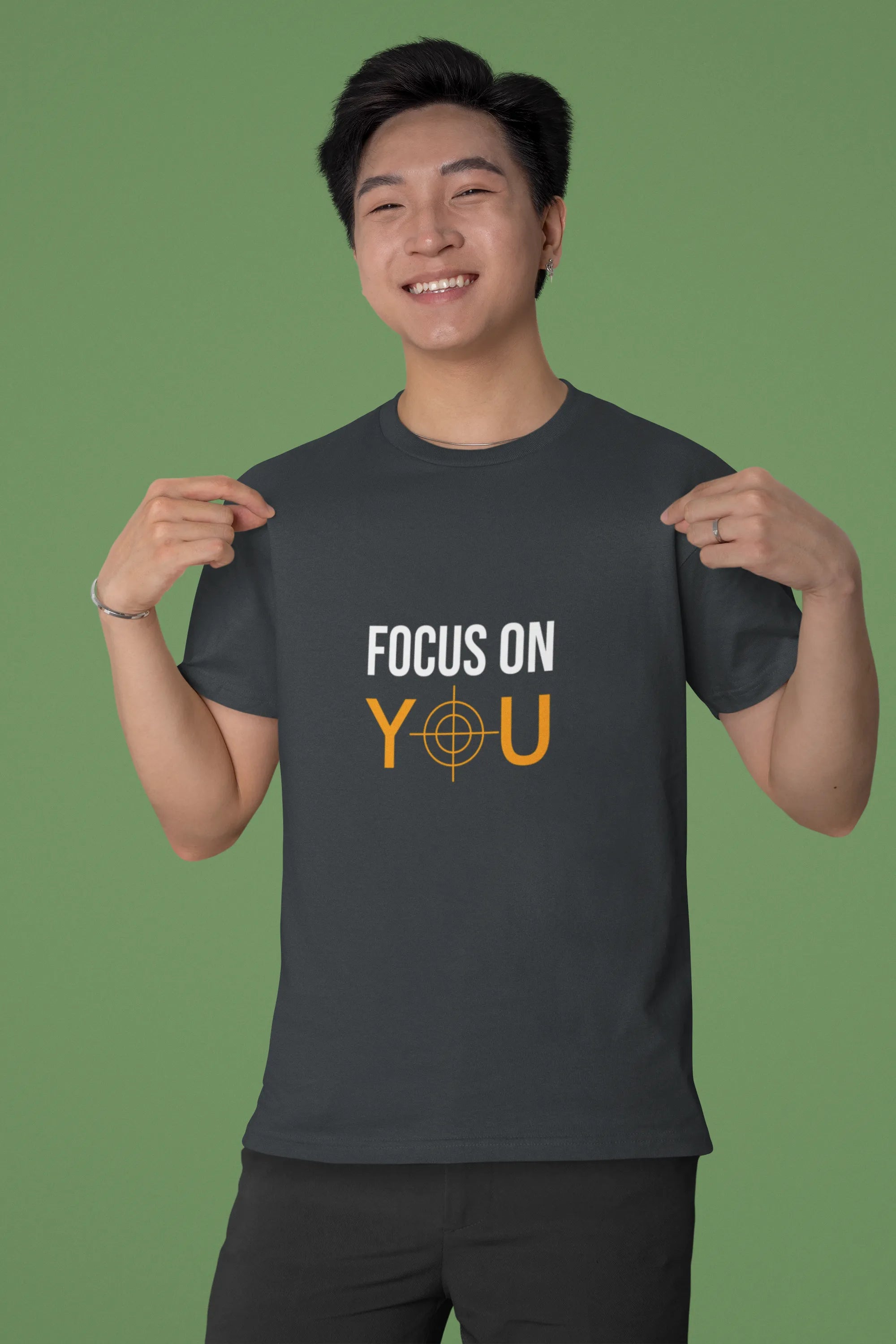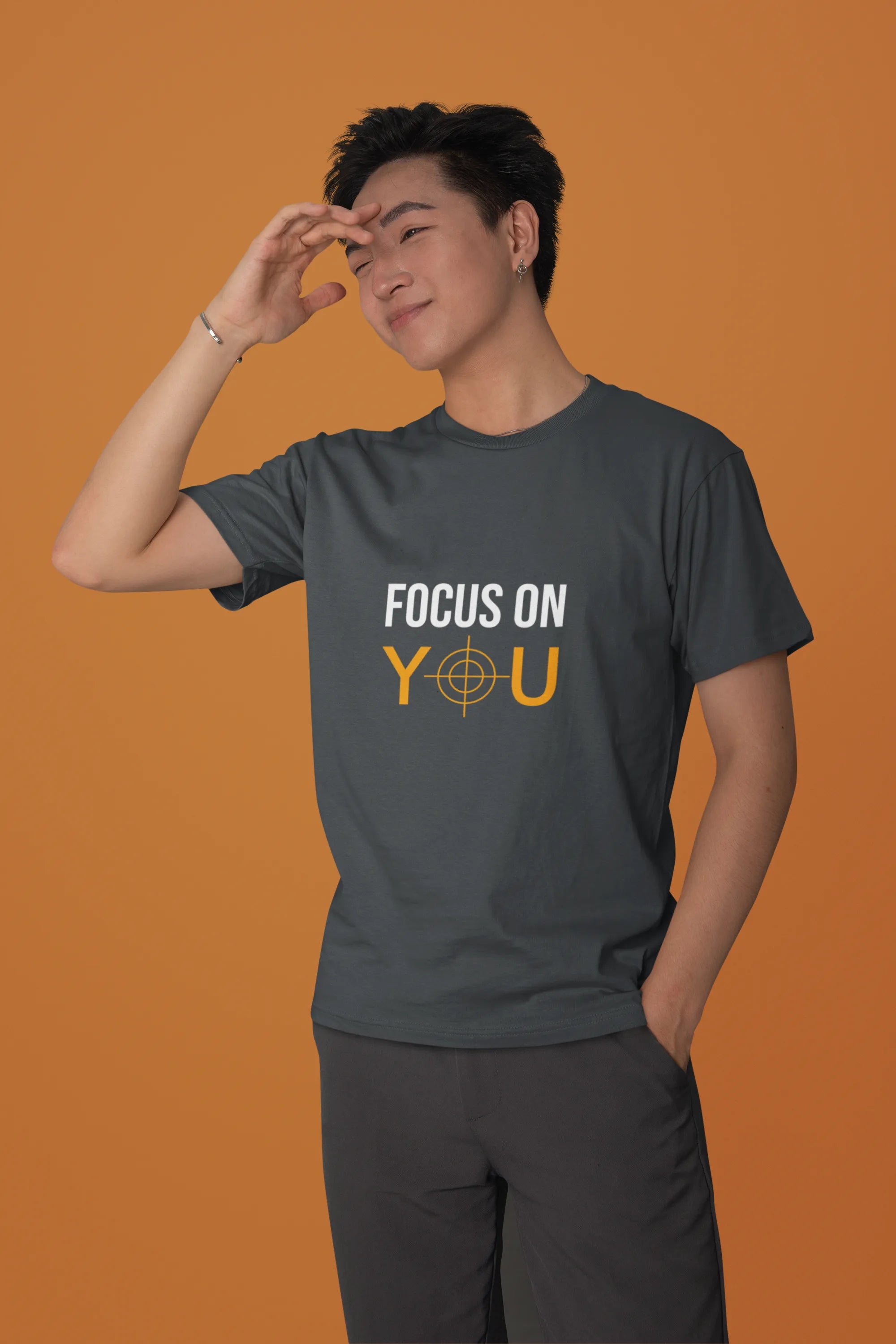 T-shirt with 'Focus on You' text, jeans, and sneakers on a stand against a textured wall.