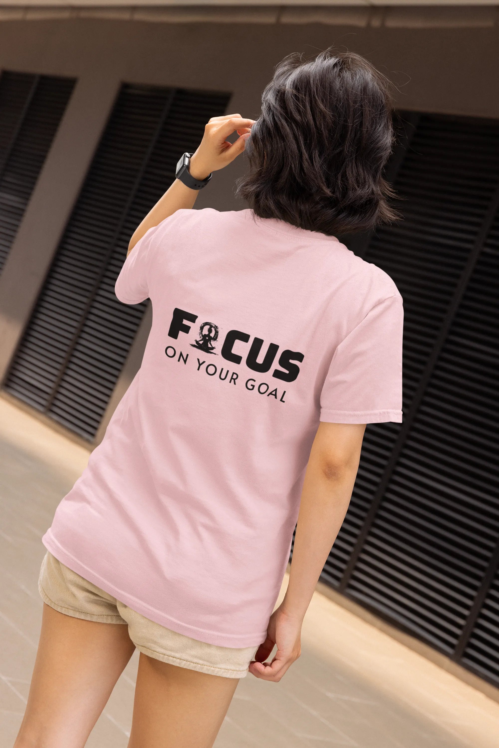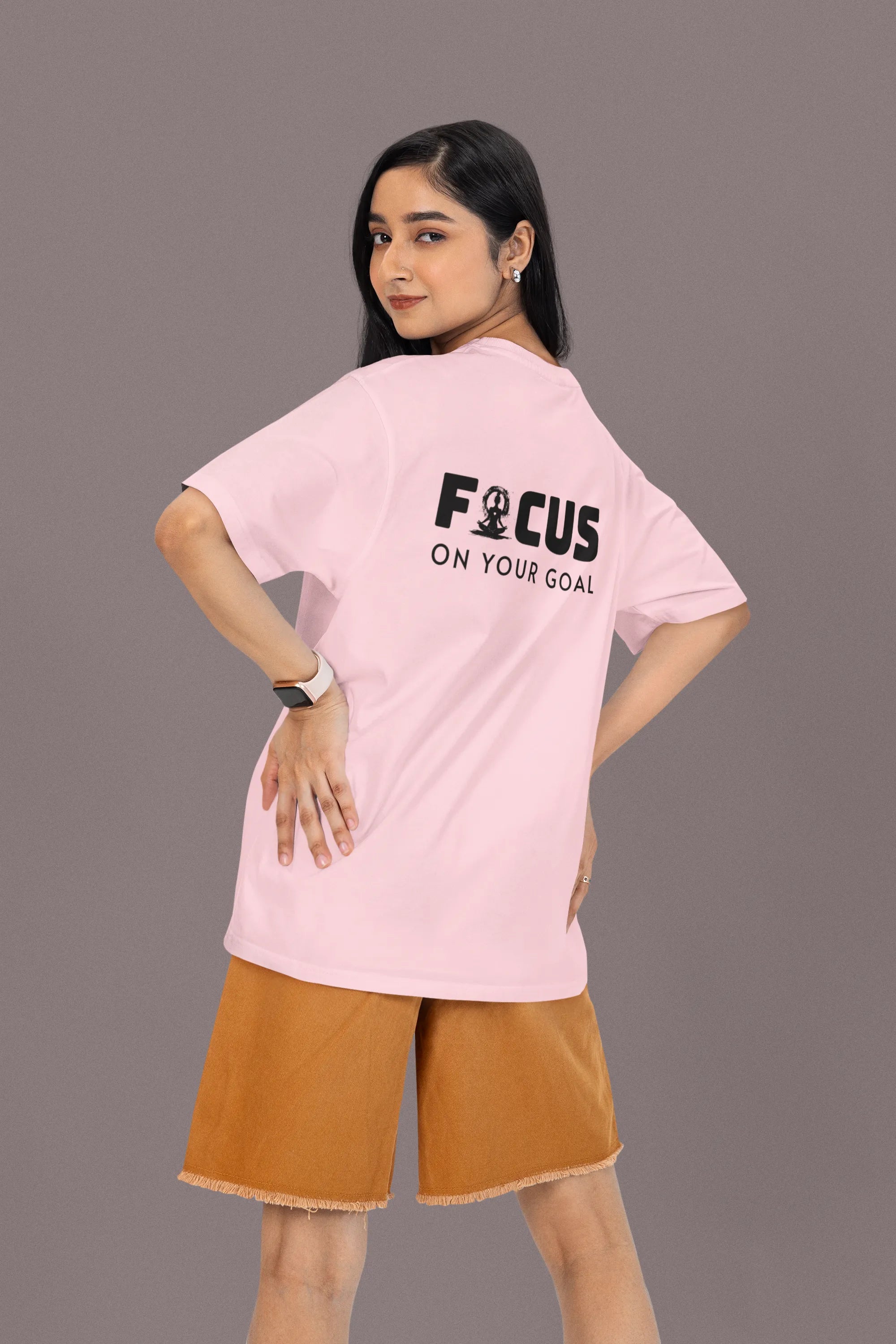 Person wearing a pink t-shirt with 'FOCUS ON YOUR GOAL' text on the back against a purple background
