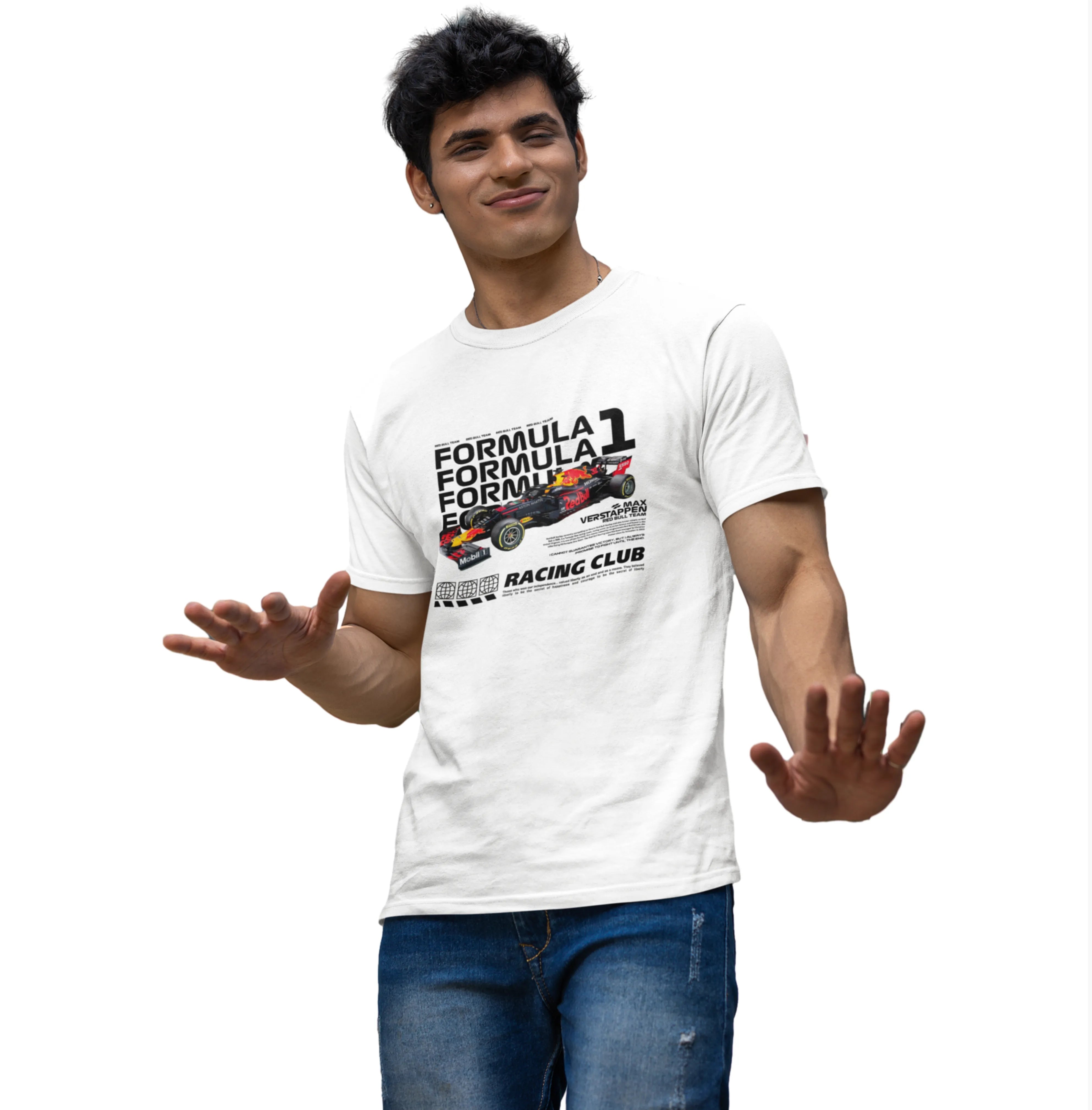Man wearing a white t-shirt with Formula 1 graphics on a white background