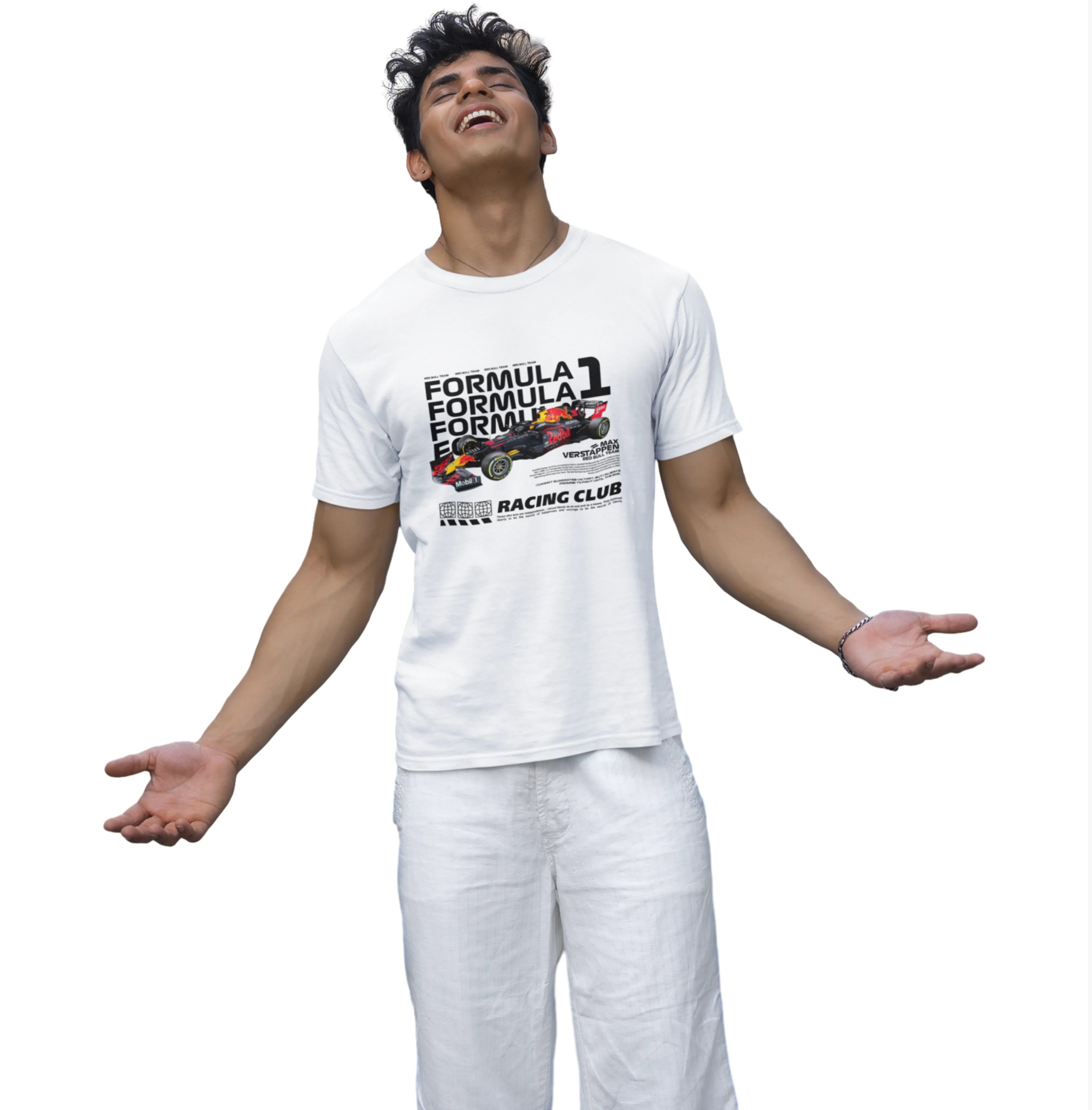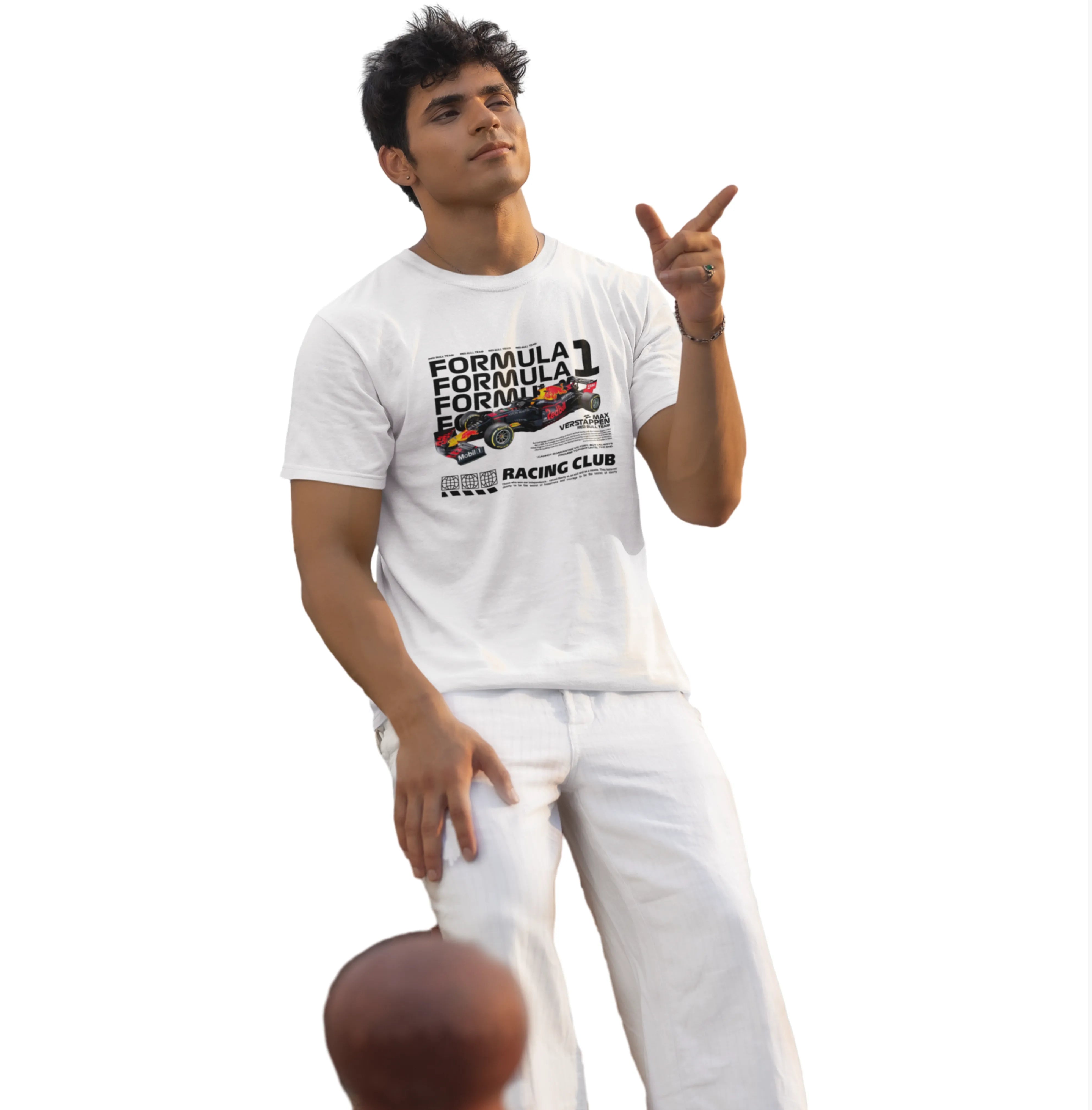 Man wearing a white t-shirt with Formula 1 graphics on a white background