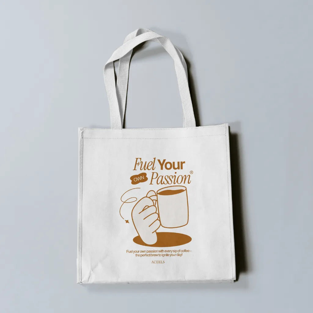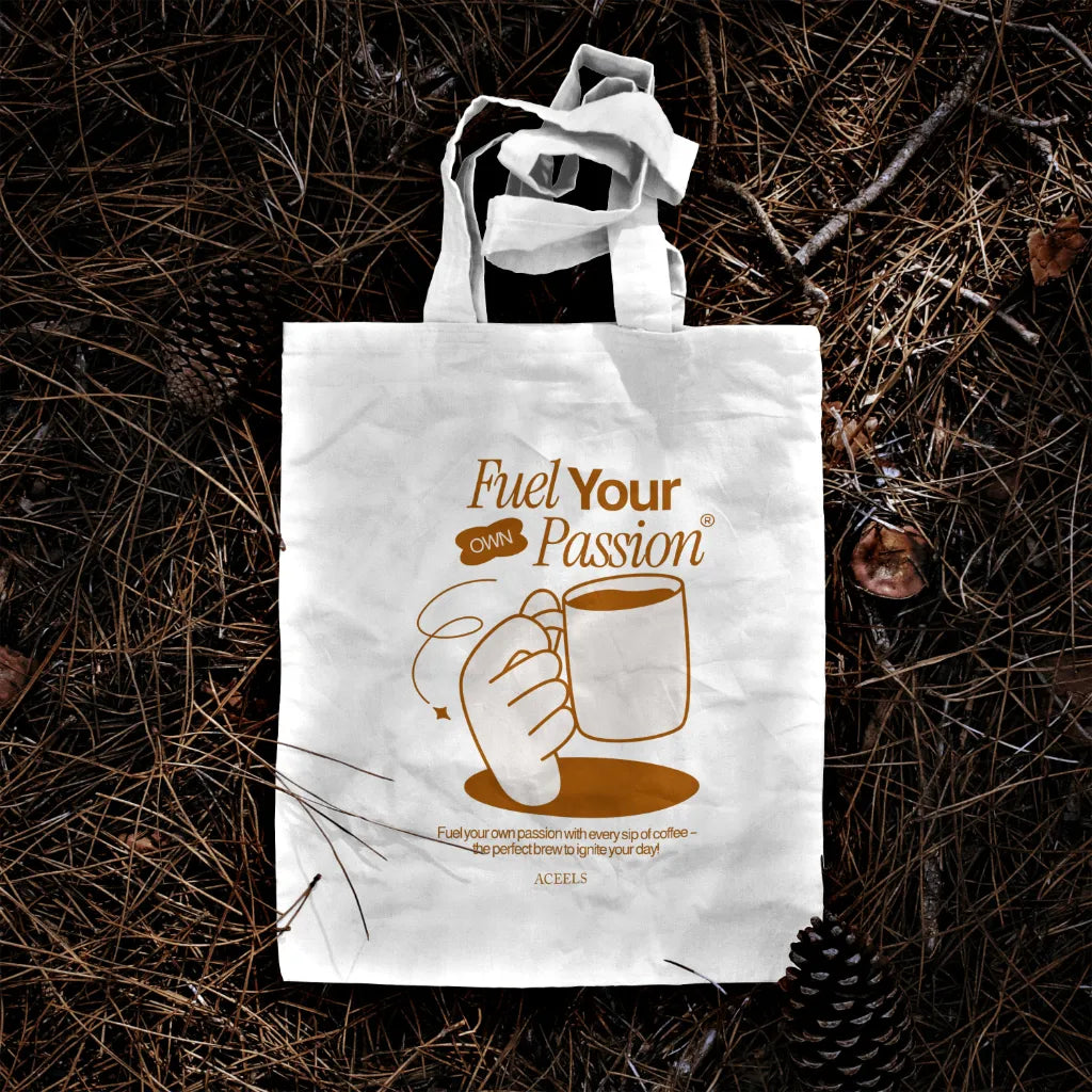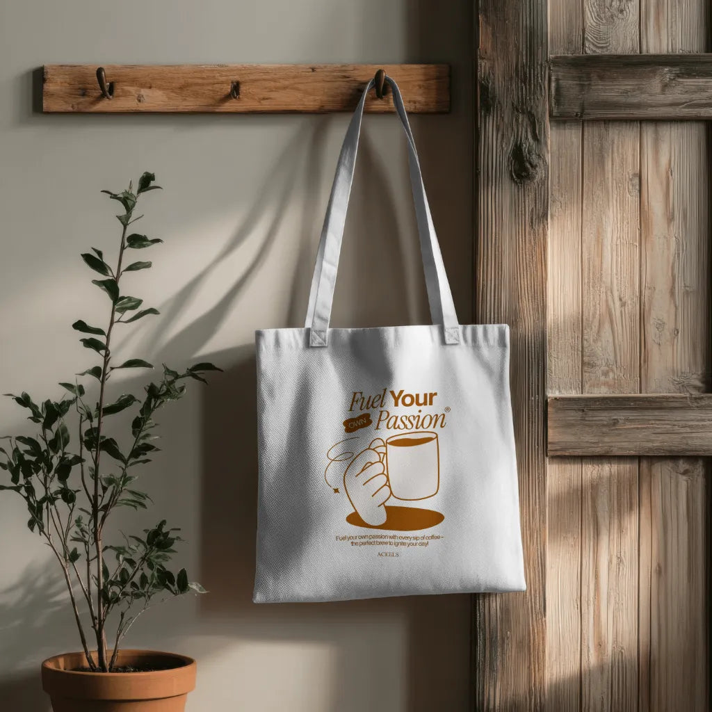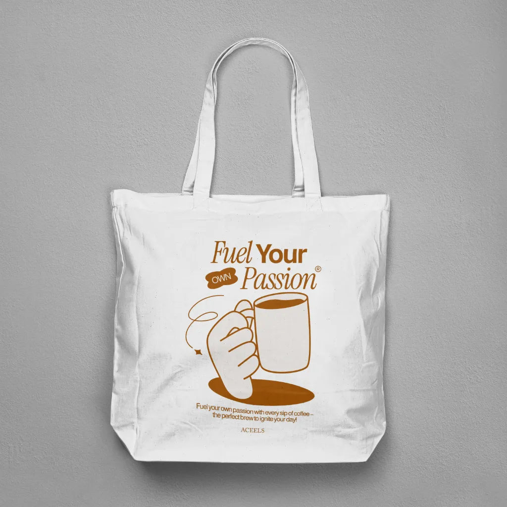 The "Fuel Your Own Passion" tote bag design features bold, motivational typography with dynamic, artistic elements like flames, brush strokes, or energetic patterns. Set in vibrant or minimalist tones, it inspires self-motivation and creativity. Perfect for dreamers and go-getters, this tote is a stylish reminder to chase your passion.