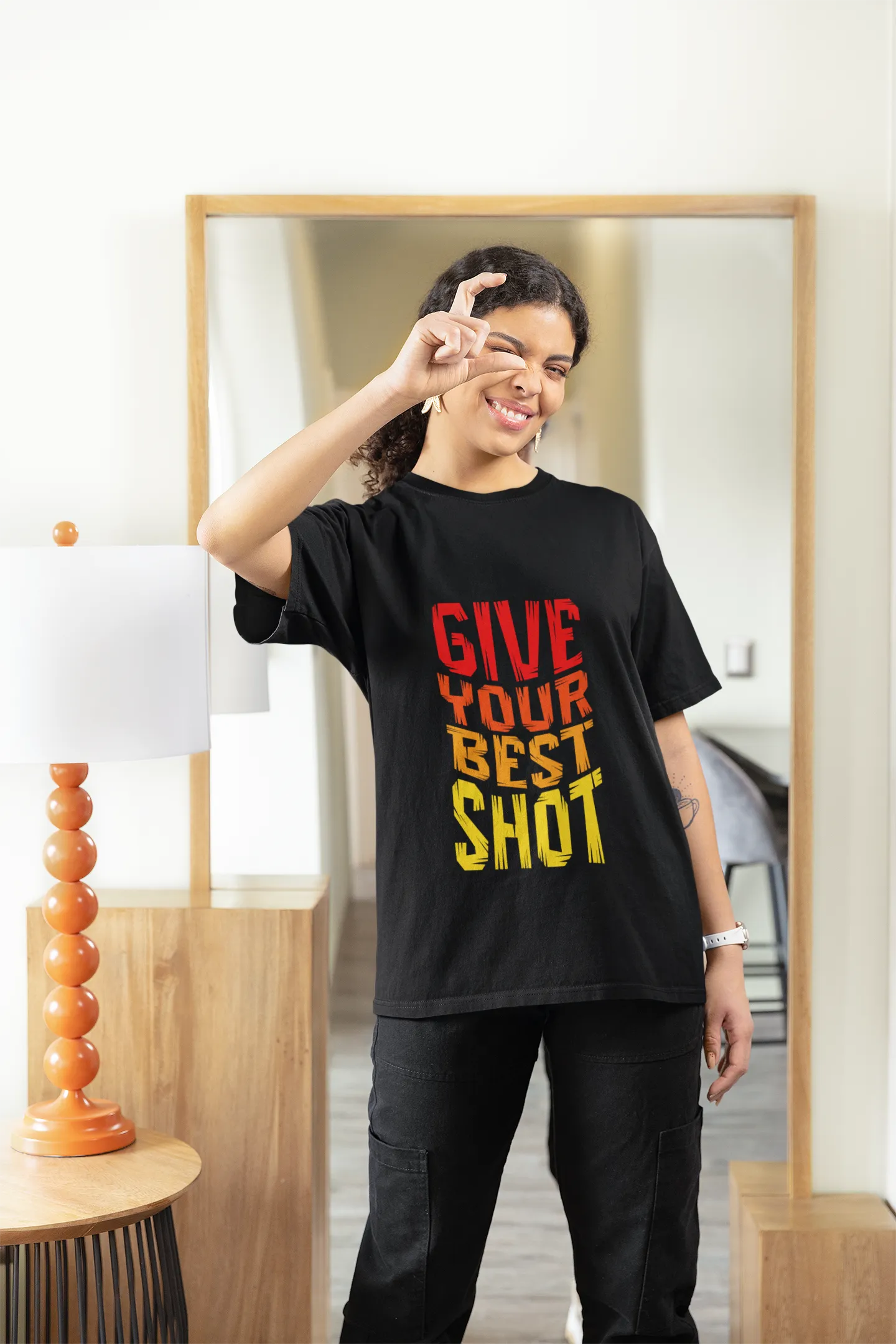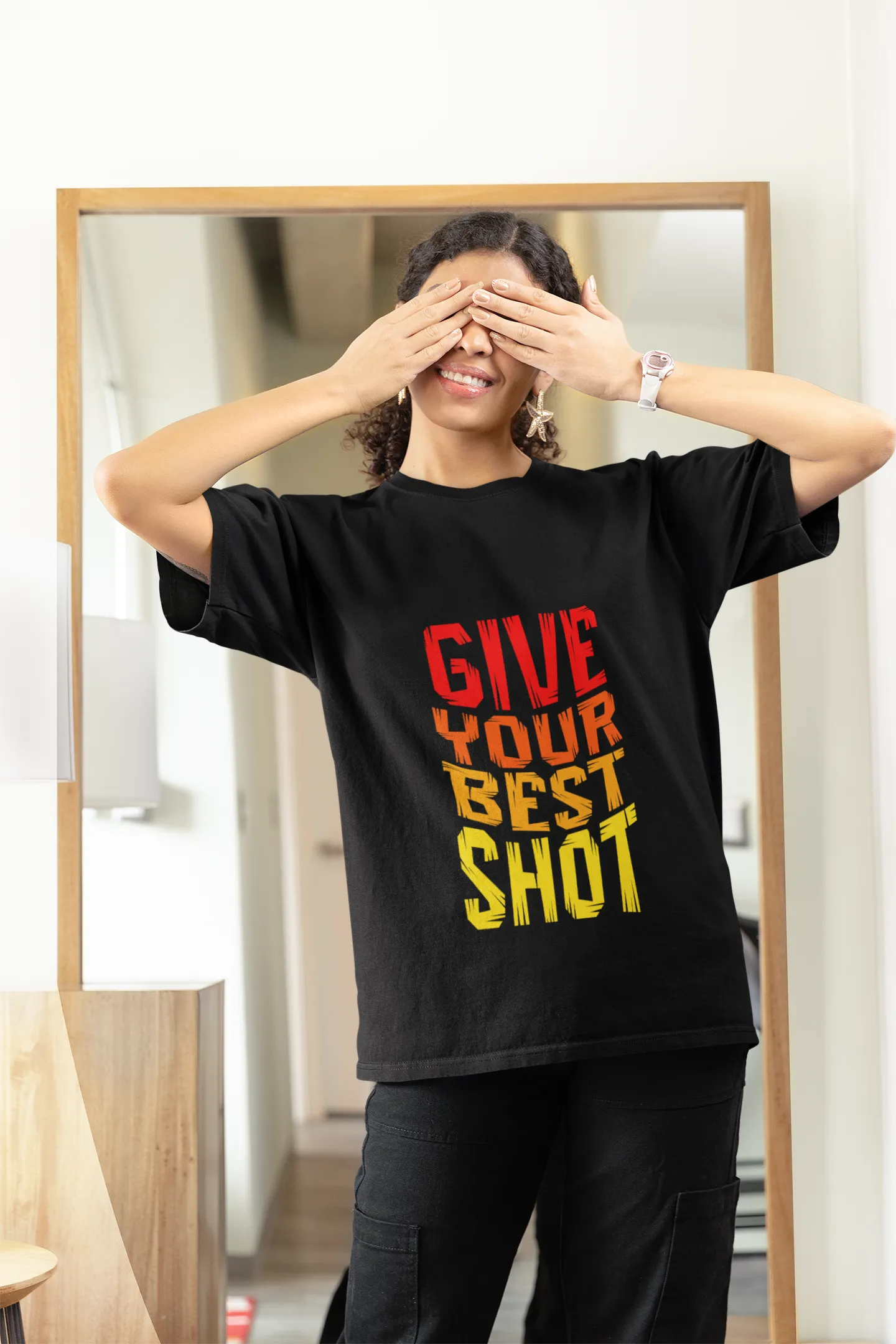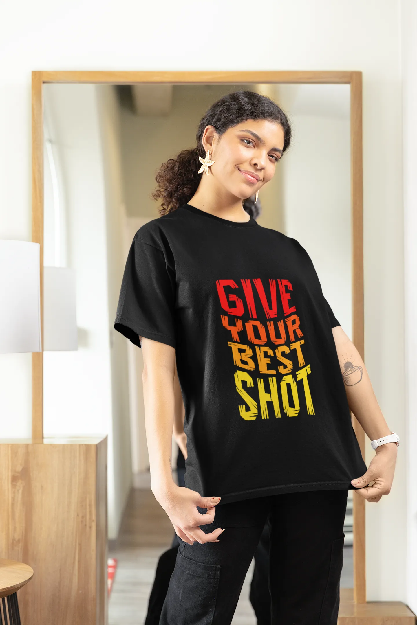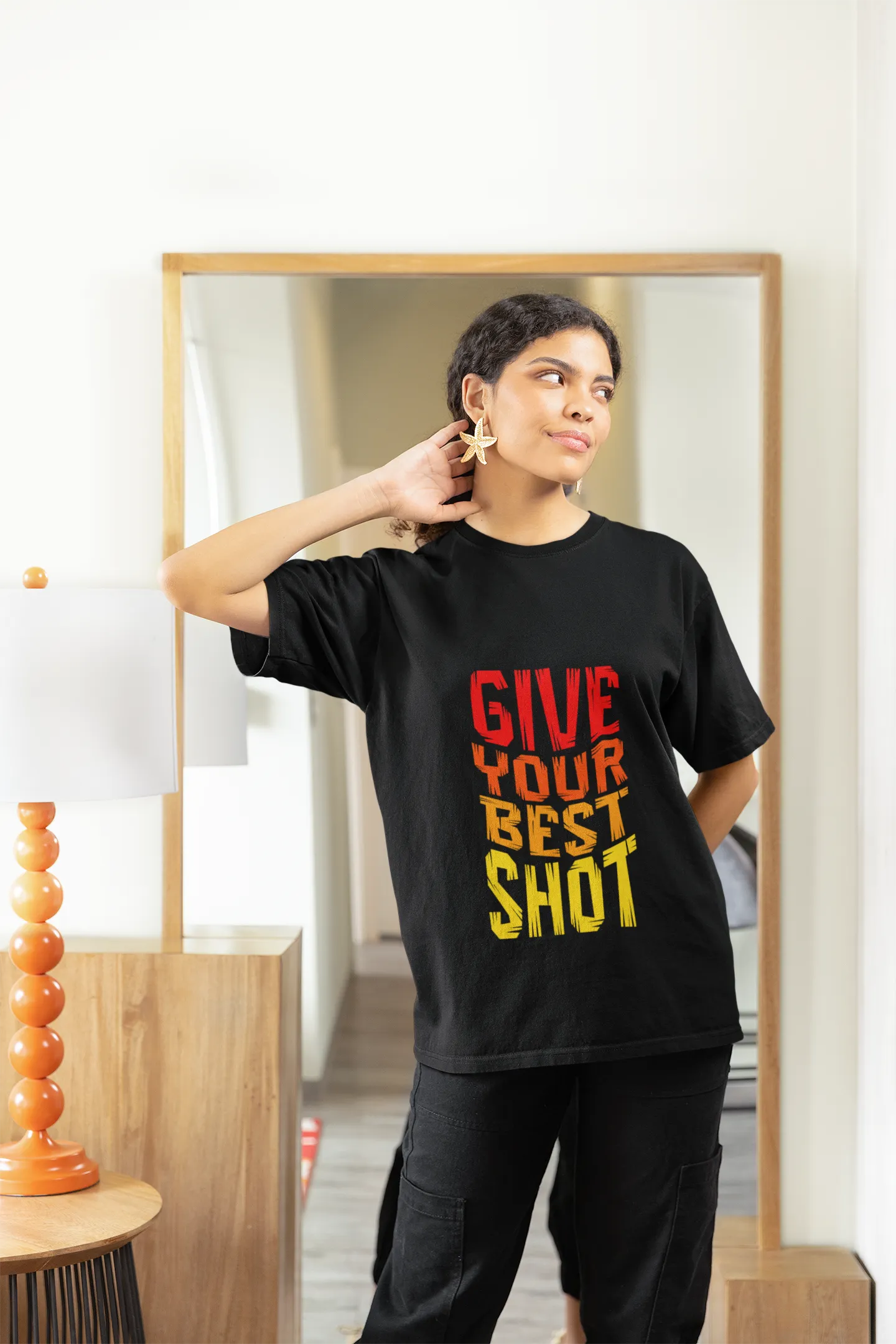 A bold and energetic T-shirt design featuring the phrase “Give Your Best Shot” in dynamic, action-packed typography. Enhanced with target icons, arrows, or burst graphics, it symbolizes determination, effort, and taking bold chances — perfect for athletes, dreamers, and anyone aiming high.