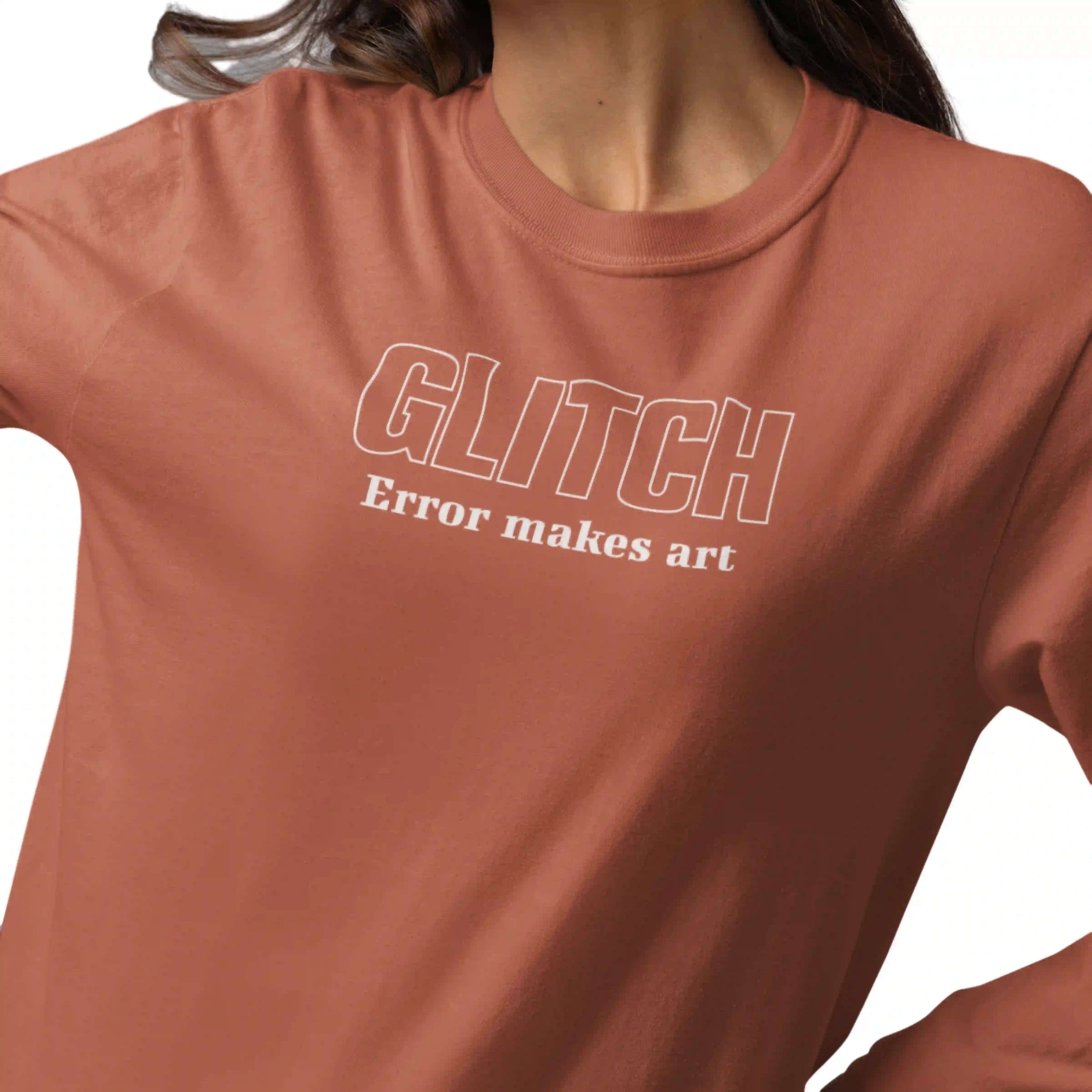 Woman wearing a brown long-sleeve shirt with 'GLITCH Error makes art' text on a white background