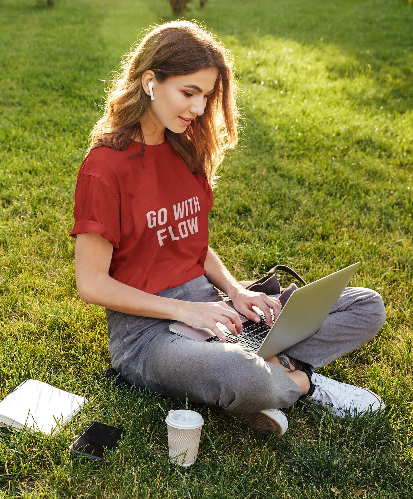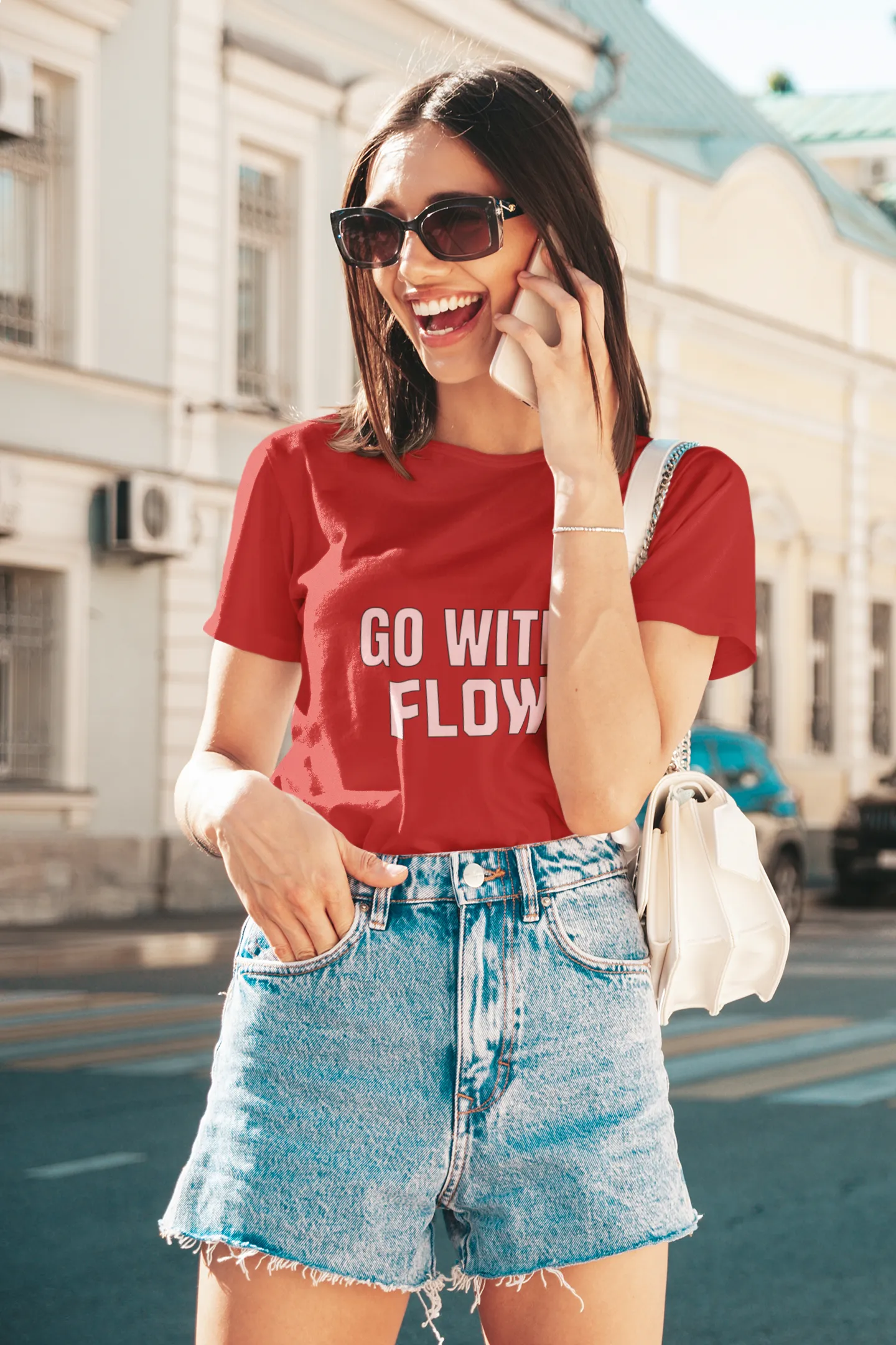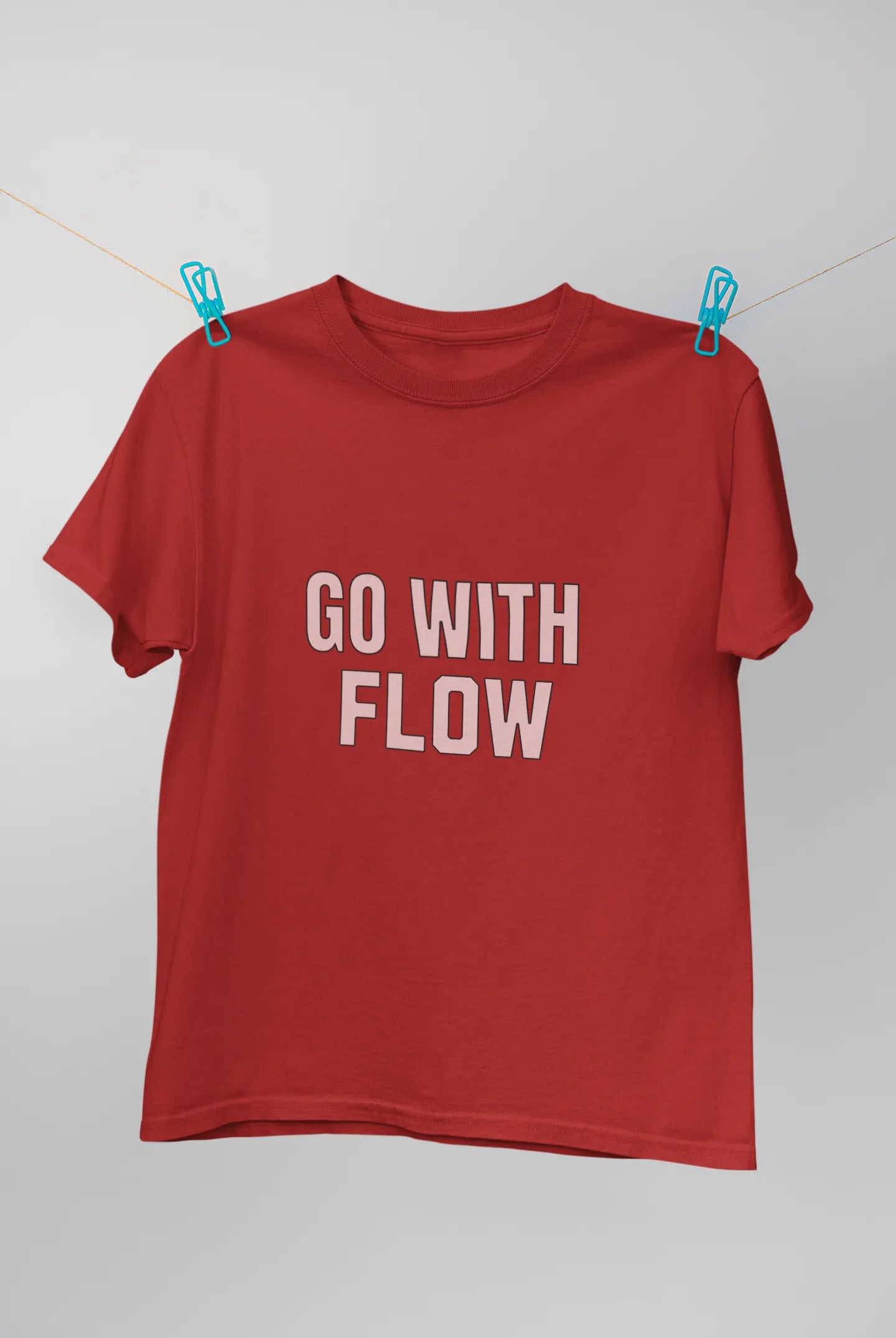 A minimalist t-shirt design featuring the phrase "Go with the Flow" in elegant, wavy typography. Soft colors and fluid lines evoke calmness and freedom, making it perfect for those who embrace life's rhythm with grace and ease.