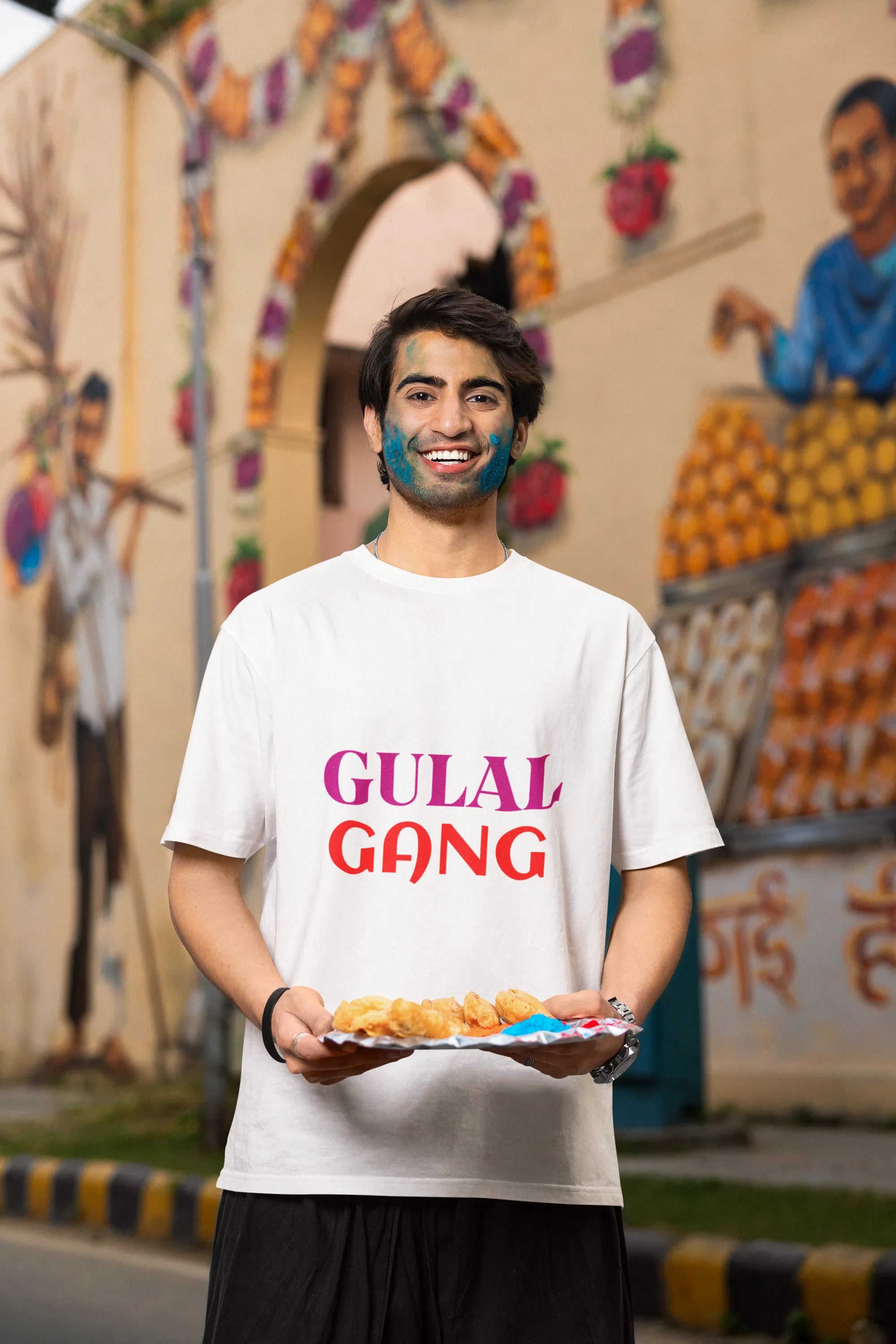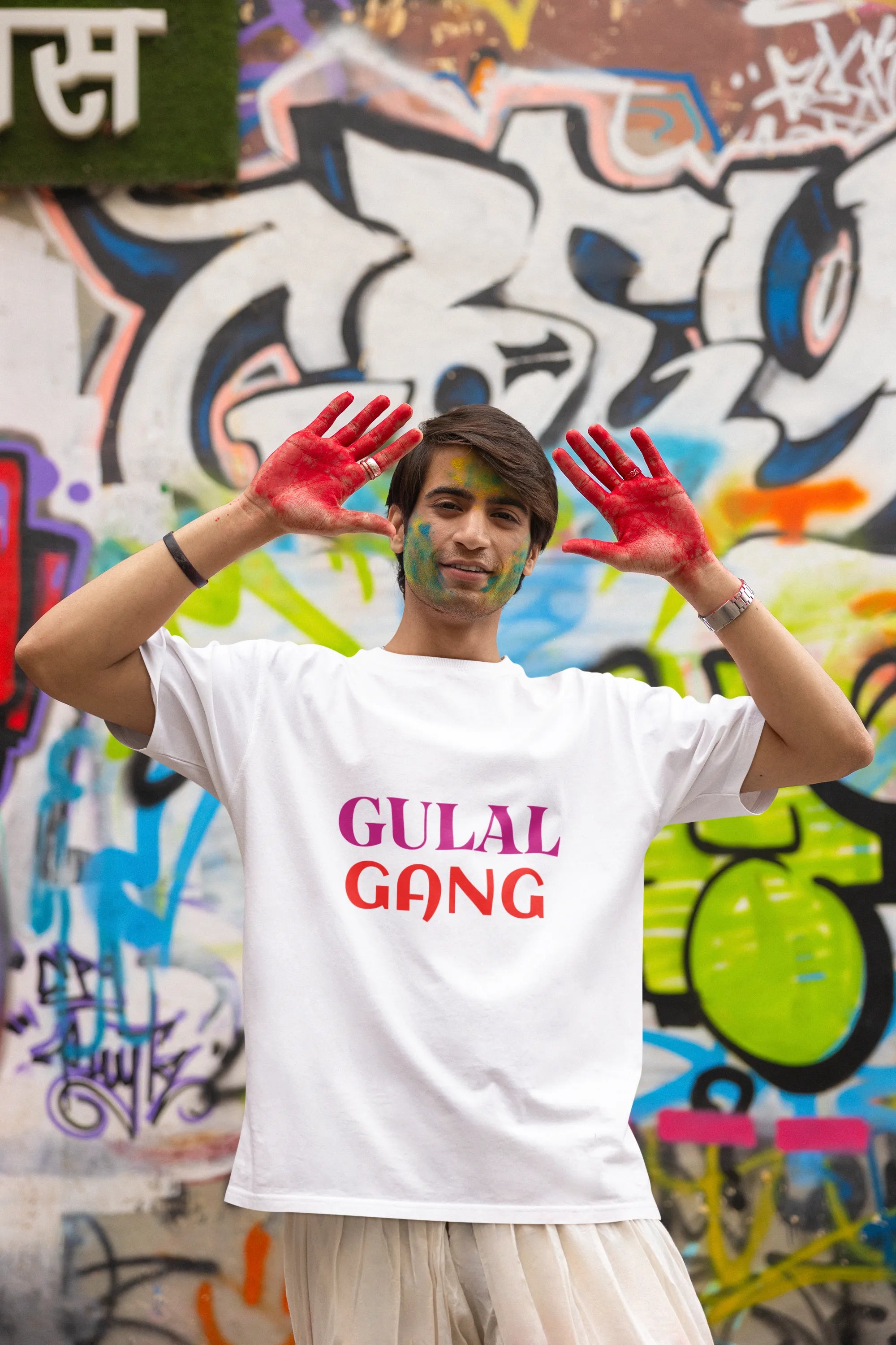 The "Gulal Gang" T-shirt design bursts with vibrant Holi colors, featuring splashes of gulal in bold, festive hues. Playful typography and dynamic artwork capture the energy of celebration, unity, and joy. Perfect for Holi lovers, this tee radiates fun, friendship, and the spirit of togetherness.