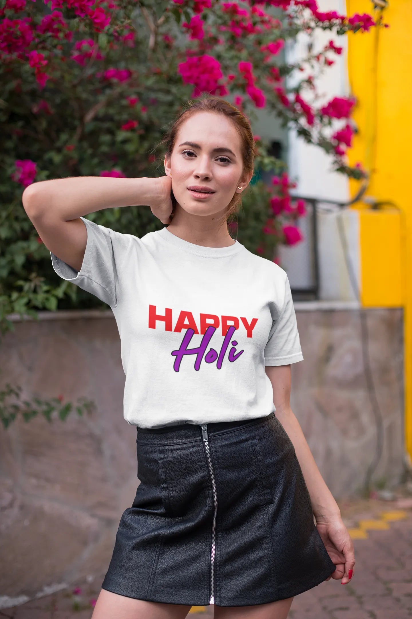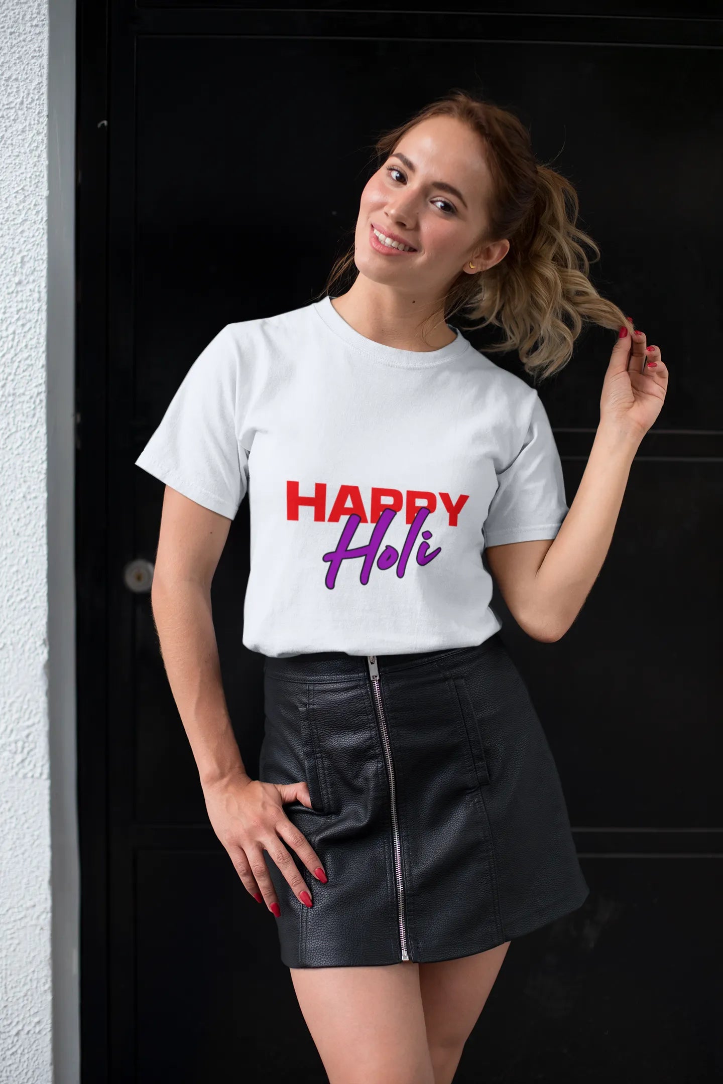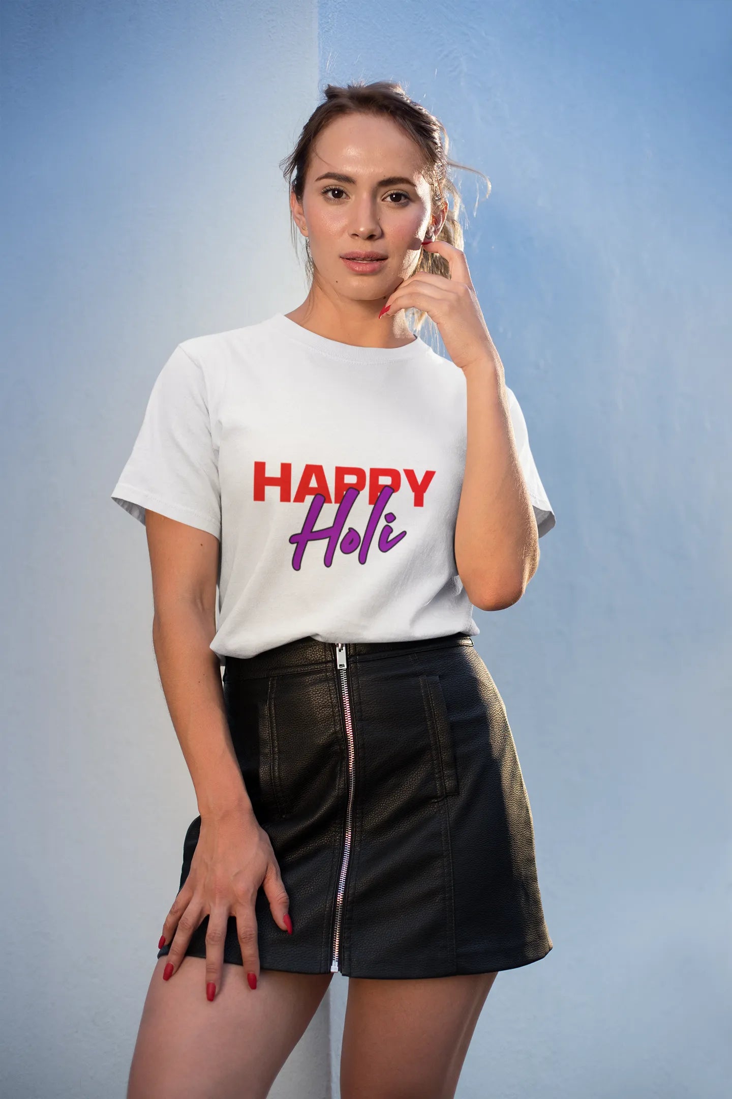 The "Happy Holi" T-shirt design bursts with vibrant splashes of color, symbolizing the festival's joy and energy. Playful typography, handprints, or gulal effects enhance the festive vibe. Perfect for celebrating Holi in style, it reflects happiness, unity, and the spirit of togetherness.