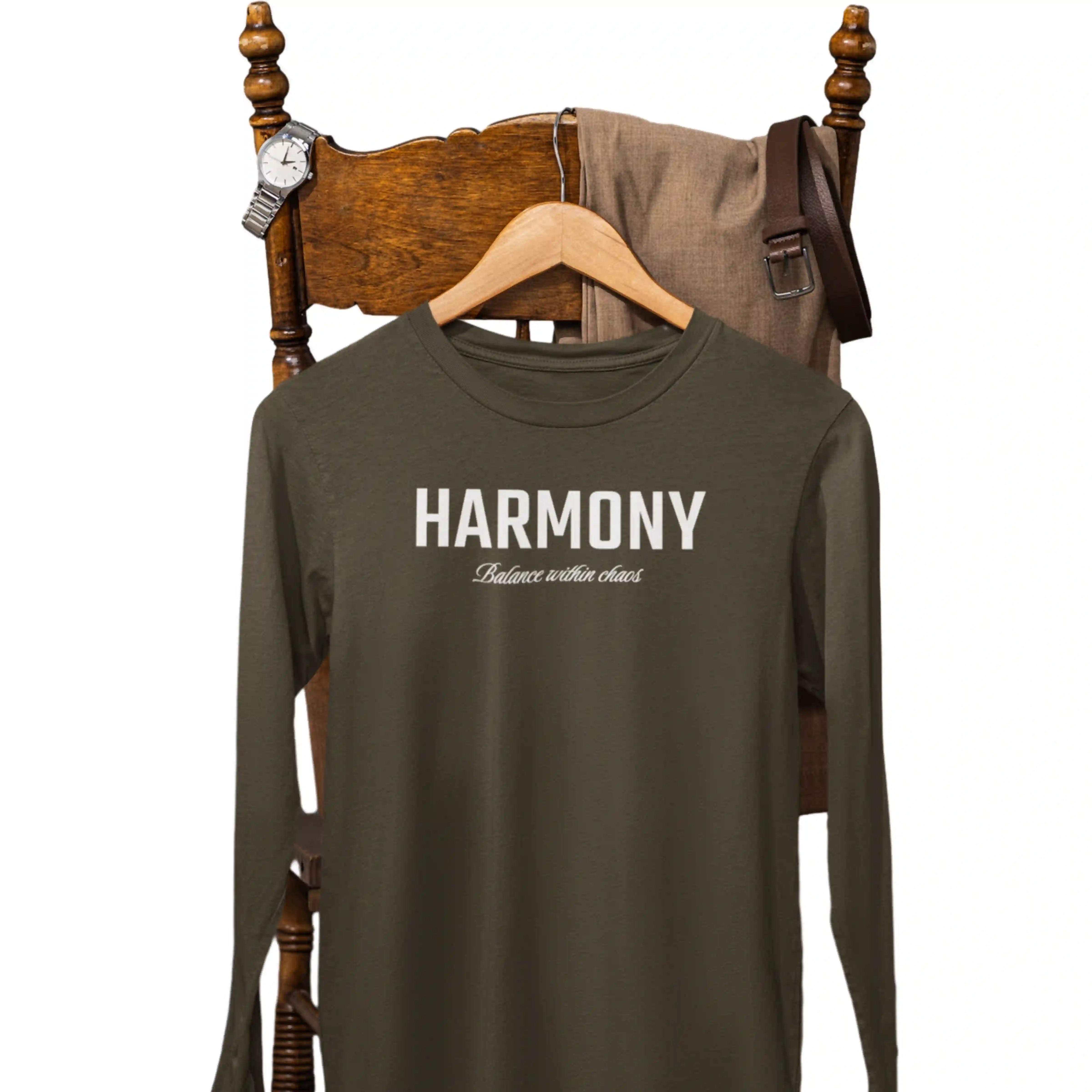 Balance your energy with the 'Harmony' olive green T-shirt — a symbol of peace, nature, and perfect coordination in style and spirit.