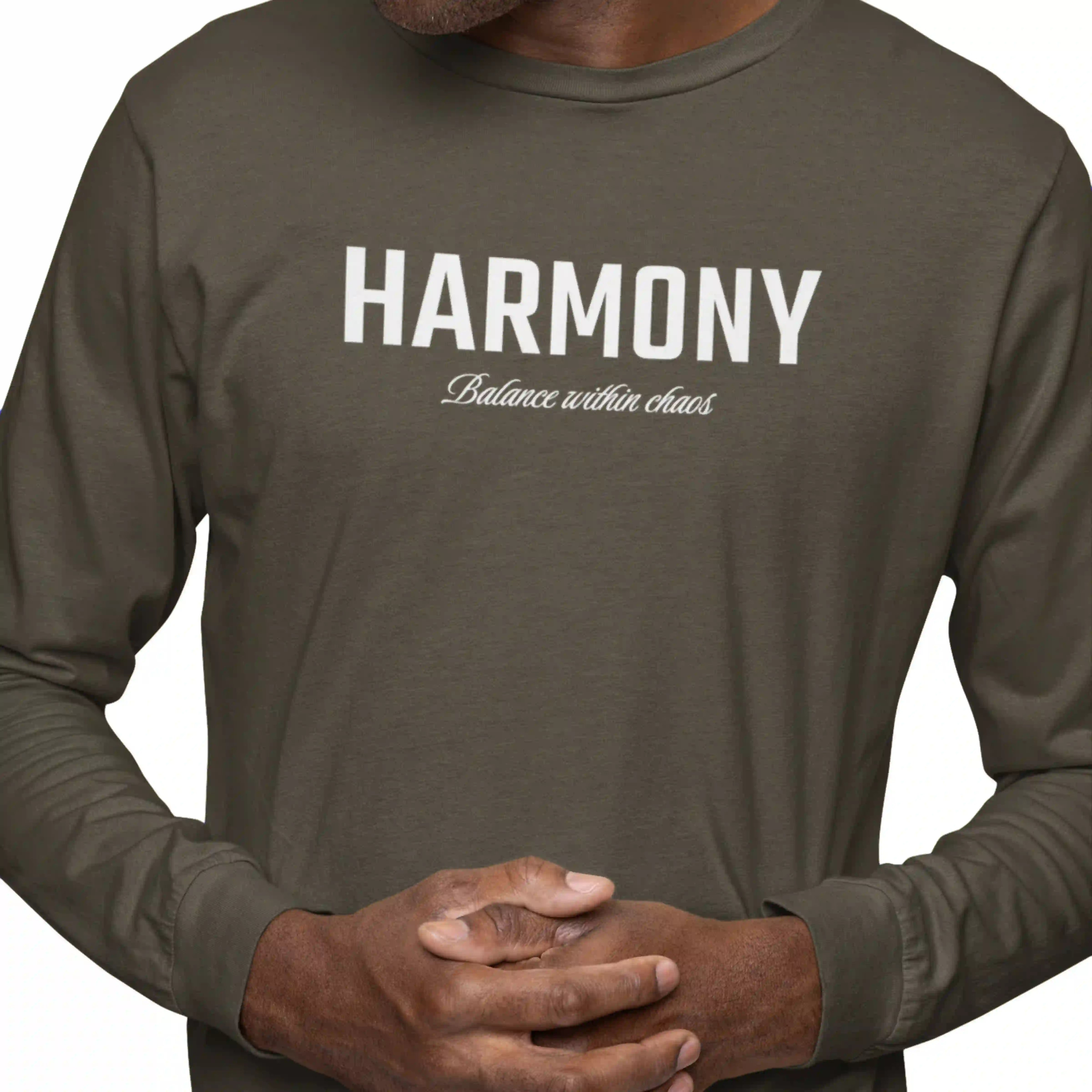 Man wearing a green long-sleeve shirt with 'HARMONY' printed on it against a white background
