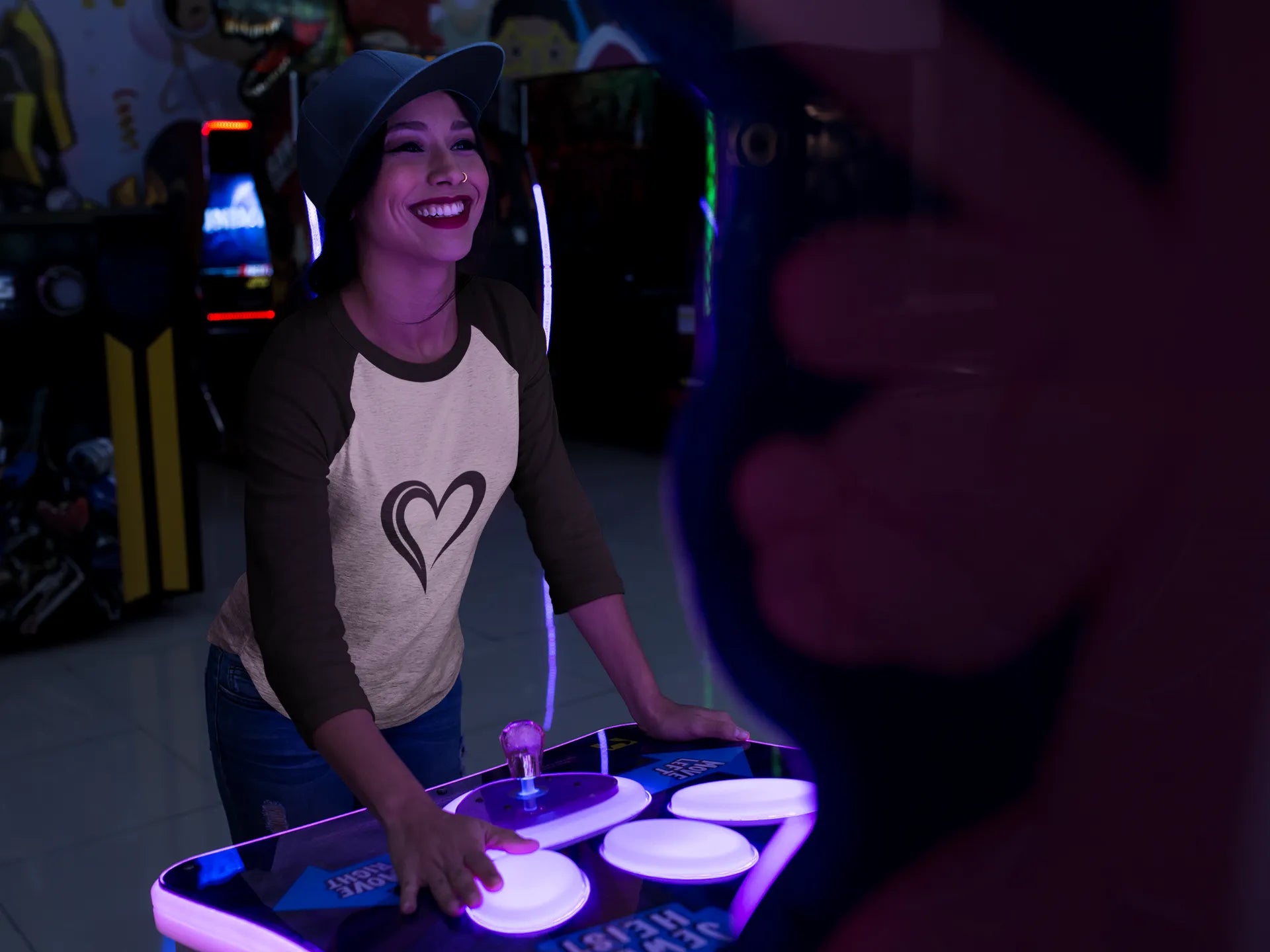 Woman wearing a shirt with a heart design in a colorful, possibly amusement park setting.