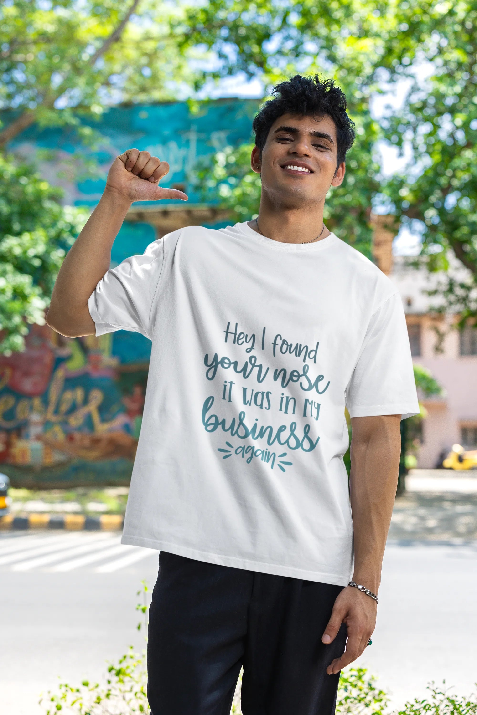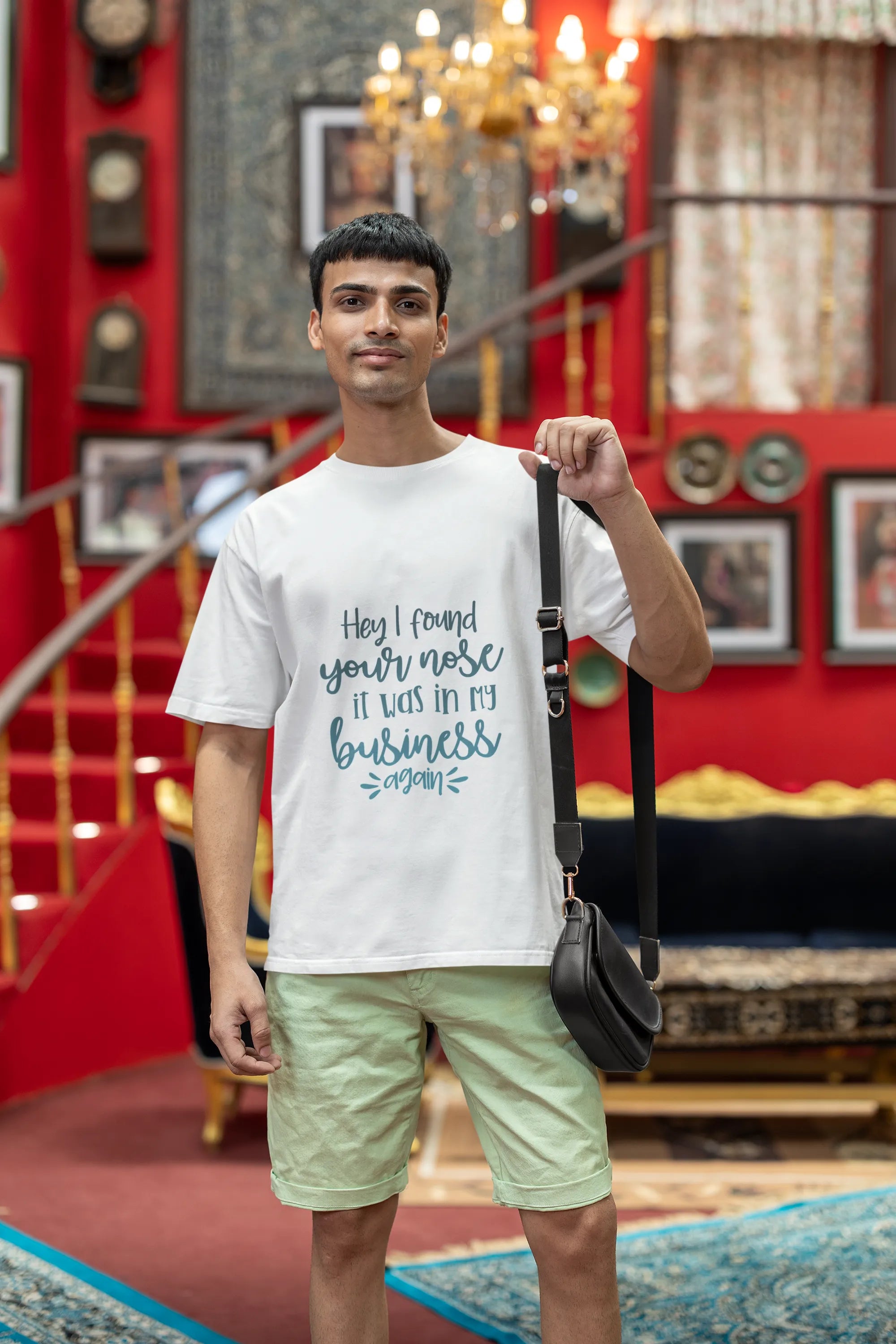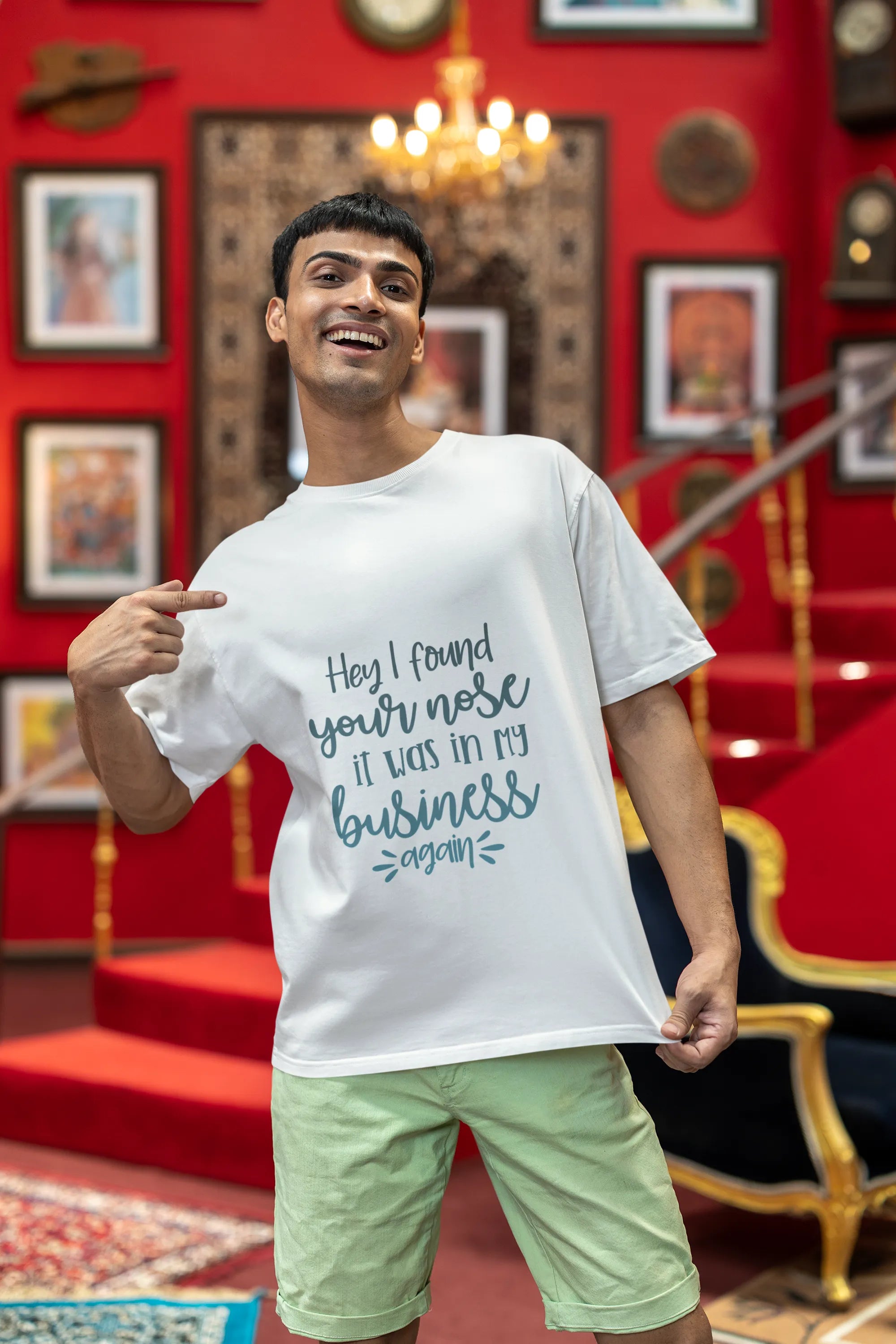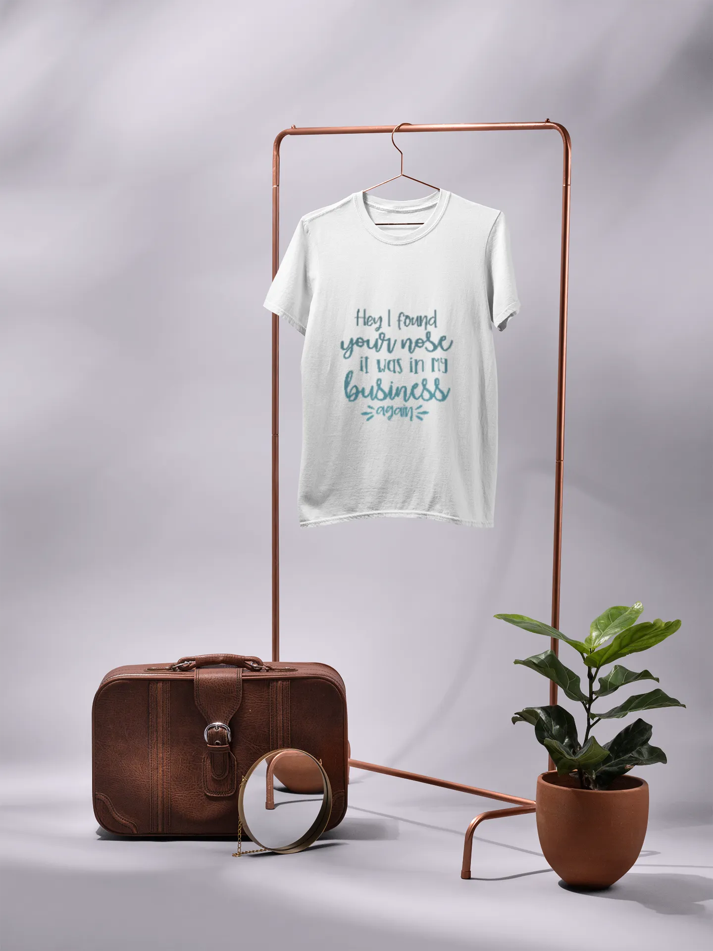A bold and cheeky T-shirt design featuring the phrase "Hey, I found your nose. It was in my business again," styled in playful typography. Perfect for making a sassy statement and setting boundaries with a hint of humor.