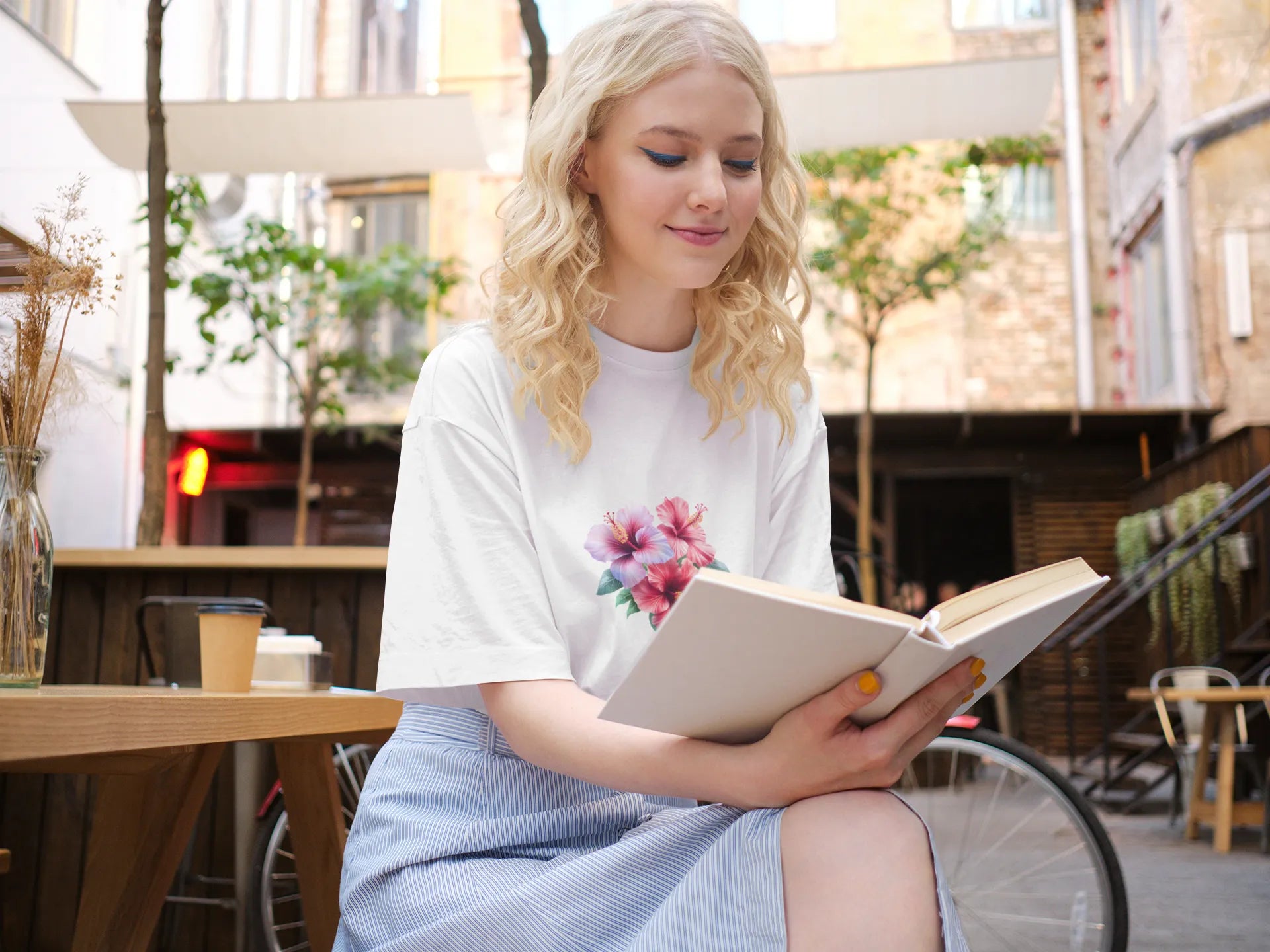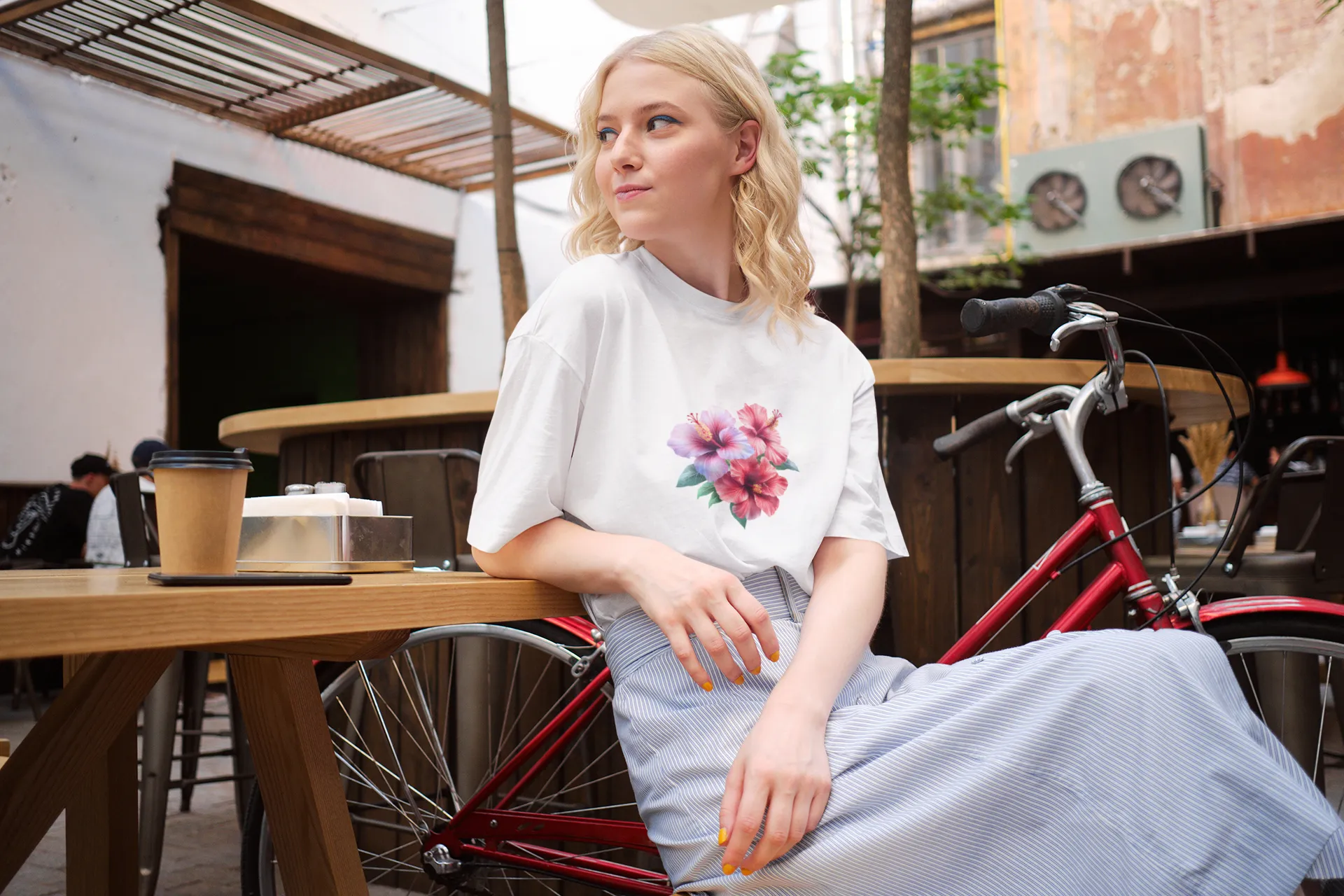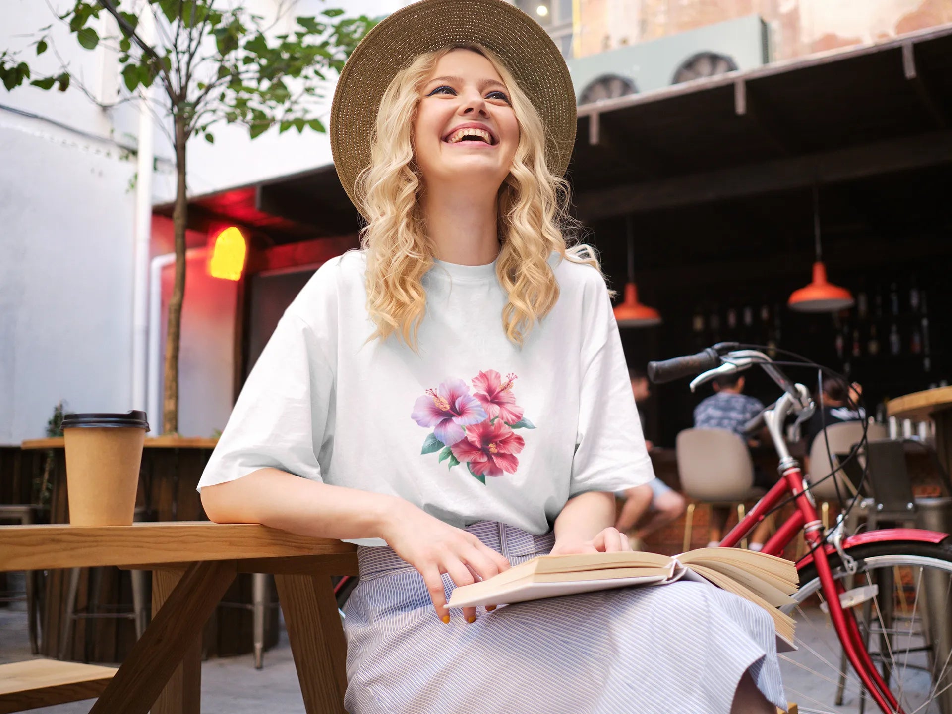 This vibrant t-shirt design features a bold hibiscus flower, symbolizing beauty and tropical vibes. With intricate petal details and a splash of color, it brings a refreshing, island-inspired aesthetic perfect for casual wear and sunny day outings.