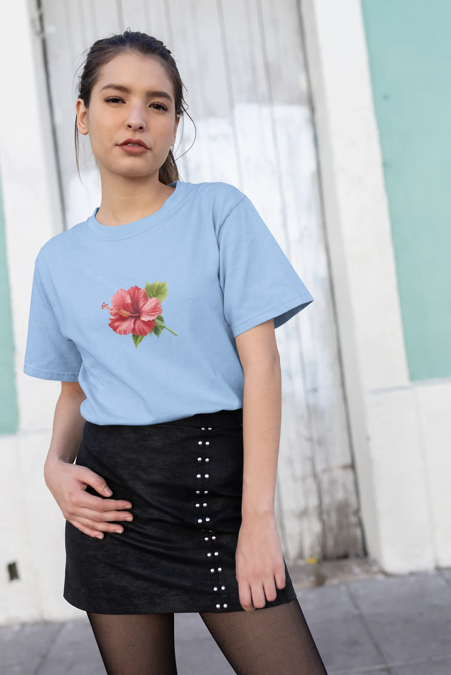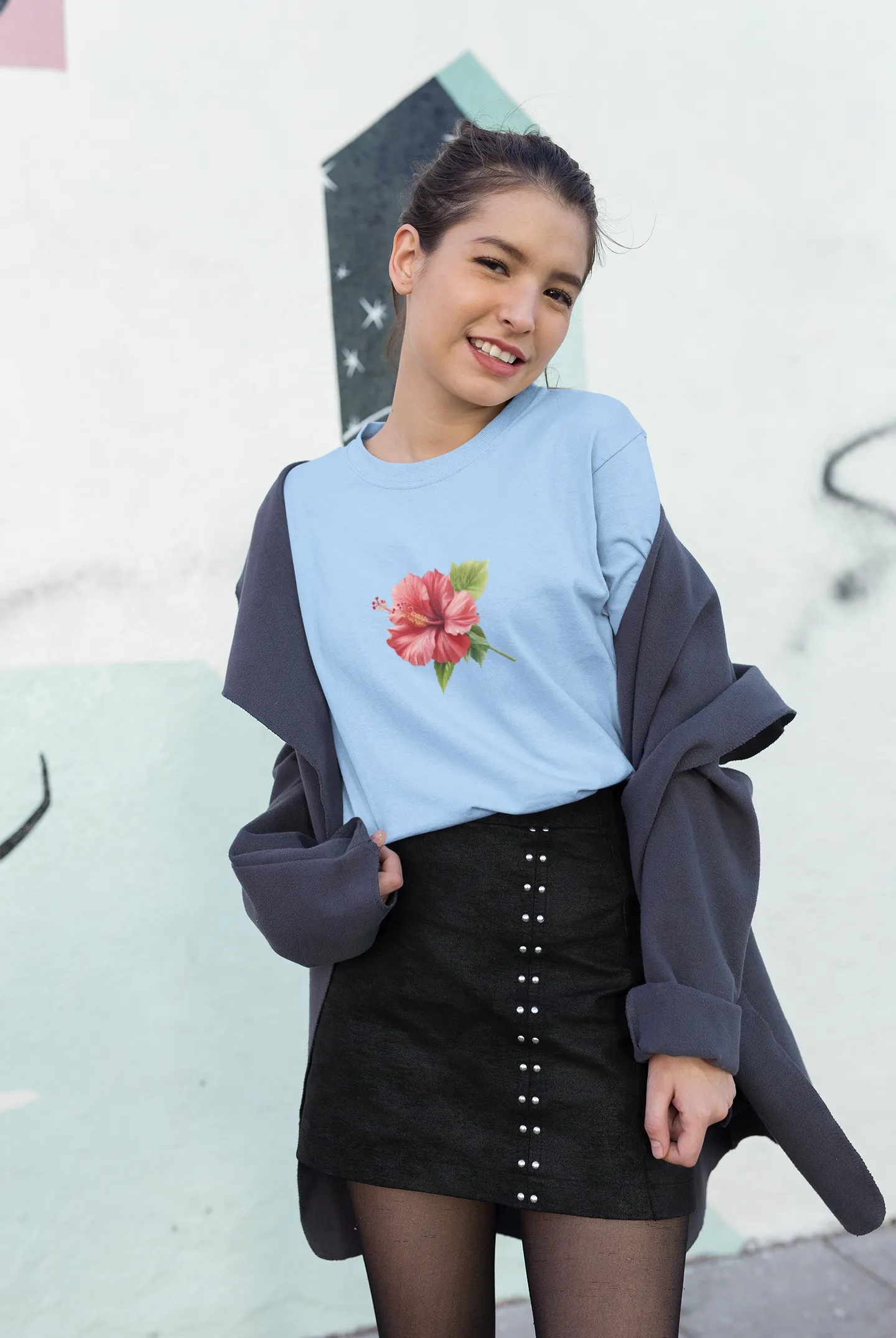 Woman wearing a light blue t-shirt with a floral design and a black hat, standing against a textured wall.