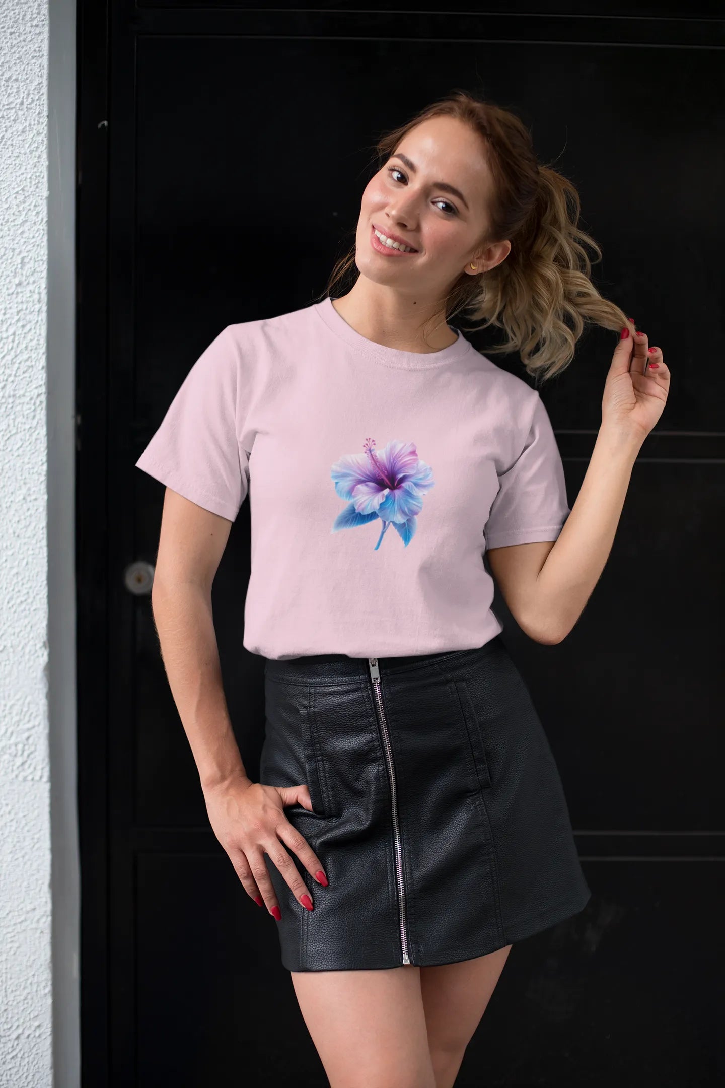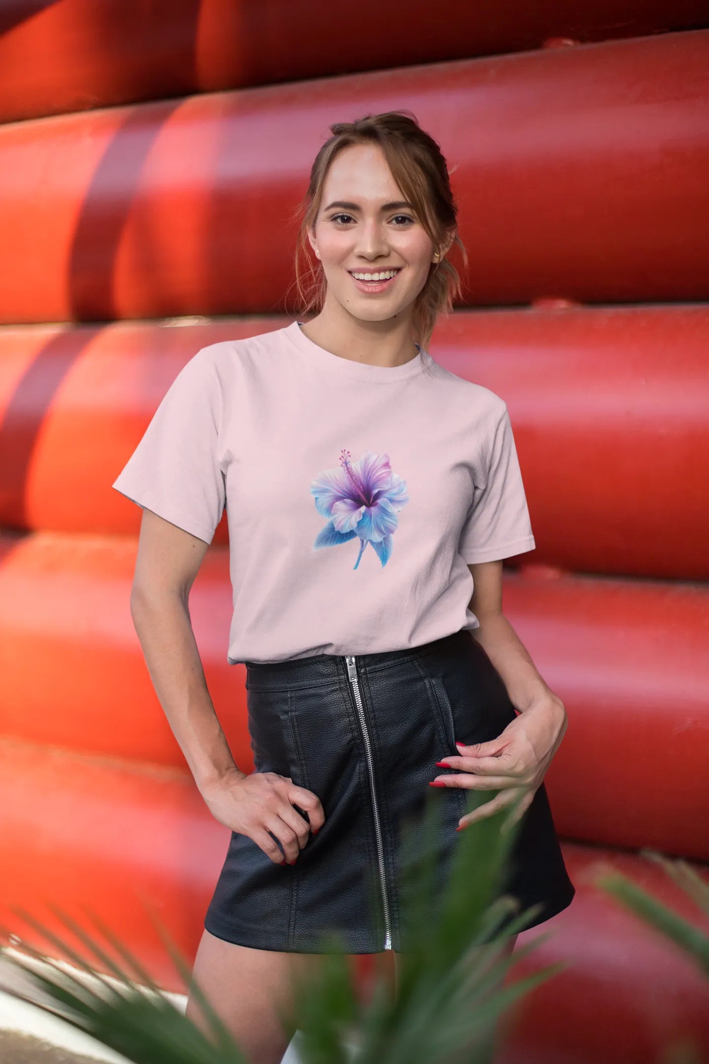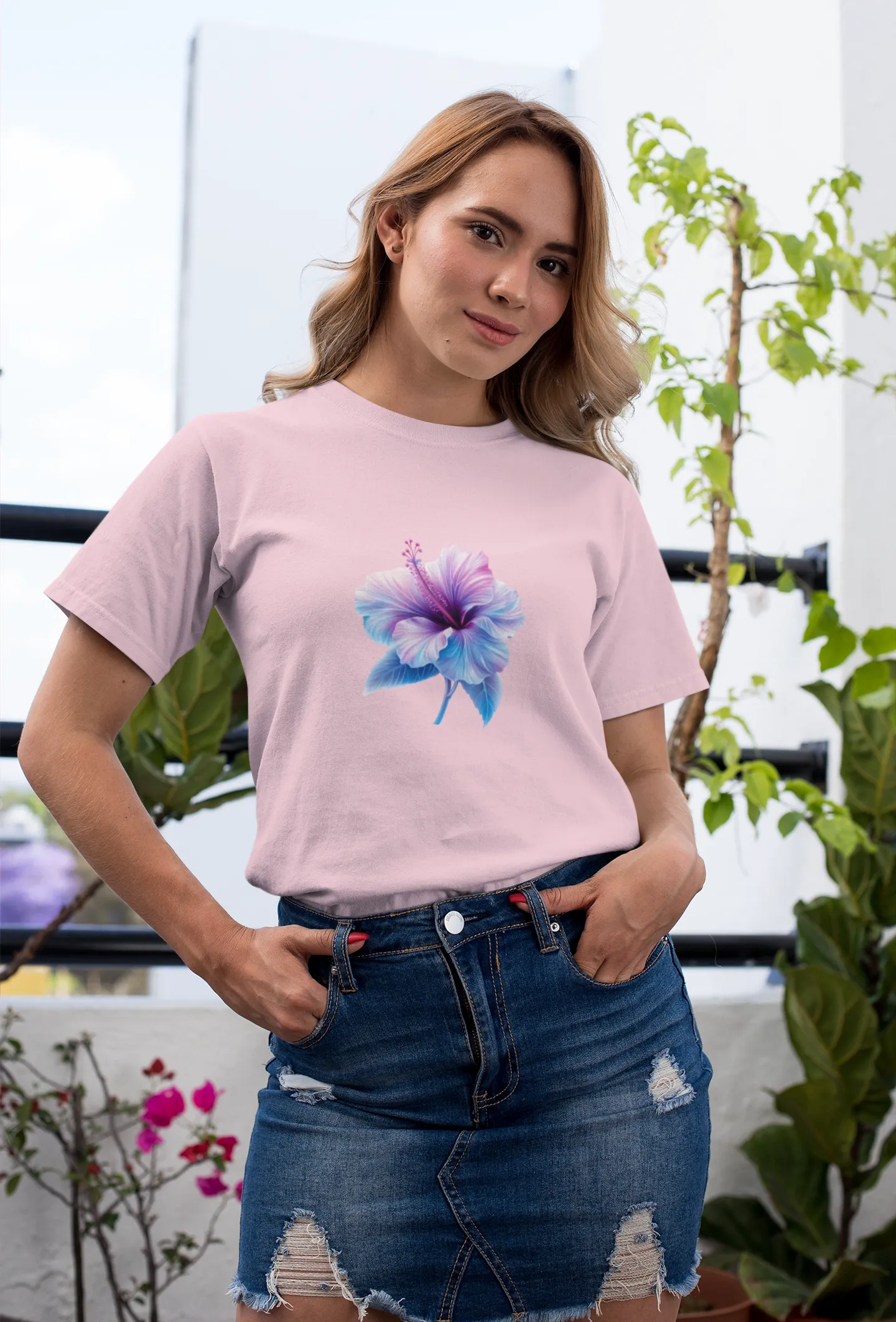 This vibrant t-shirt design features a bold hibiscus flower, symbolizing beauty and tropical vibes. With intricate petal details and a splash of color, it brings a refreshing, island-inspired aesthetic perfect for casual wear and sunny day outings.