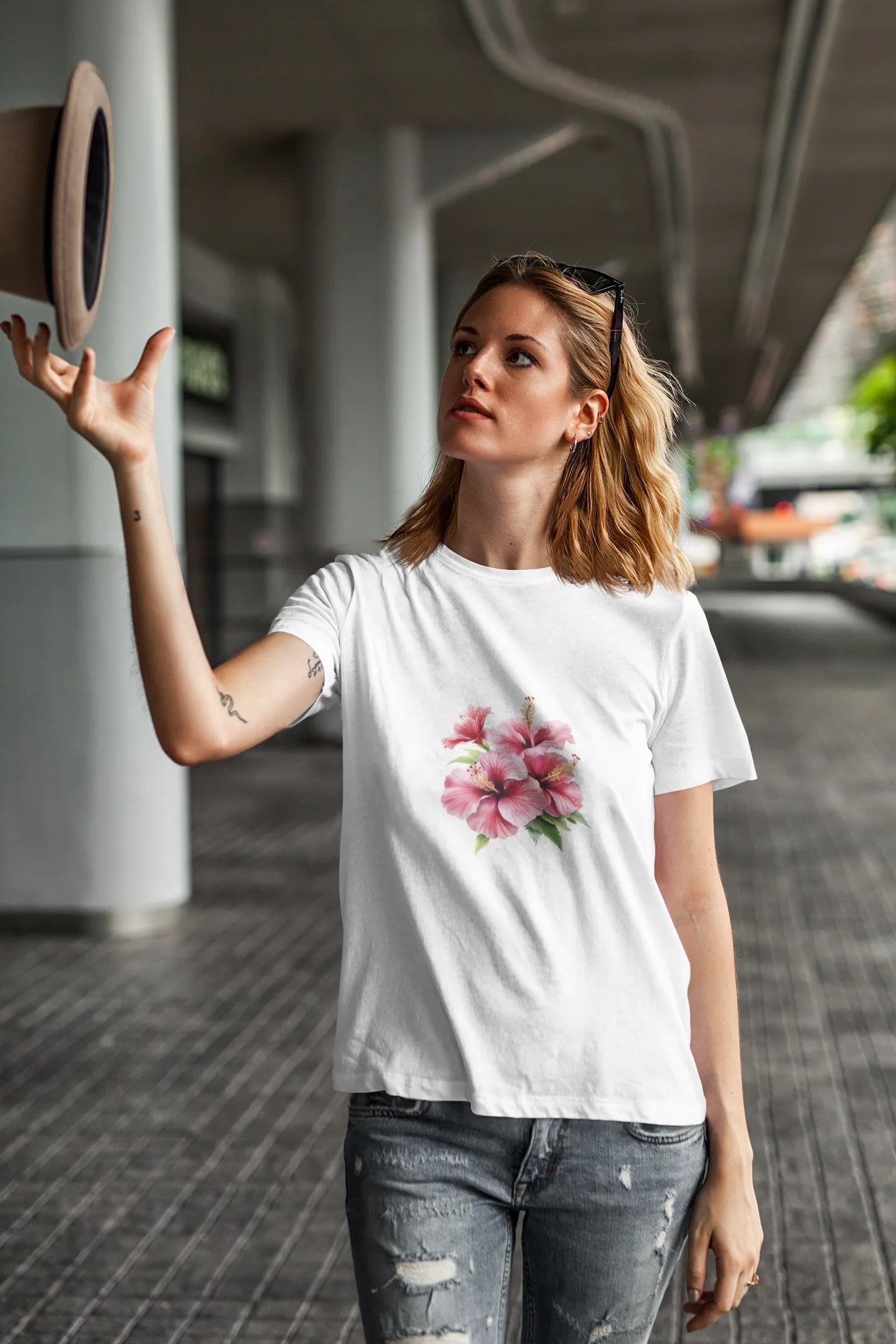 This vibrant t-shirt design features a bold hibiscus flower, symbolizing beauty and tropical vibes. With intricate petal details and a splash of color, it brings a refreshing, island-inspired aesthetic perfect for casual wear and sunny day outings.