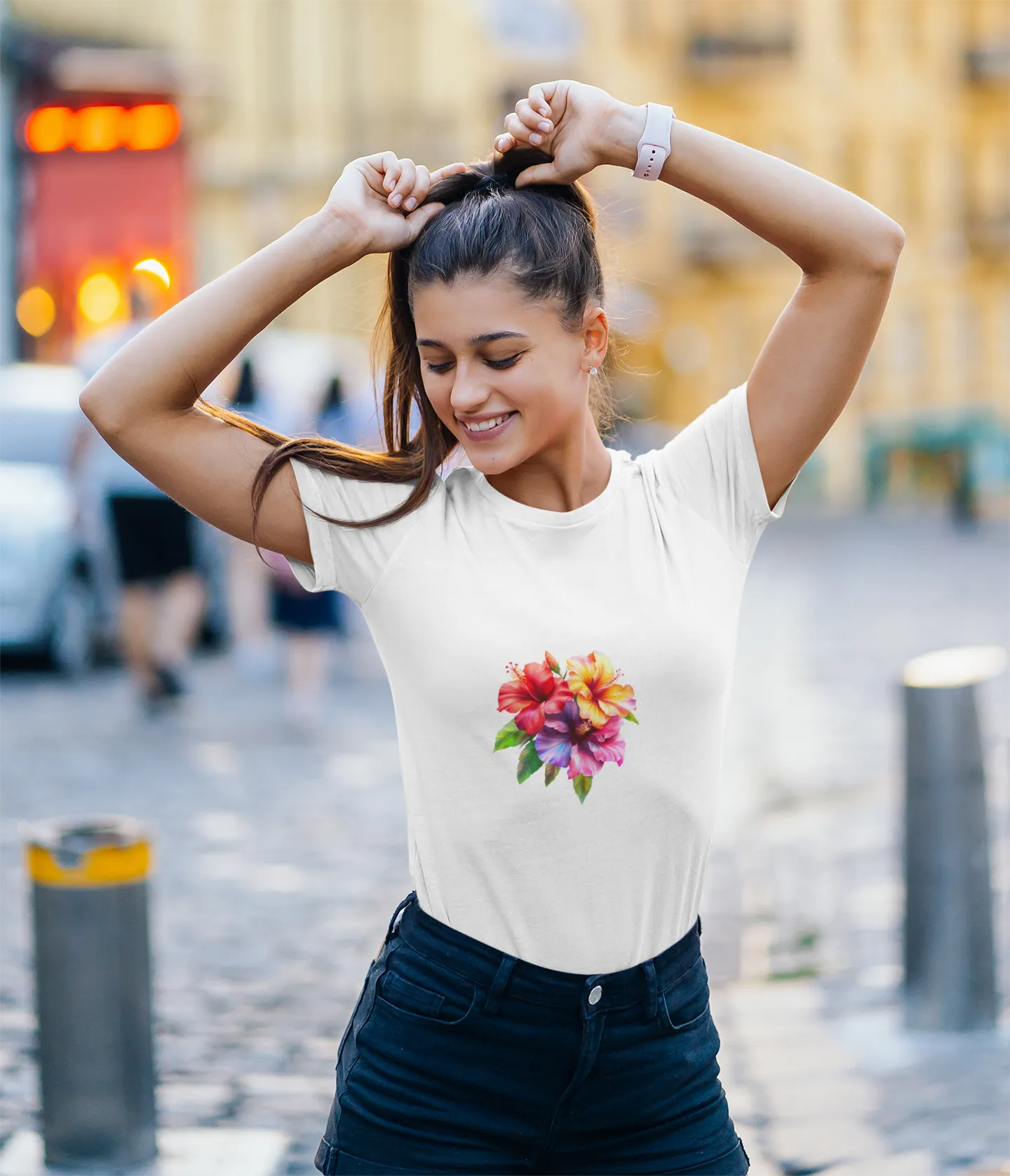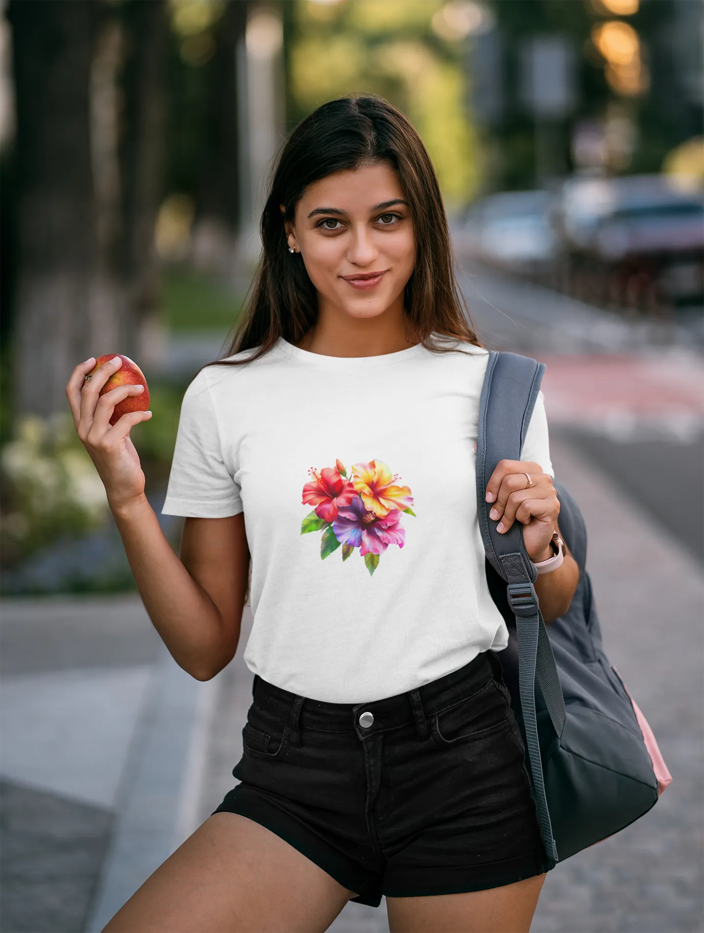 This vibrant t-shirt design features a bold hibiscus flower, symbolizing beauty and tropical vibes. With intricate petal details and a splash of color, it brings a refreshing, island-inspired aesthetic perfect for casual wear and sunny day outings.