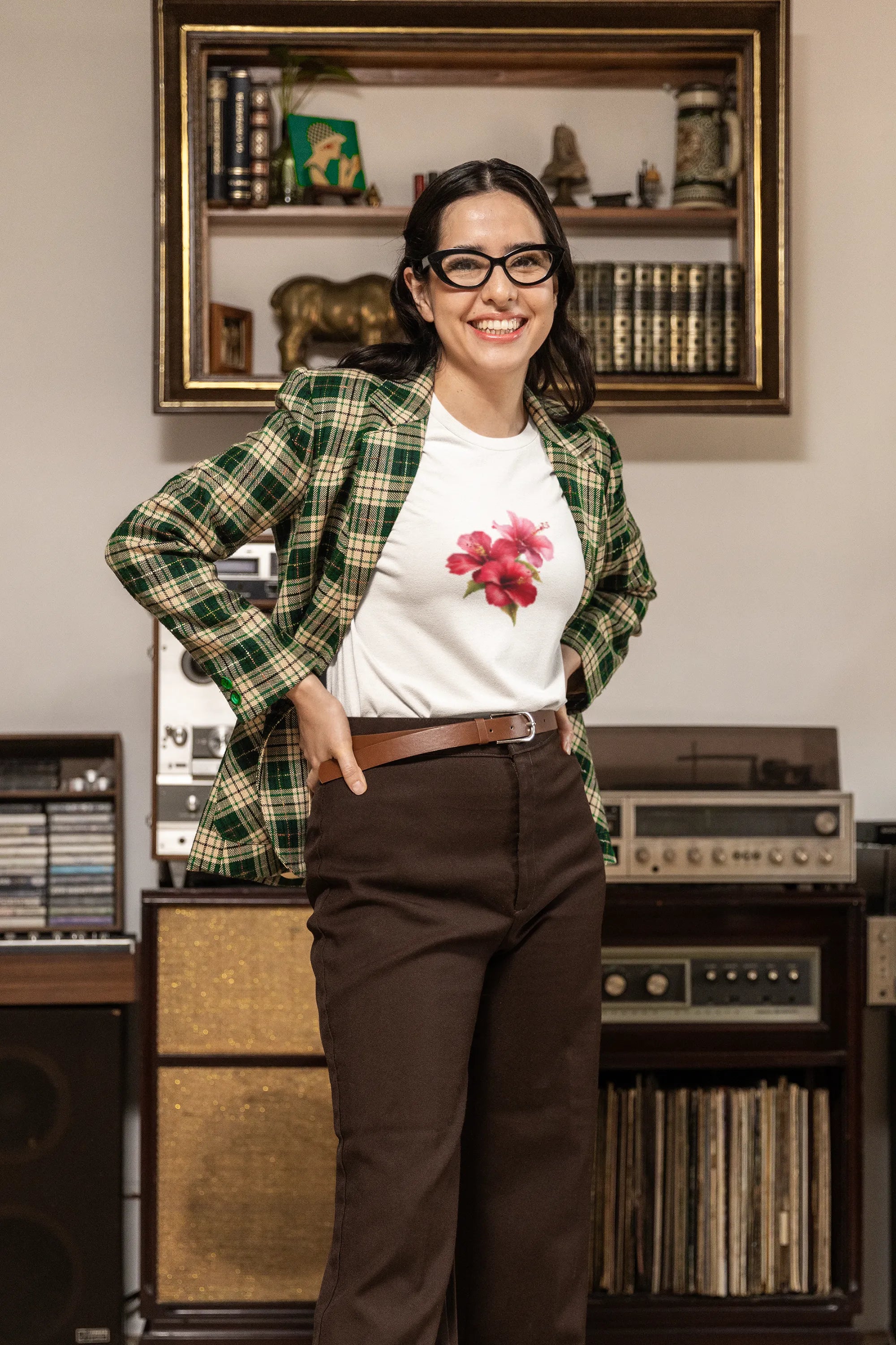 Woman wearing a white t-shirt with a floral design in a room with vintage equipment.