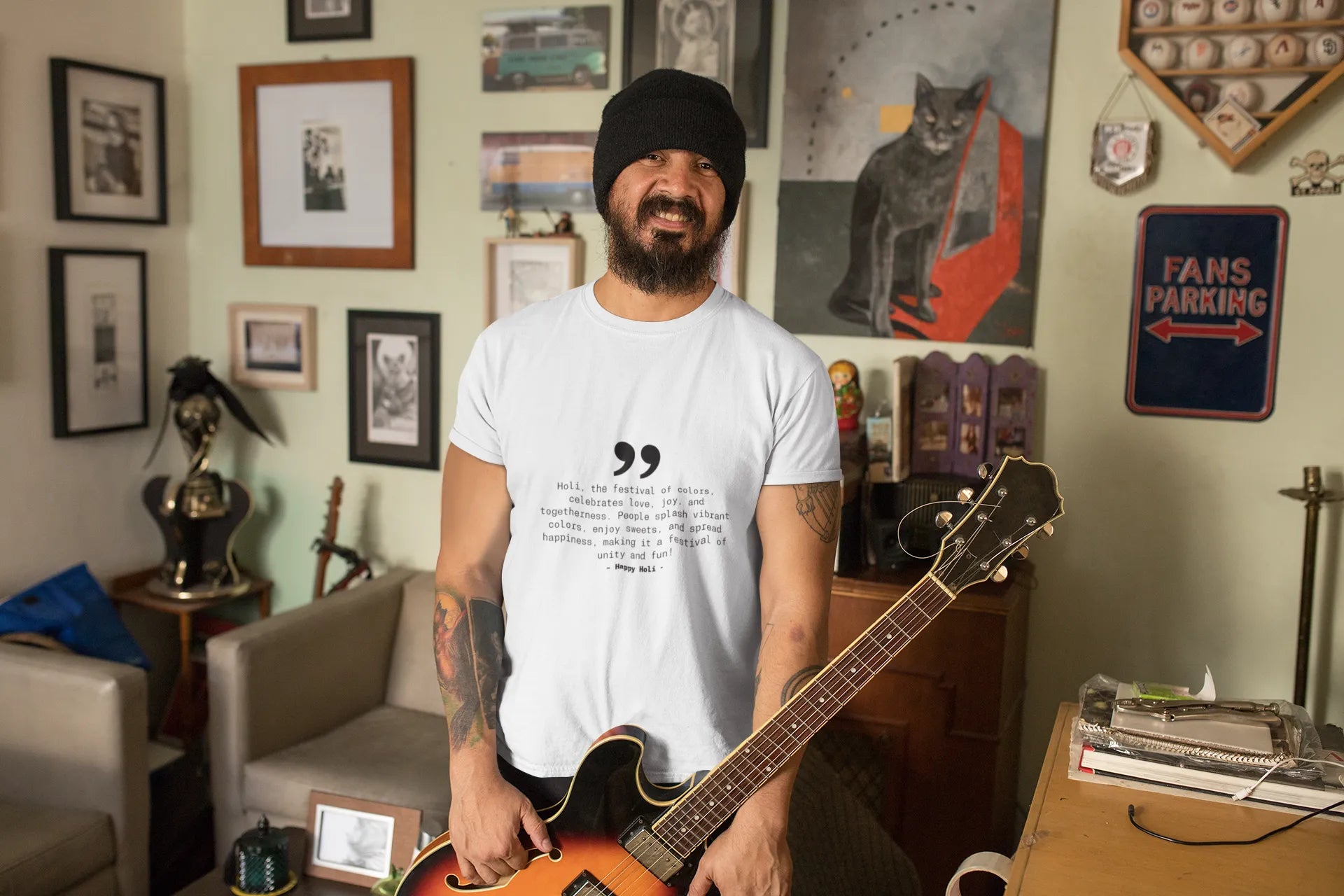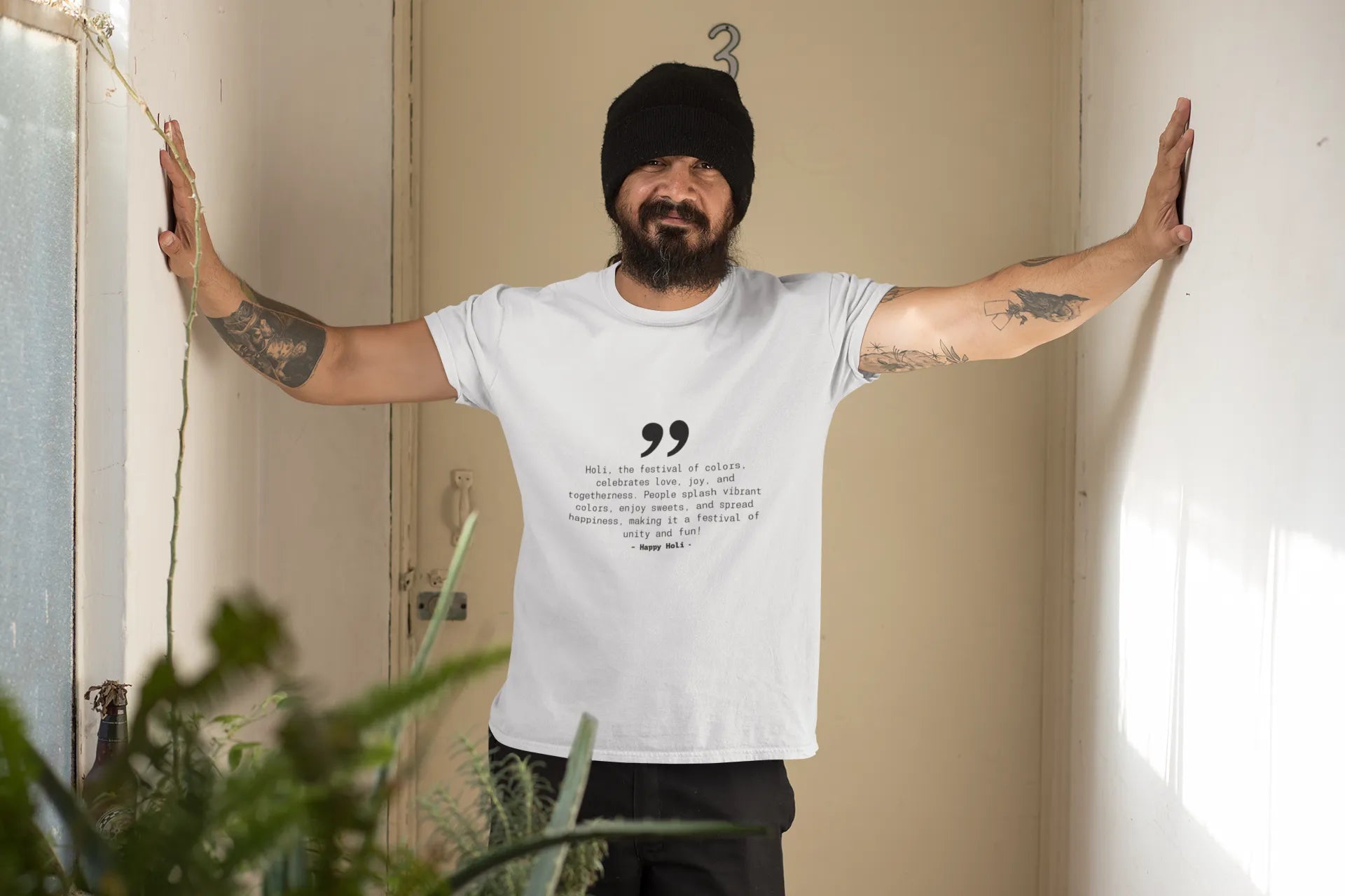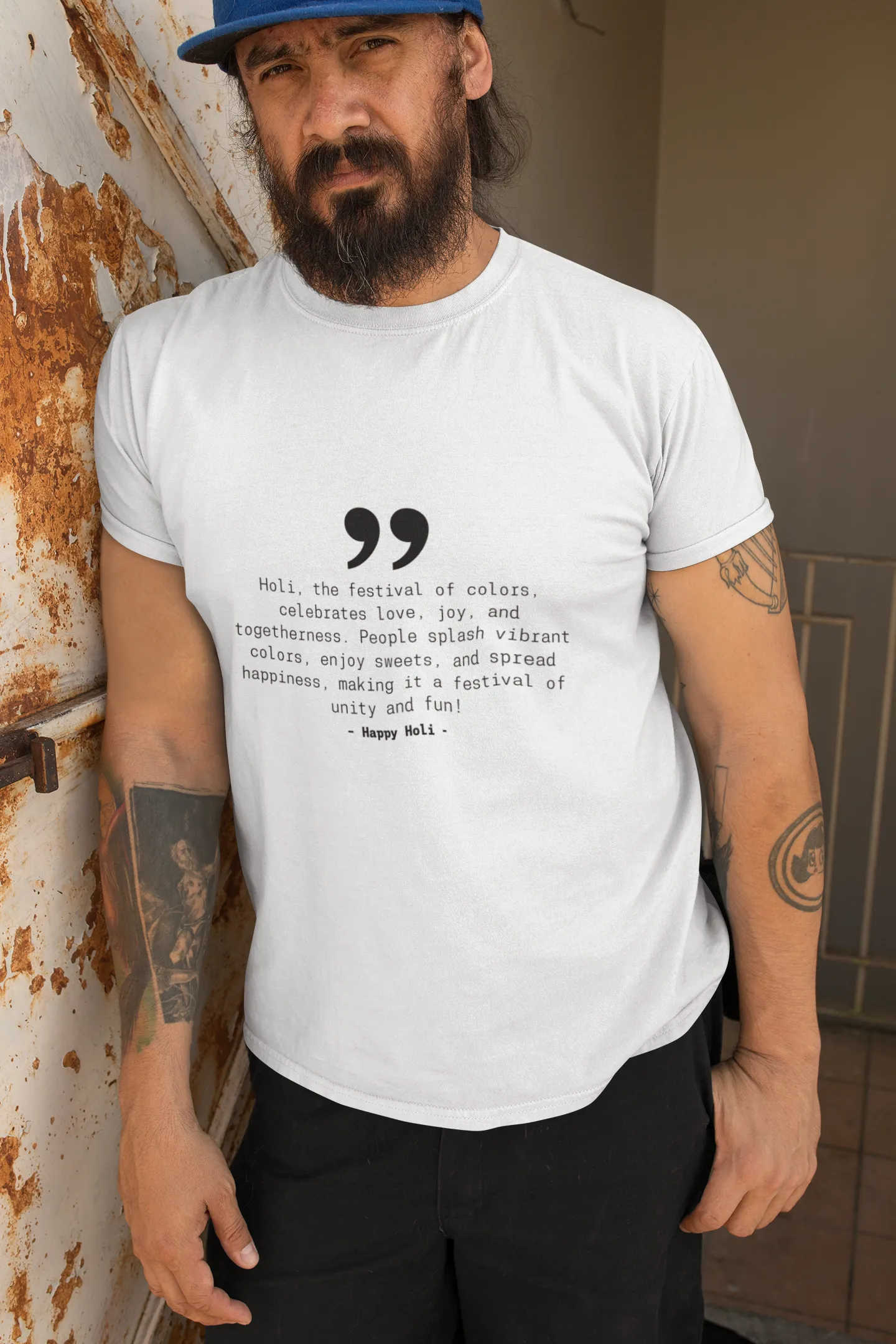 The Holi T-shirt design bursts with vibrant colors, splashes, and playful patterns, capturing the festive spirit. Featuring artistic gulal splatters, joyful slogans, and traditional elements like pichkaris or handprints, it radiates celebration and joy. Perfect for spreading festive vibes with a stylish, colorful twist!