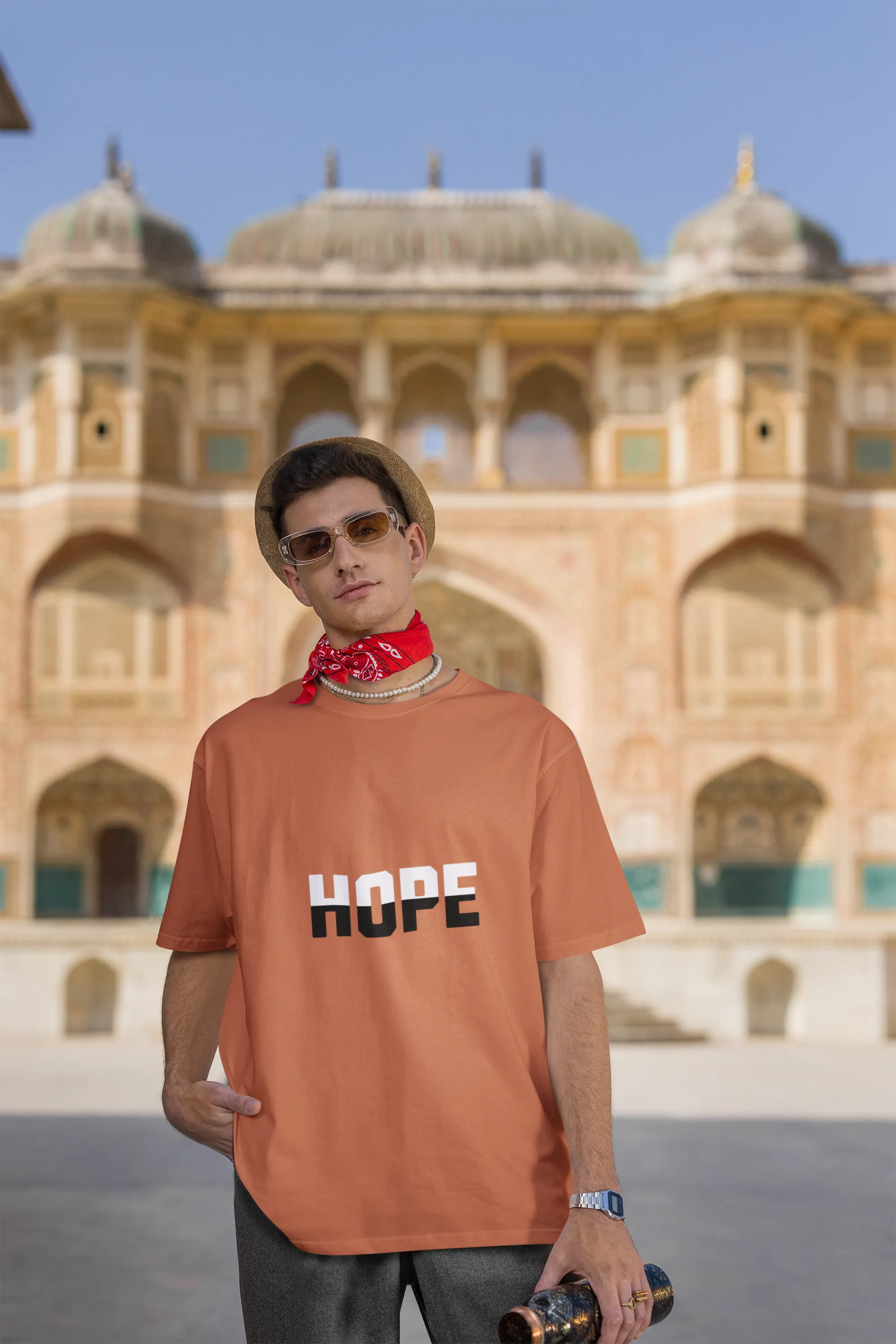 Man wearing an orange t-shirt with 'HOPE' printed on it, standing in a decorative architectural setting.