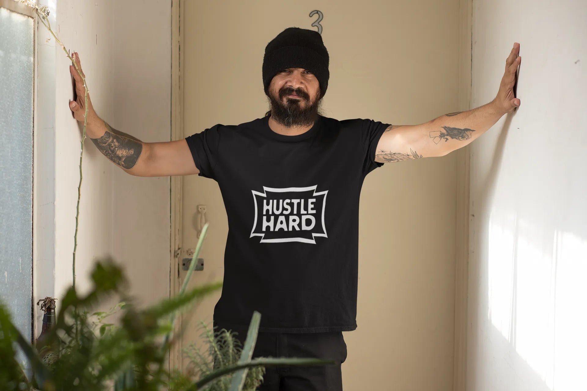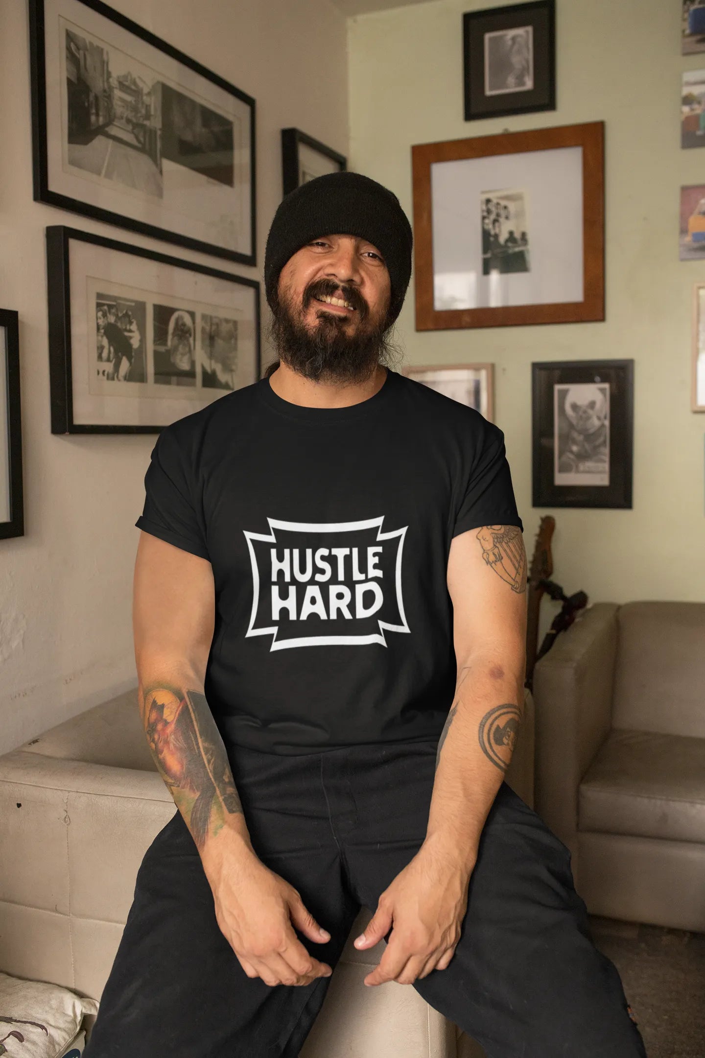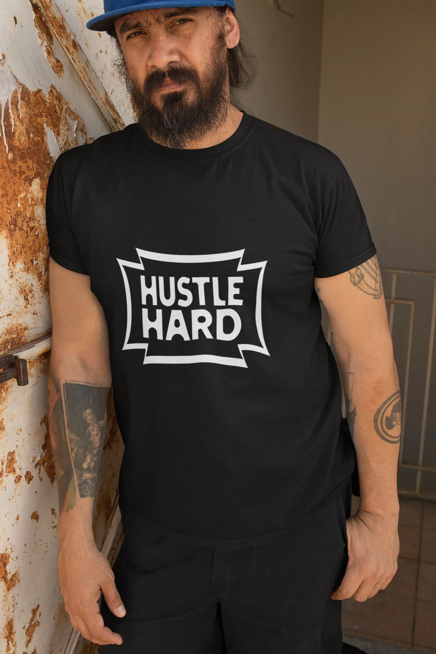 A bold and motivational T-shirt design featuring the phrase “Hustle Hard” in strong, gritty typography. Accented with dynamic elements like motion lines, weights, or urban textures, it symbolizes dedication, grind, and ambition — perfect for go-getters chasing success with relentless energy.