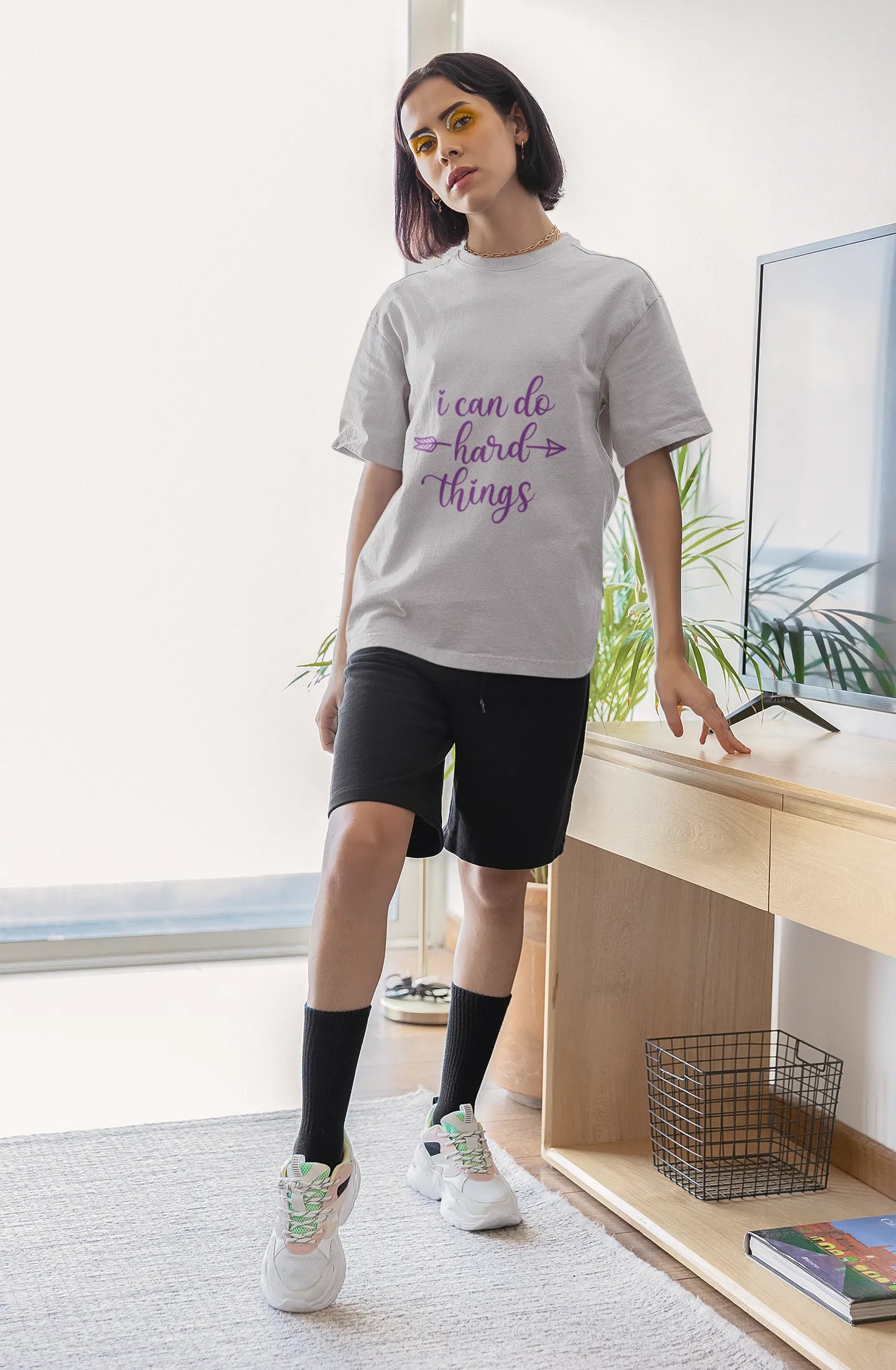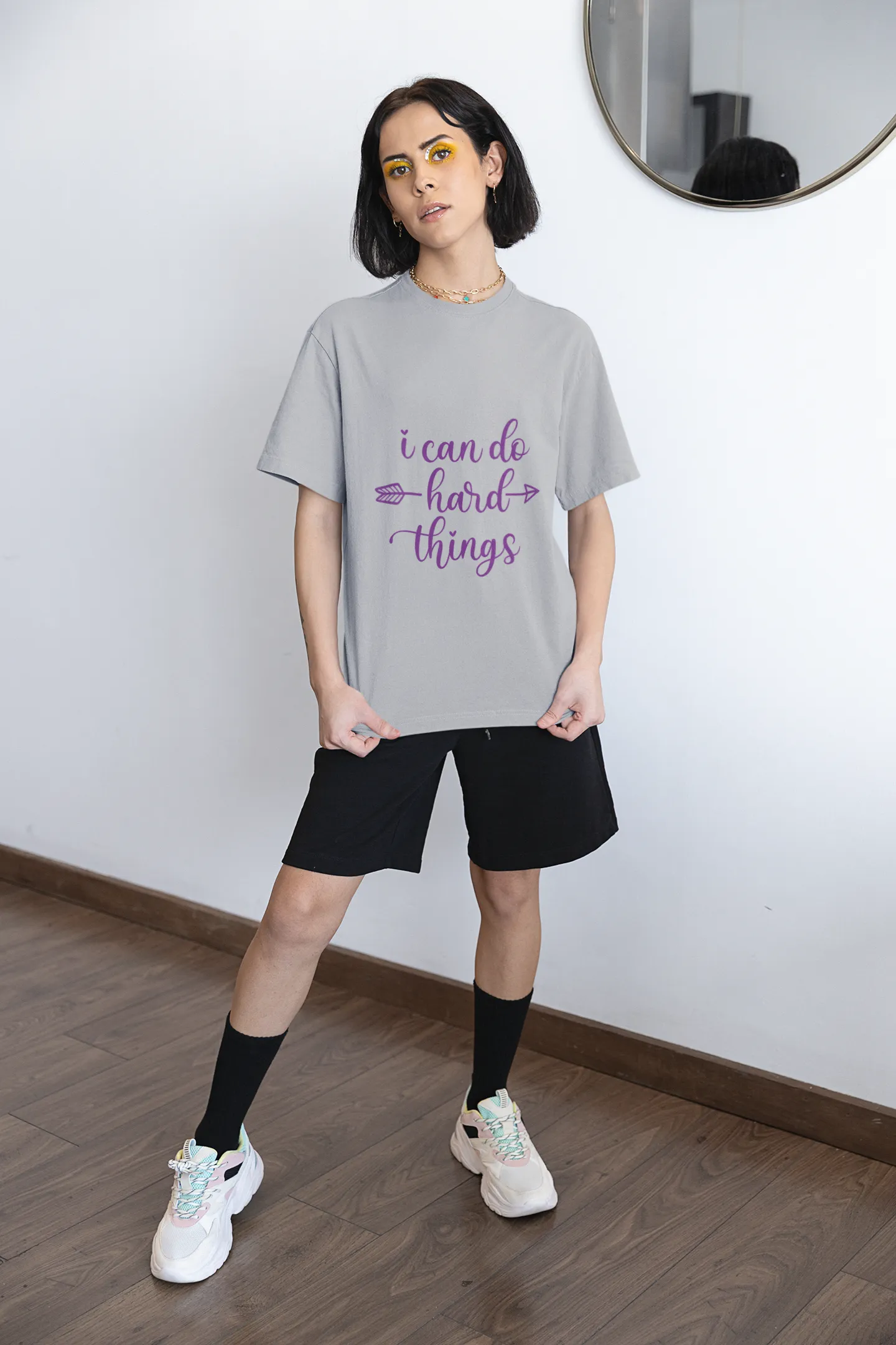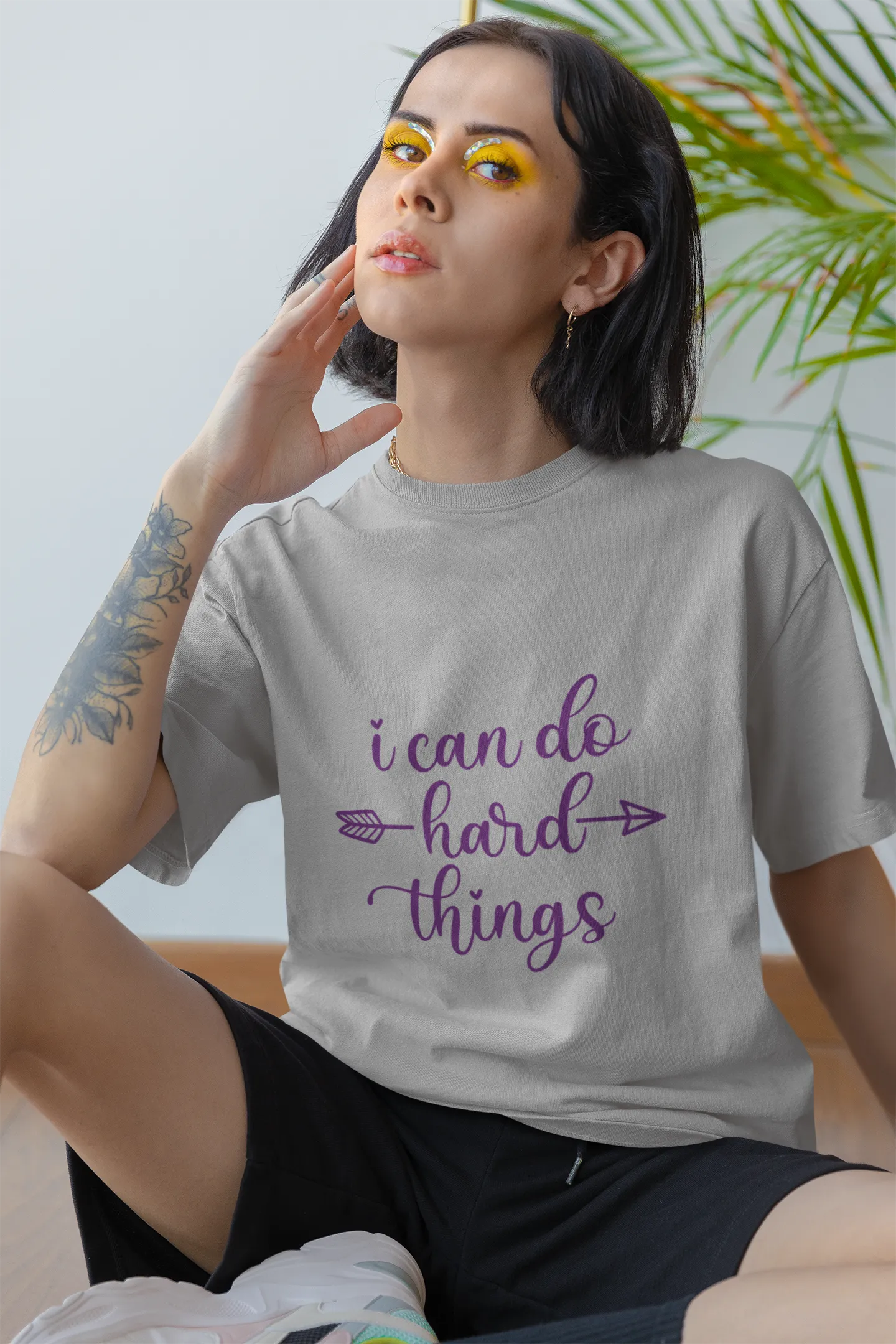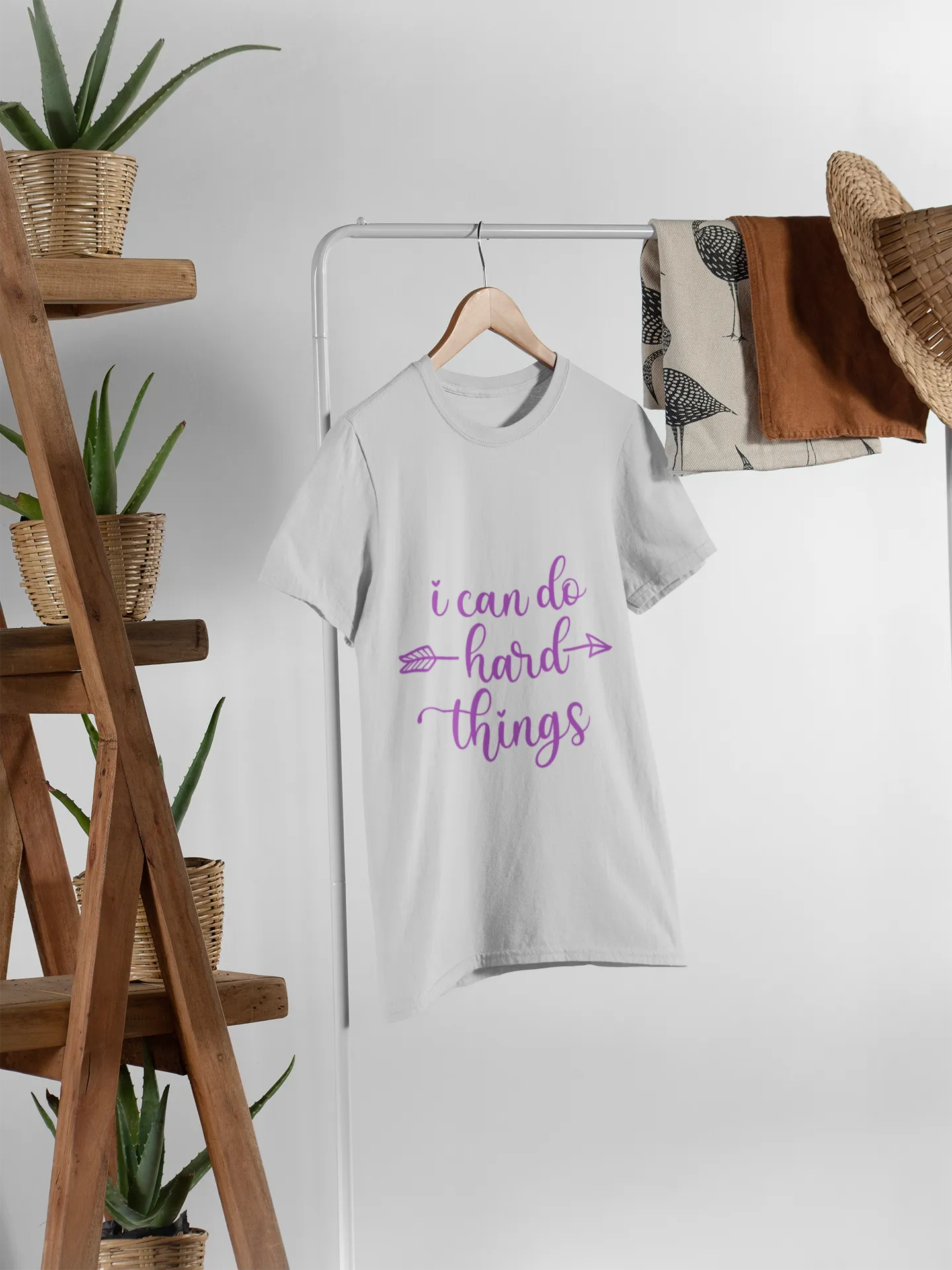 A minimalist T-shirt design featuring the bold phrase "I CAN DO HARD THINGS" in strong, modern typography. The text stands out with a sleek, monochrome or gradient effect, symbolizing resilience and determination. Perfect for motivation and self-empowerment.