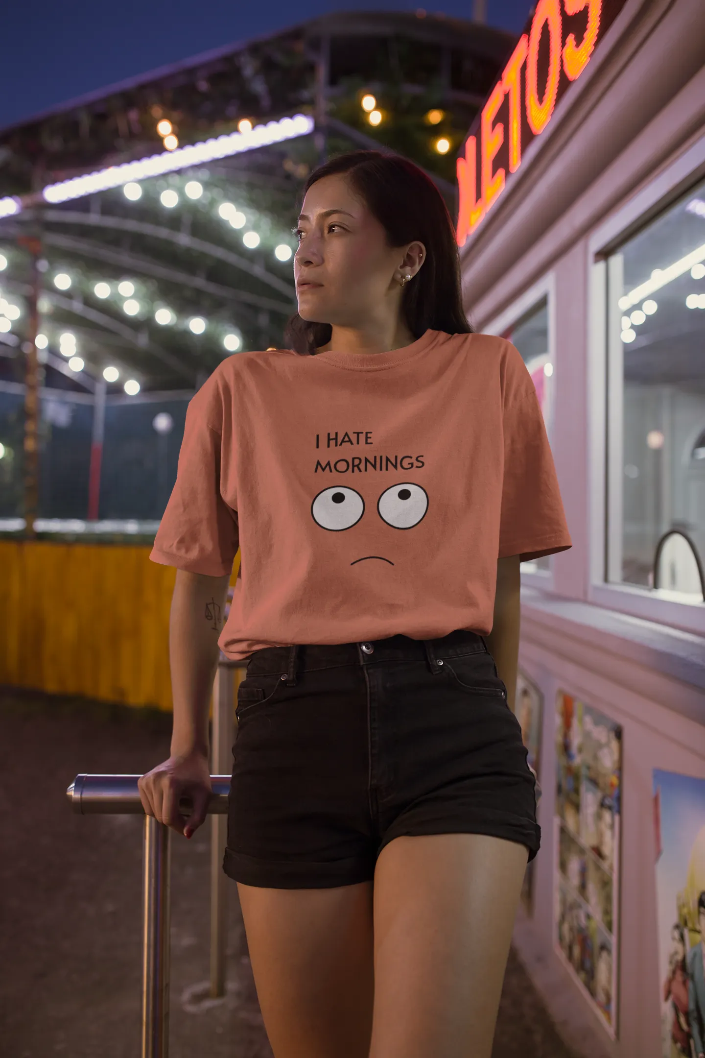 This T-shirt design playfully grumbles I Hate Mornings. Relatable and humorous, it captures that not-so-sunny early vibe with a touch of sarcasm. Perfect for night owls and caffeine lovers who face mornings with eye rolls and oversized mugs.