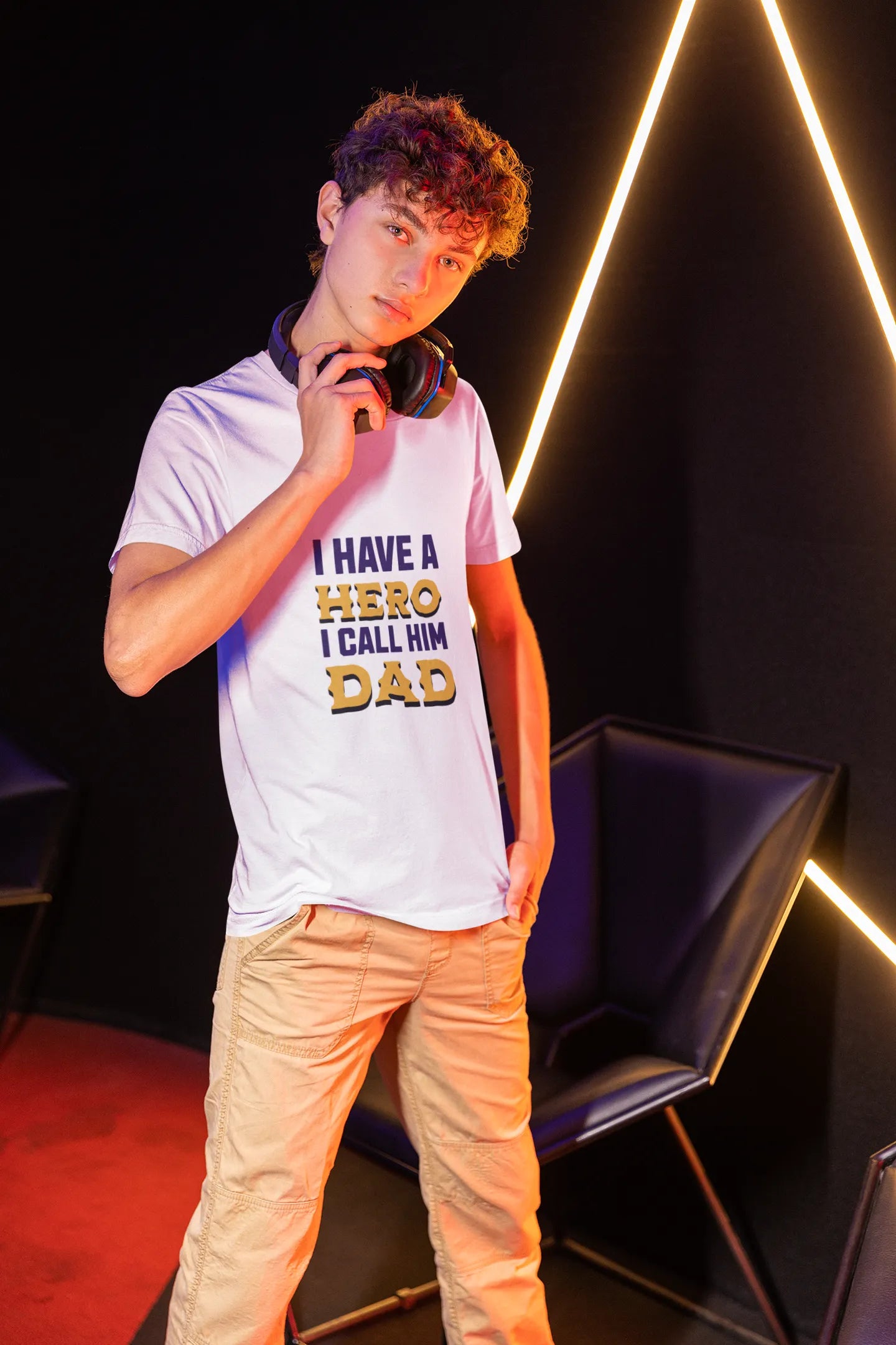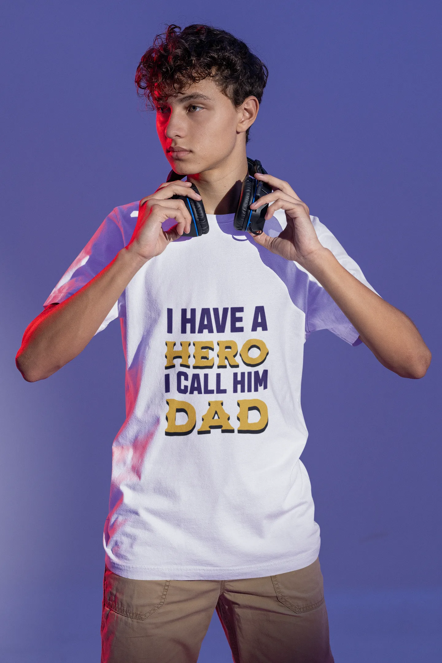 A bold and heartfelt T-shirt design featuring the phrase "I have a hero, I call him Dad" in stylish typography. The design includes a strong silhouette of a father and child, accented with a vintage or modern aesthetic, symbolizing love, strength, and admiration.