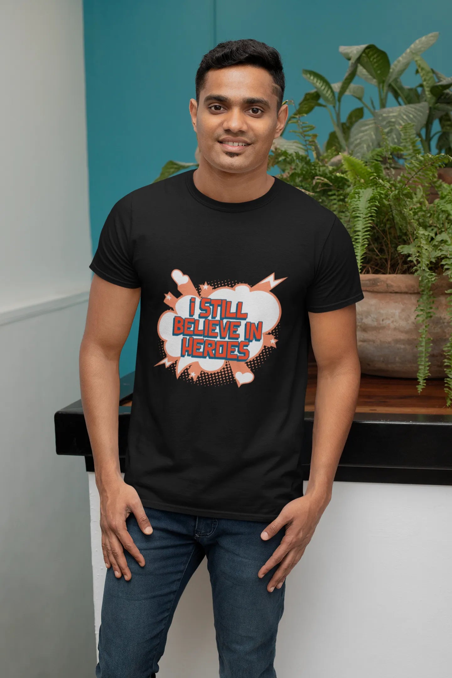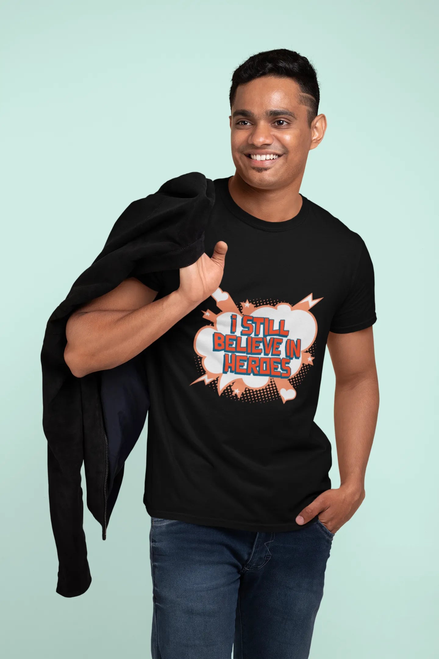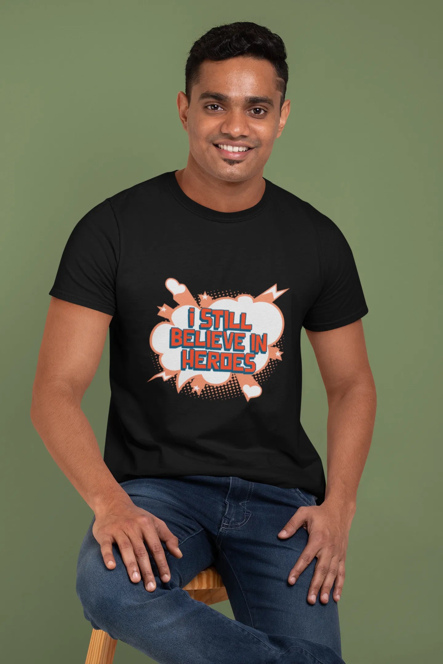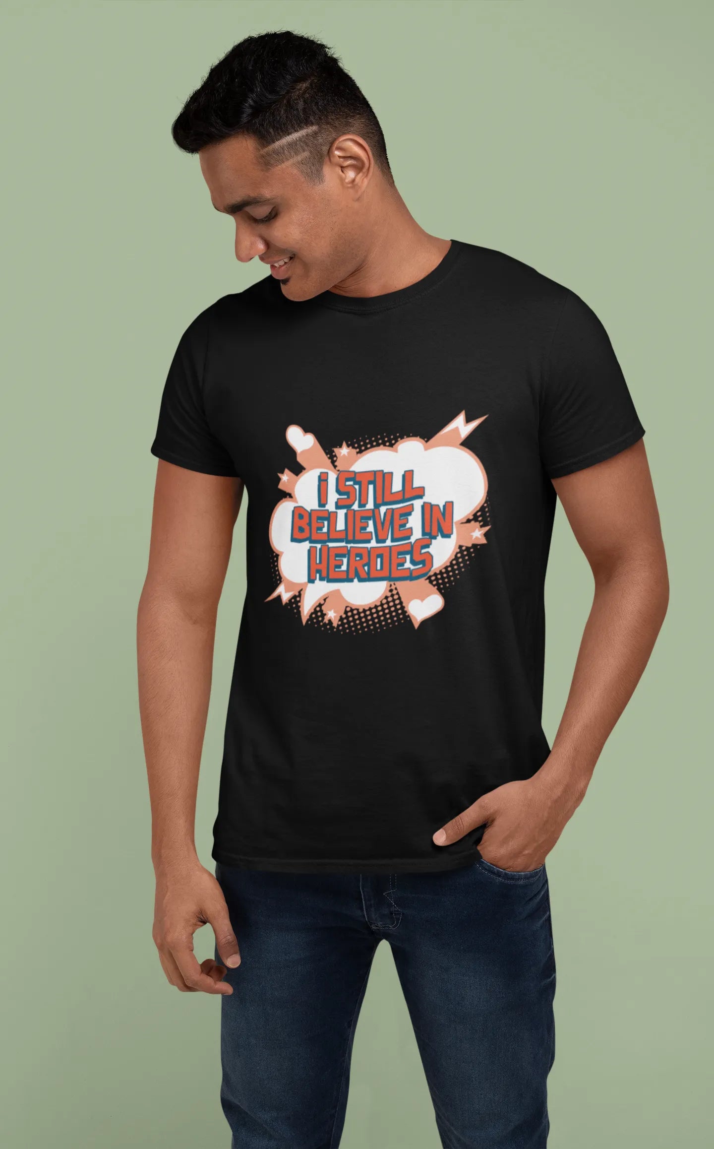 The "I Still Believe in Heroes" T-shirt design features bold typography with a dynamic, heroic theme. Inspired by legendary figures, it may include comic-style graphics, capes, or a powerful emblem. Perfect for superhero fans, it celebrates courage, strength, and unwavering belief in heroism.