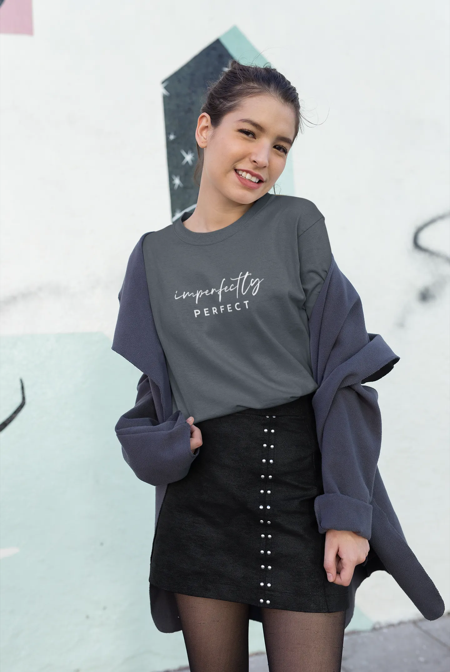 A beautifully honest t-shirt featuring the phrase “imperfectly perfect” in a handwritten, artistic style. It embraces flaws, uniqueness, and authenticity. Perfect for those who celebrate being real over being flawless—a bold reminder that true beauty lies in being unapologetically you.