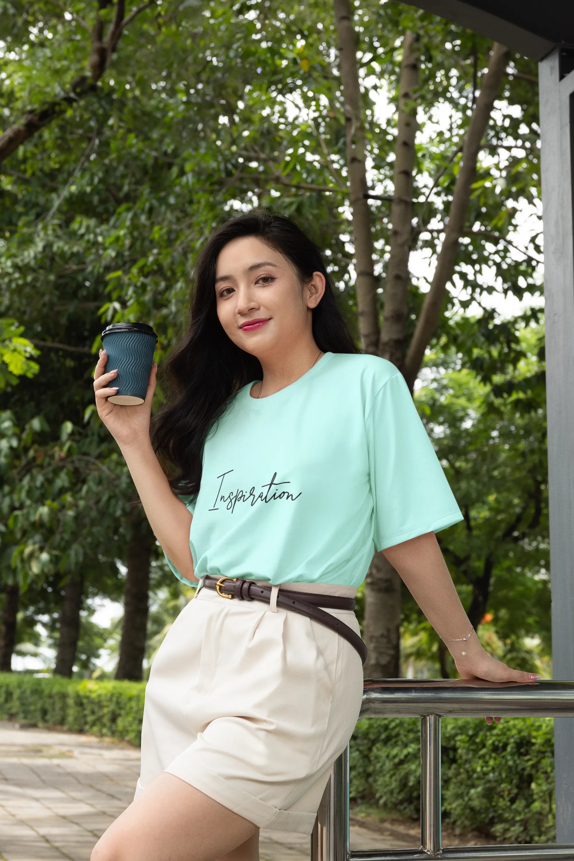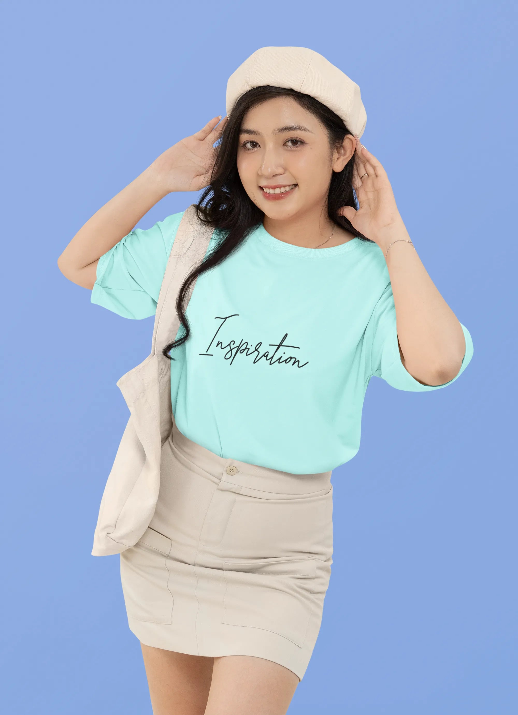 Mint green t-shirt with 'Inspiration' text on a hanger against a dark background