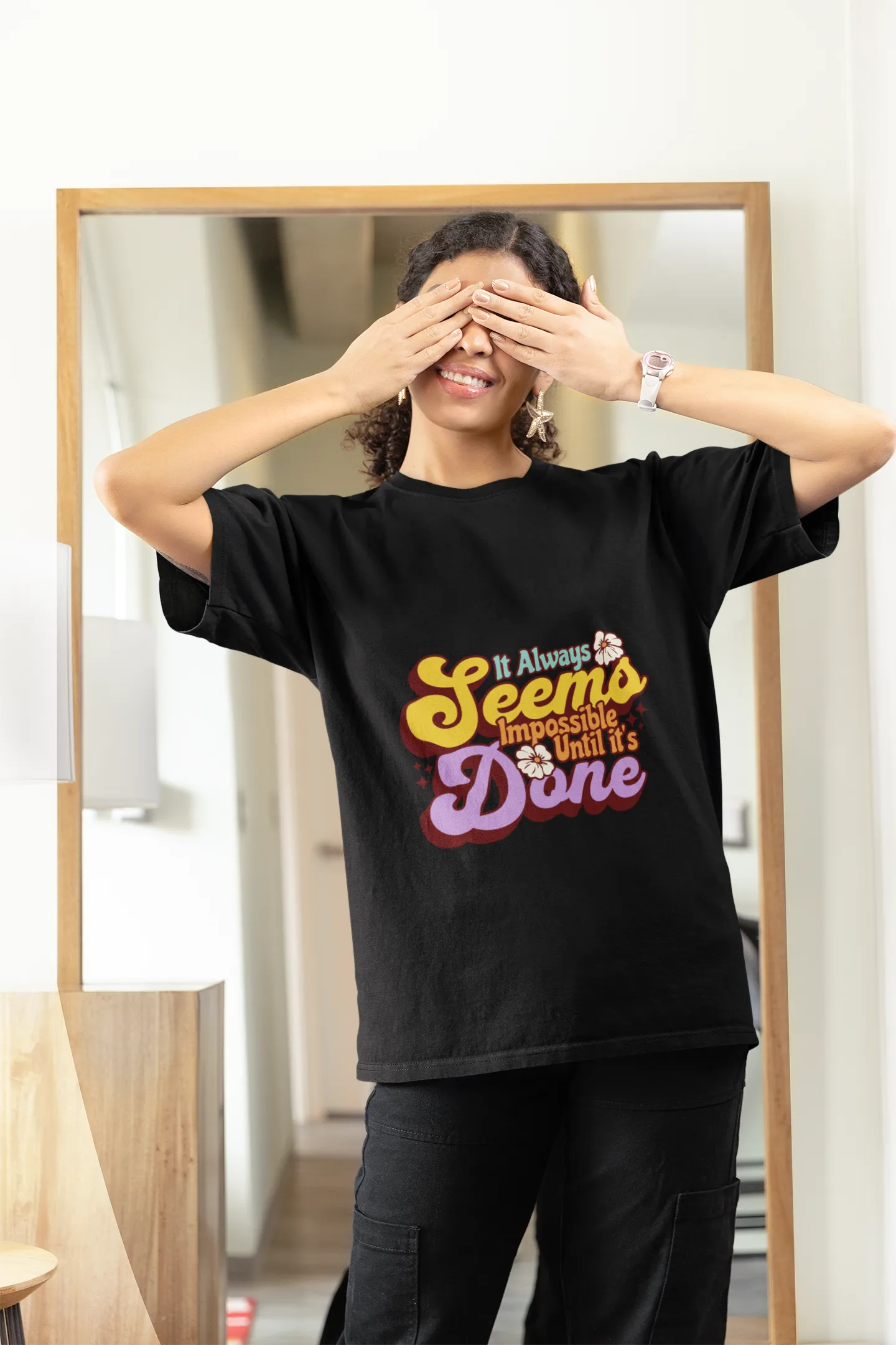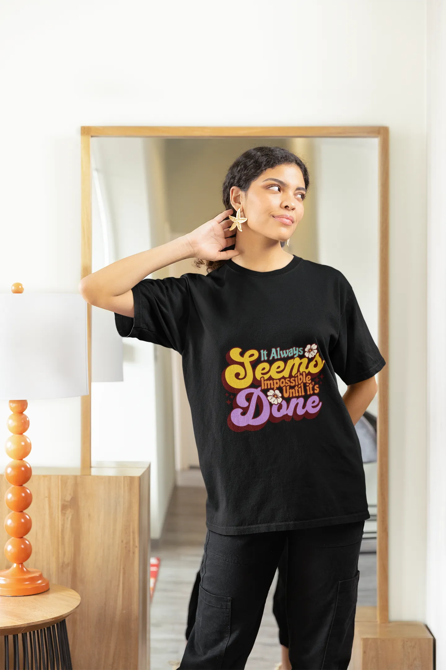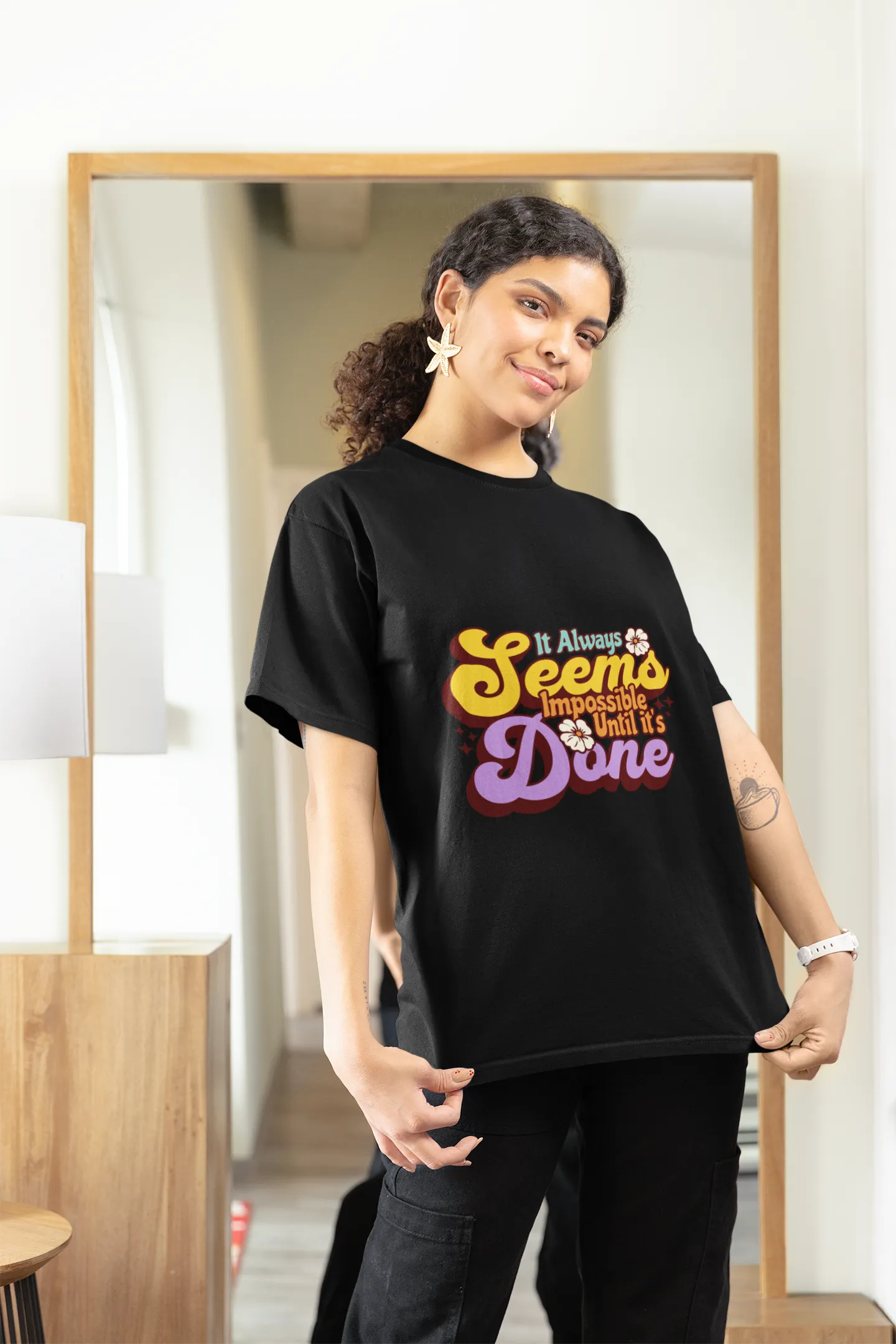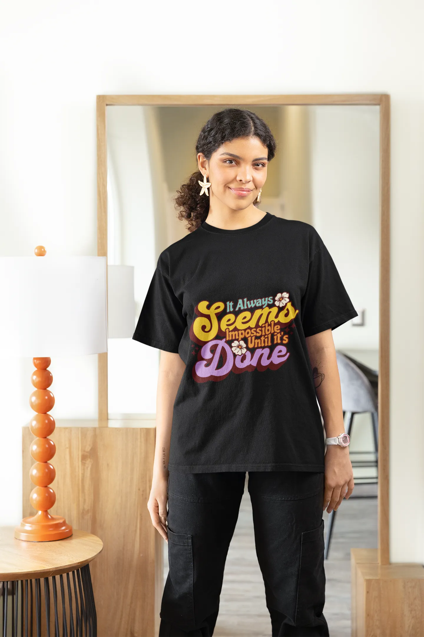 An inspiring T-shirt design featuring the phrase “It Always Seems Impossible Until It’s Done” in bold, motivational typography. Enhanced with progress bars, upward arrows, or sunrise graphics, it symbolizes perseverance and achievement — perfect for go-getters, dreamers, and anyone chasing big goals.