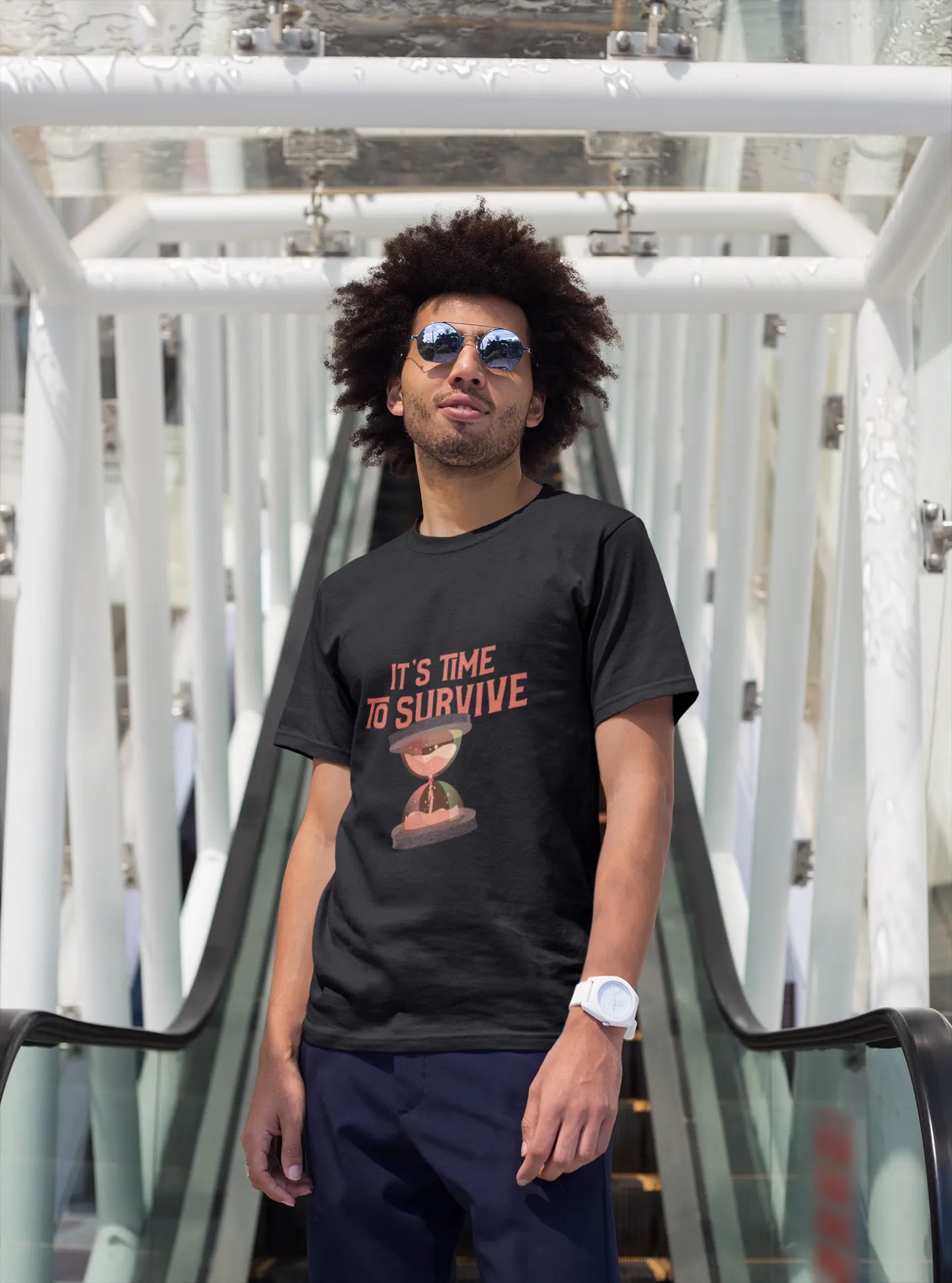 The "It's Time to Survive" T-shirt design features a bold, edgy theme symbolizing resilience and strength. With distressed typography and rugged graphics—like a clock, survival gear, or a dystopian backdrop—it exudes a fearless attitude. Perfect for adventurers, gamers, or anyone embracing a survivor’s mindset.