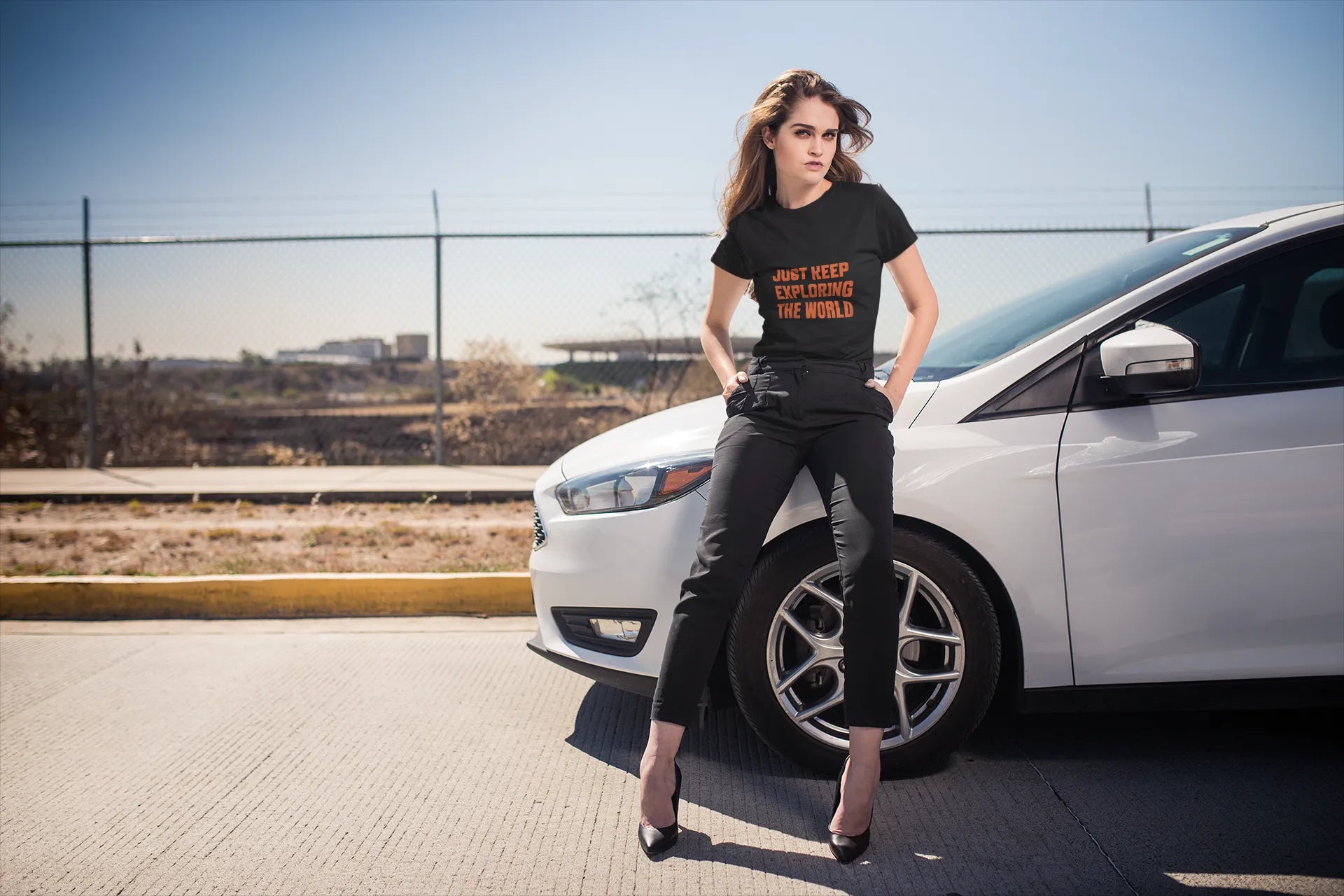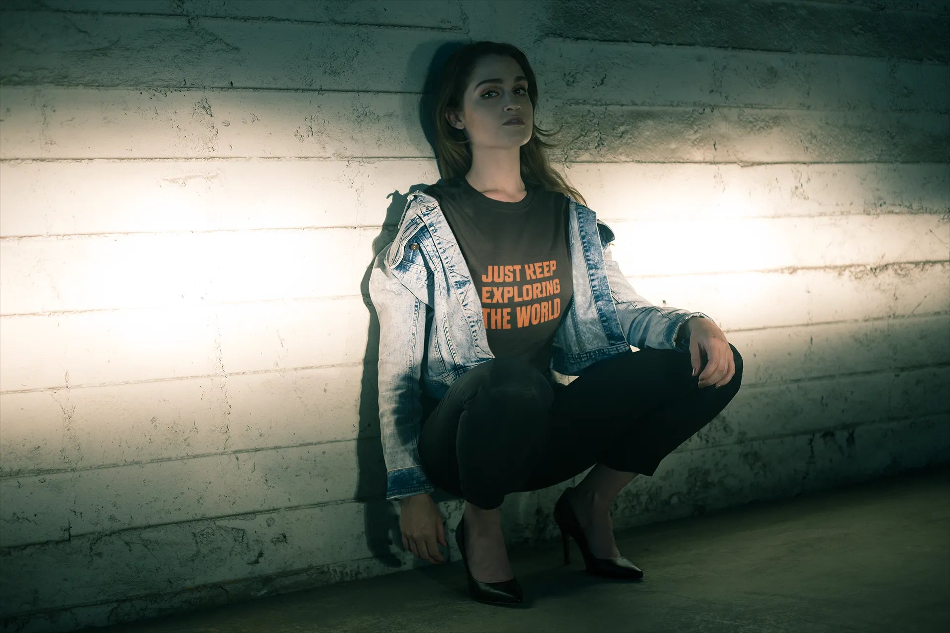 A vibrant T-shirt design featuring a scenic landscape with mountains, a winding road, and a compass, symbolizing endless adventure. The phrase "Just Keep Exploring the World" is elegantly placed, inspiring wanderlust and a passion for discovering new places and experiences.