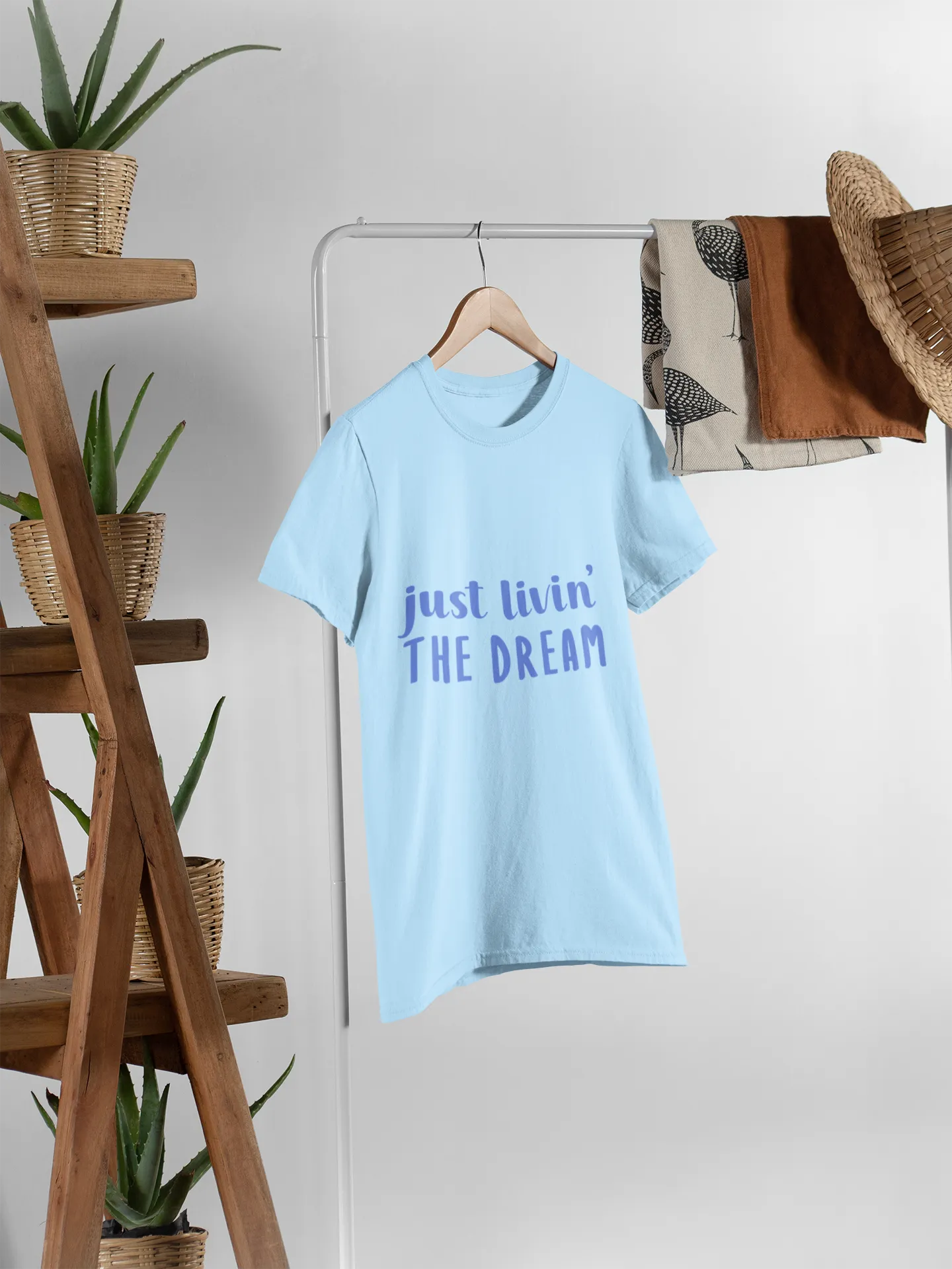 A stylish T-shirt design featuring the phrase "Just Livin' the Dream" in bold, retro typography. Vibrant colors, a relaxed vibe, and subtle graphic elements like palm trees, sunsets, or clouds enhance the dreamy, carefree aesthetic, perfect for everyday wear.
