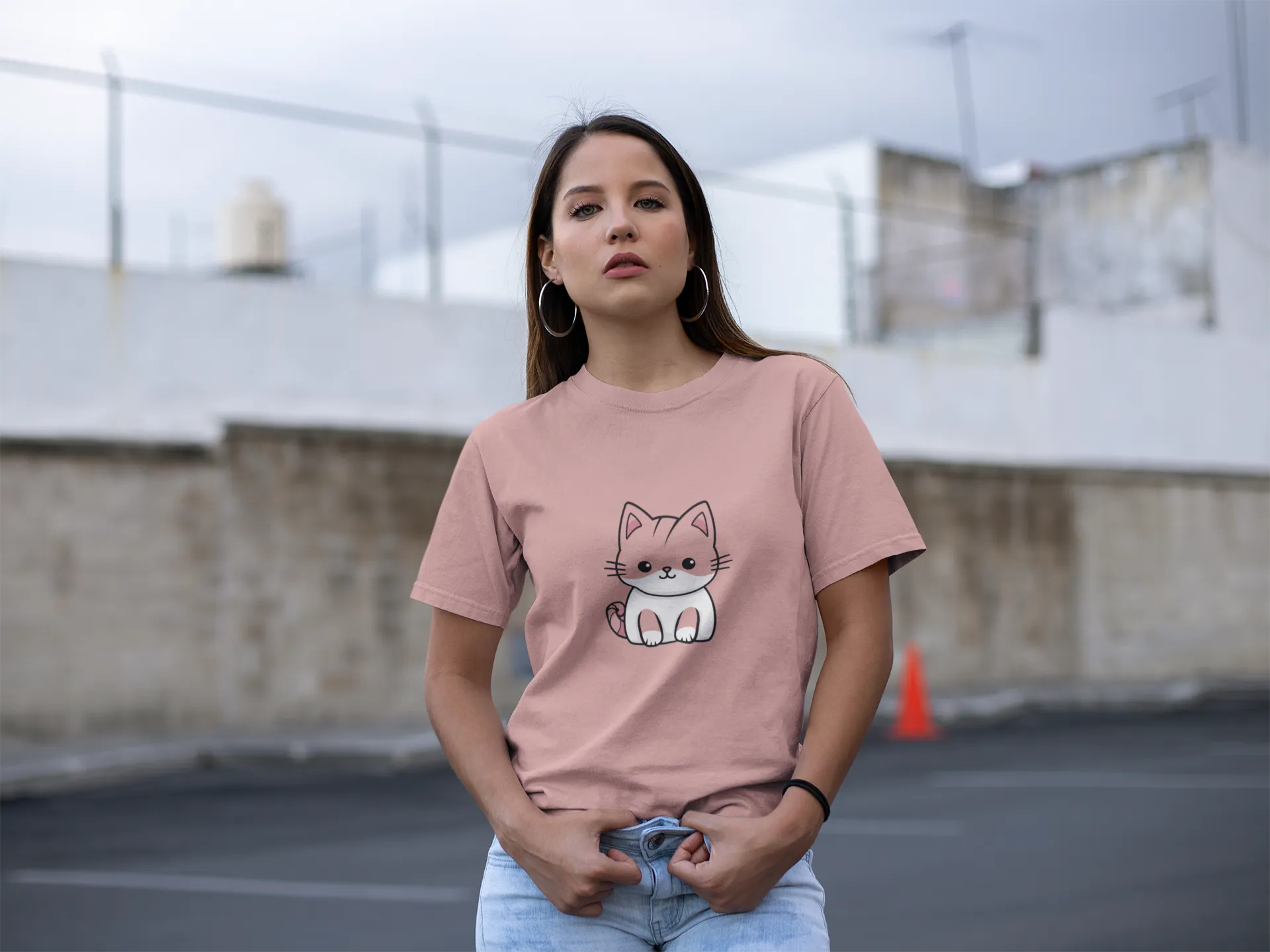 Woman wearing a pink t-shirt with a cat graphic in an outdoor setting