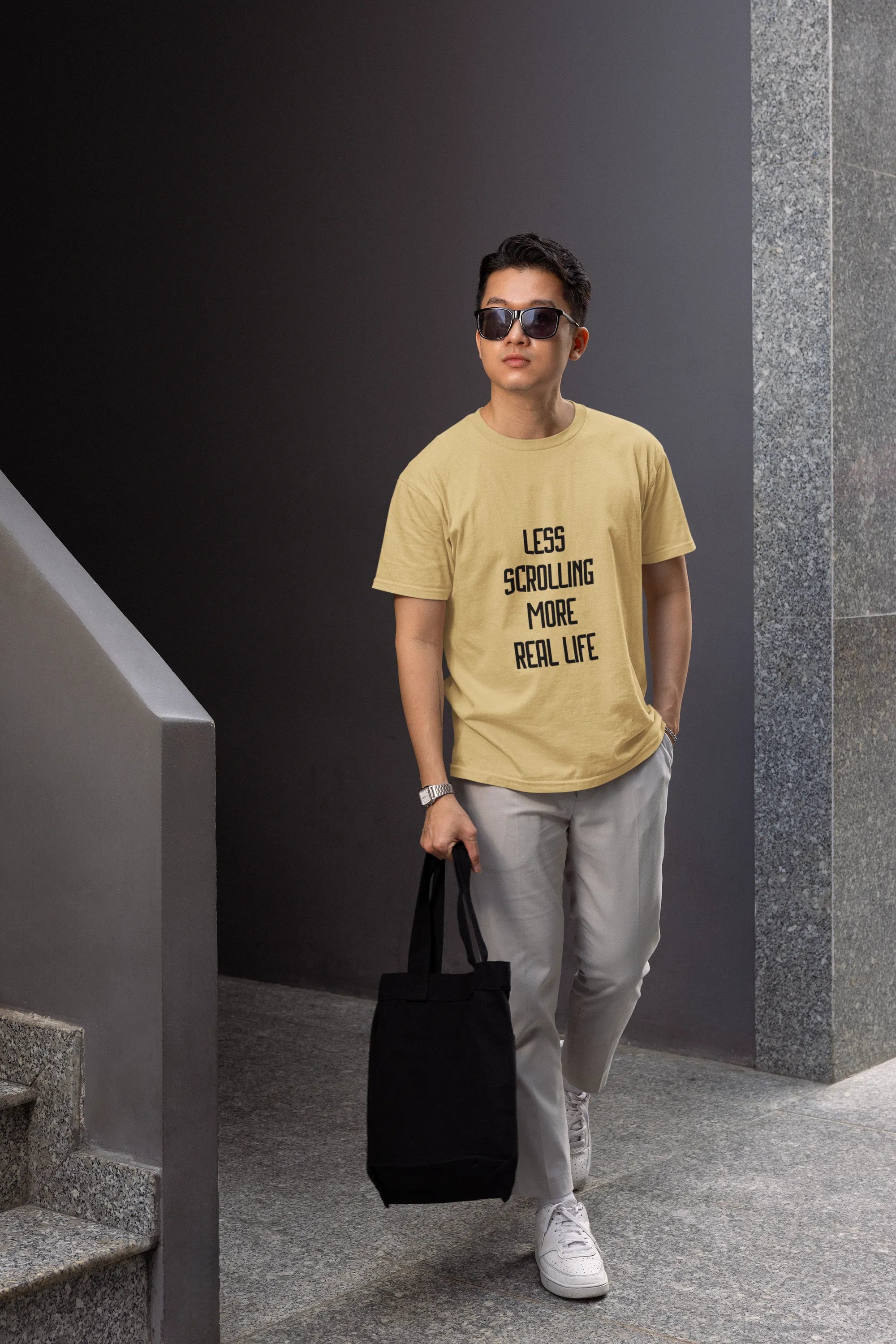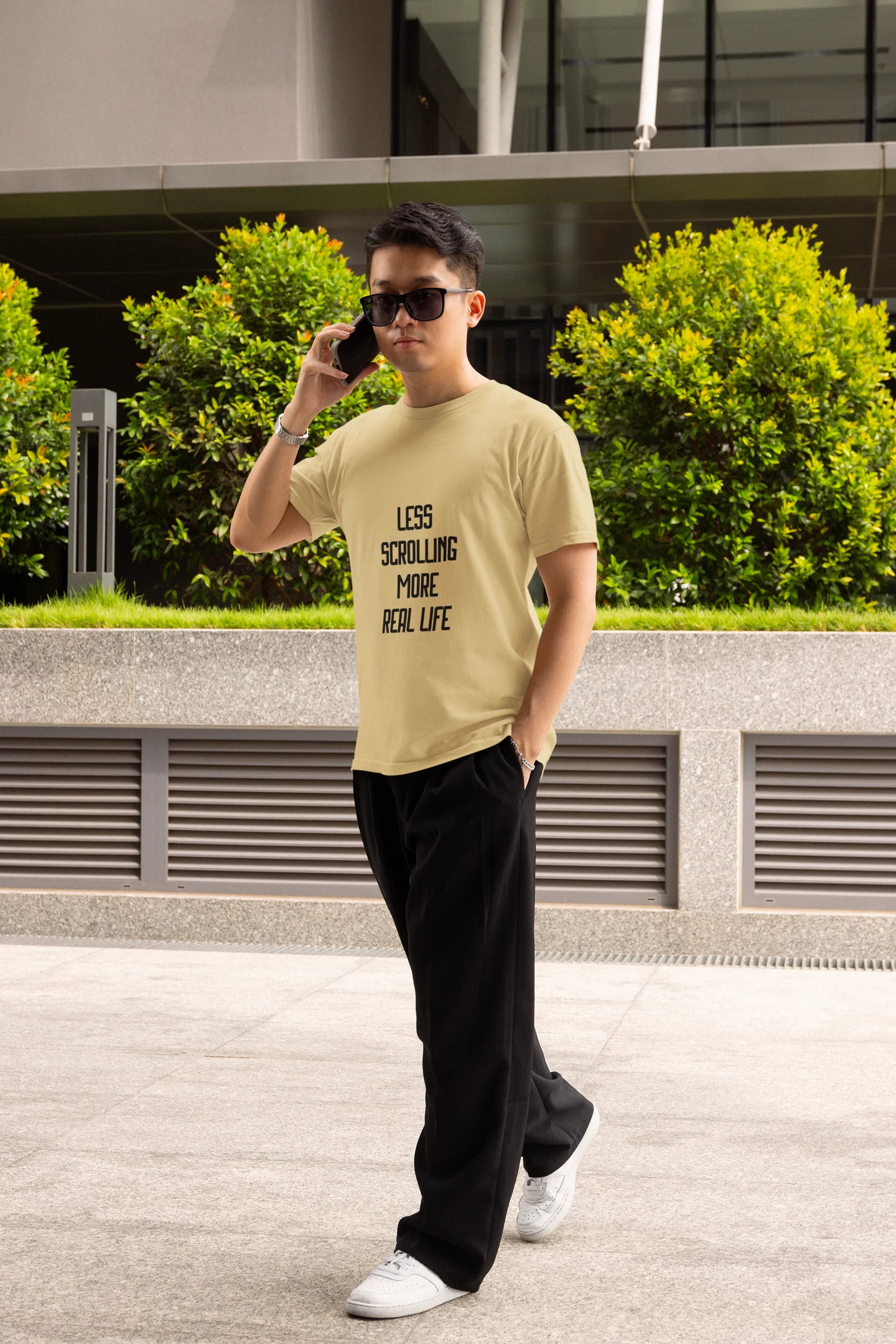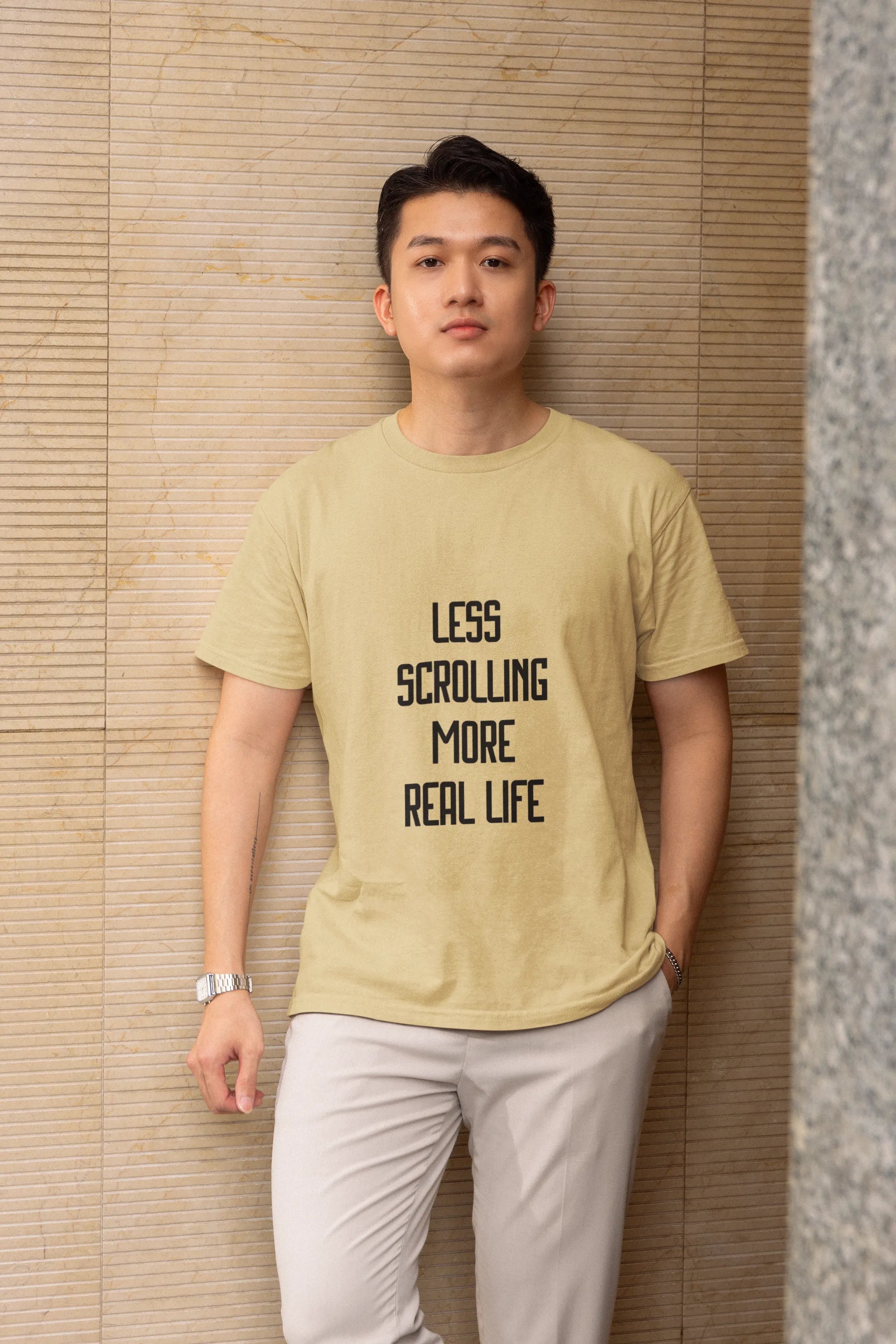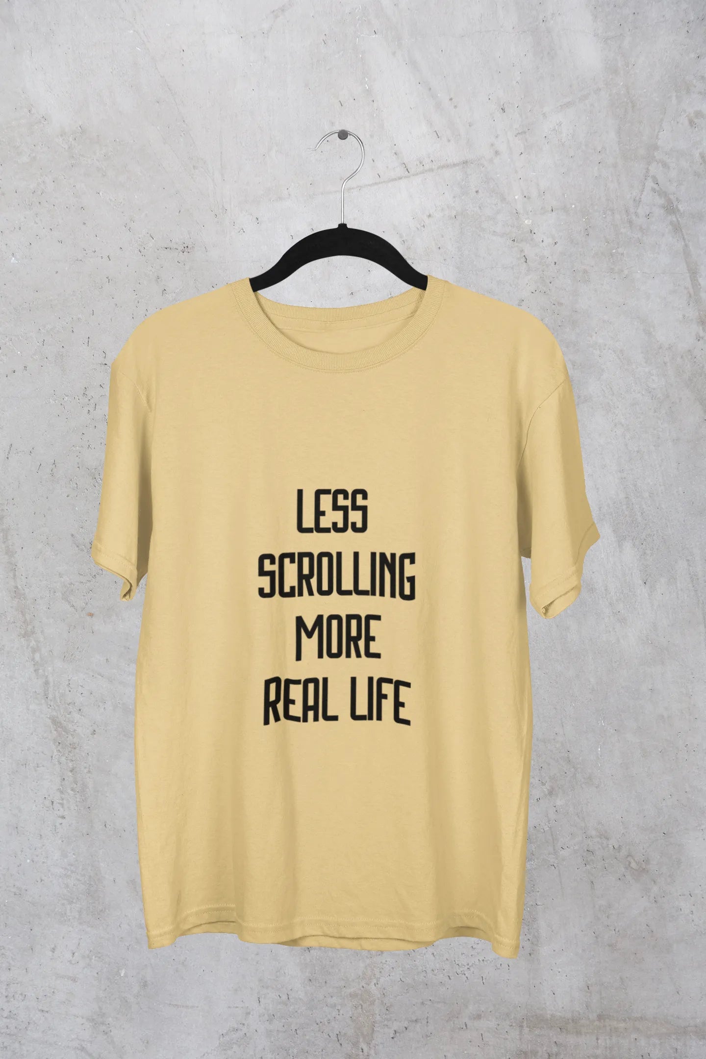 A minimalistic T-shirt design featuring the phrase “Less Scrolling, More Real Life” in bold, modern typography. Paired with a subtle graphic of a phone fading into nature, it promotes digital detox and encourages mindful, present living in everyday moments.