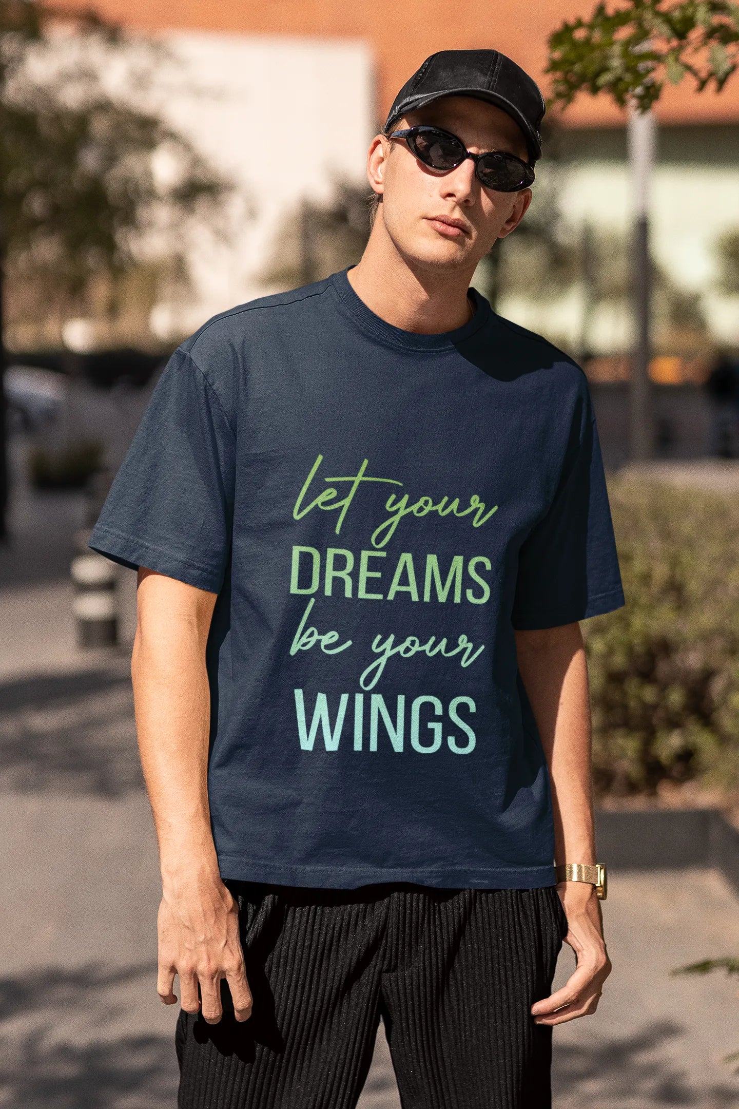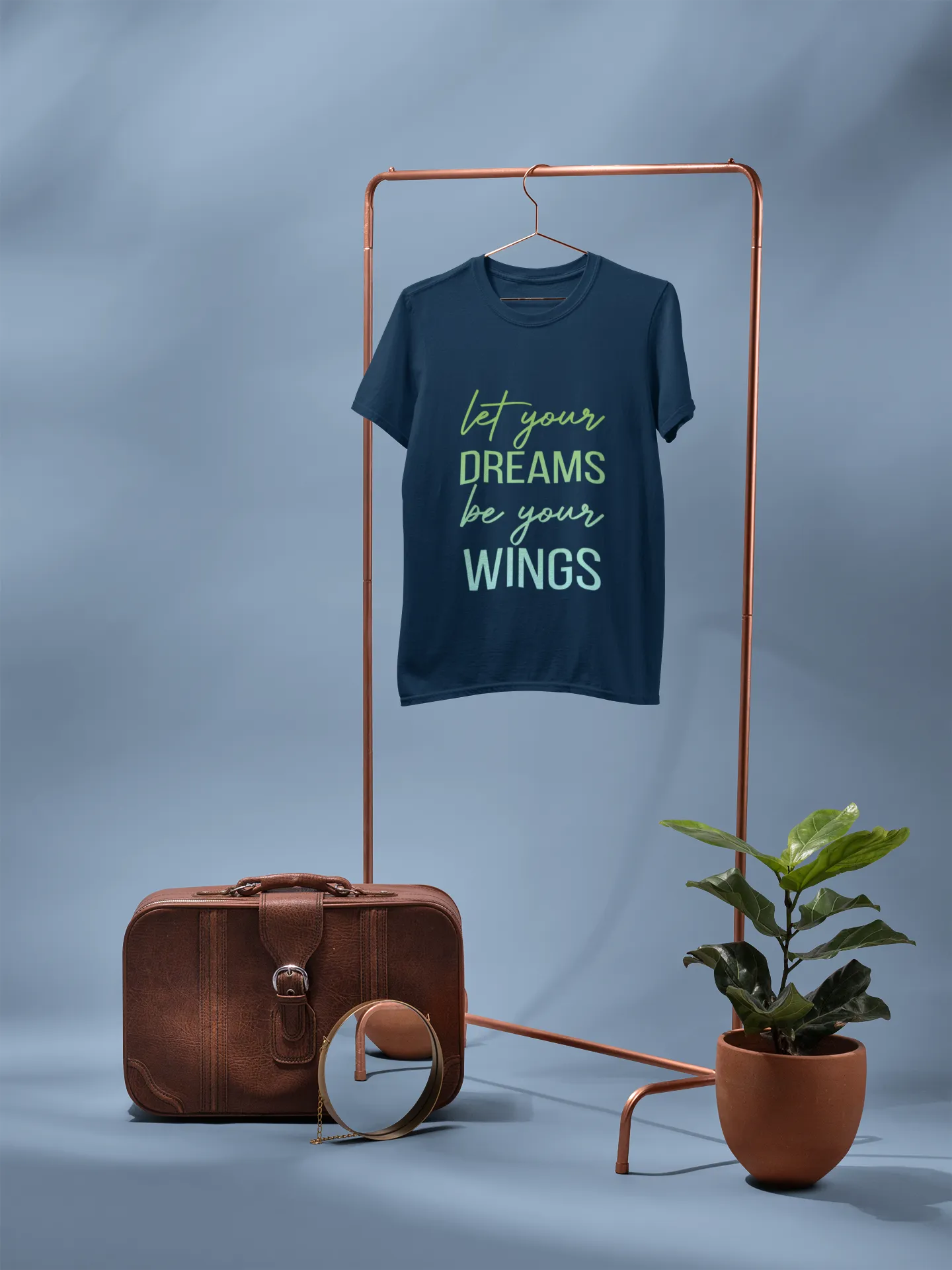 A dreamy and inspiring T-shirt design featuring "Let Your Dreams Be Your Wings" in an elegant, flowing script. Soft pastel hues or a gradient effect enhance the uplifting message, complemented by subtle wing illustrations, symbolizing freedom, ambition, and limitless possibilities.