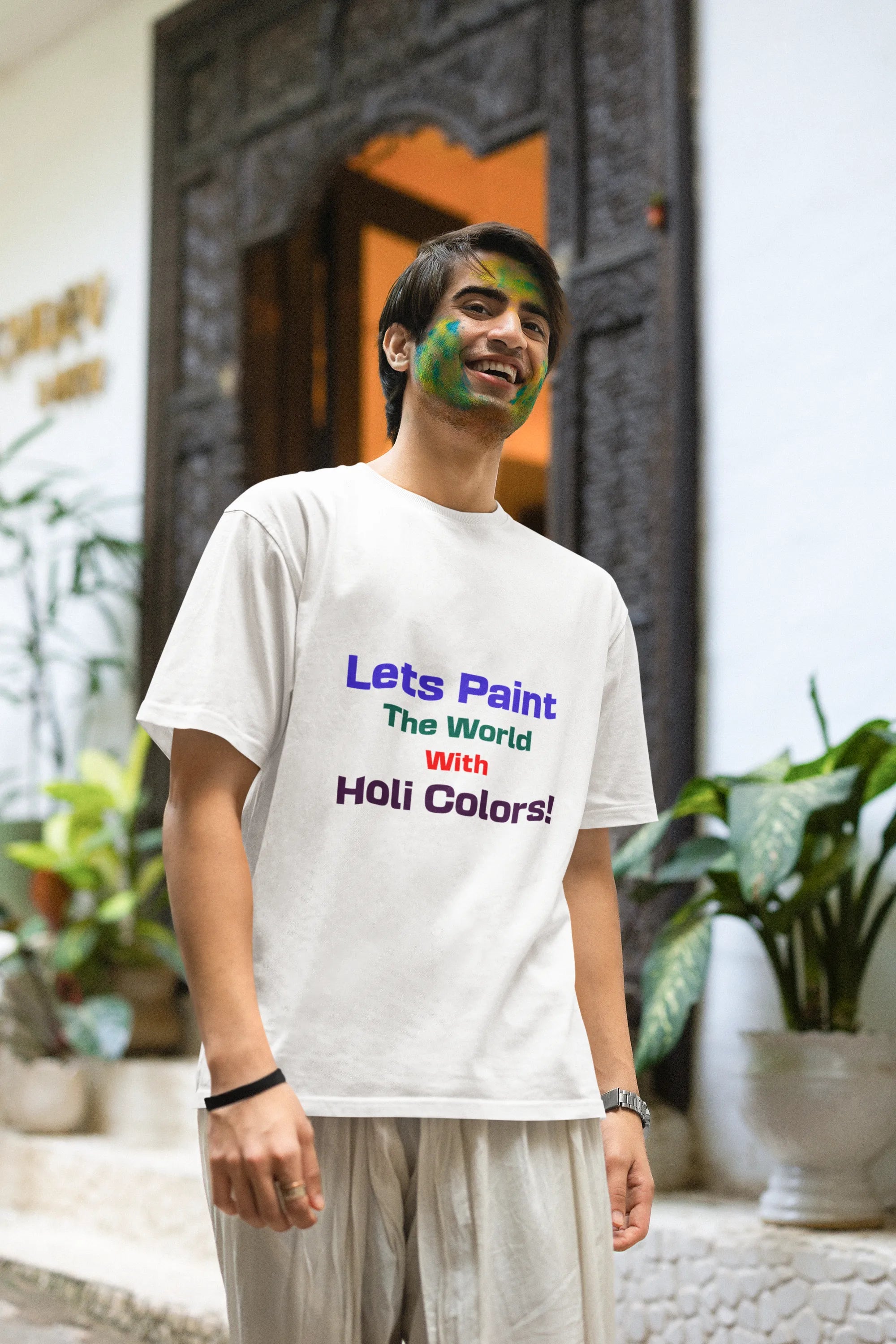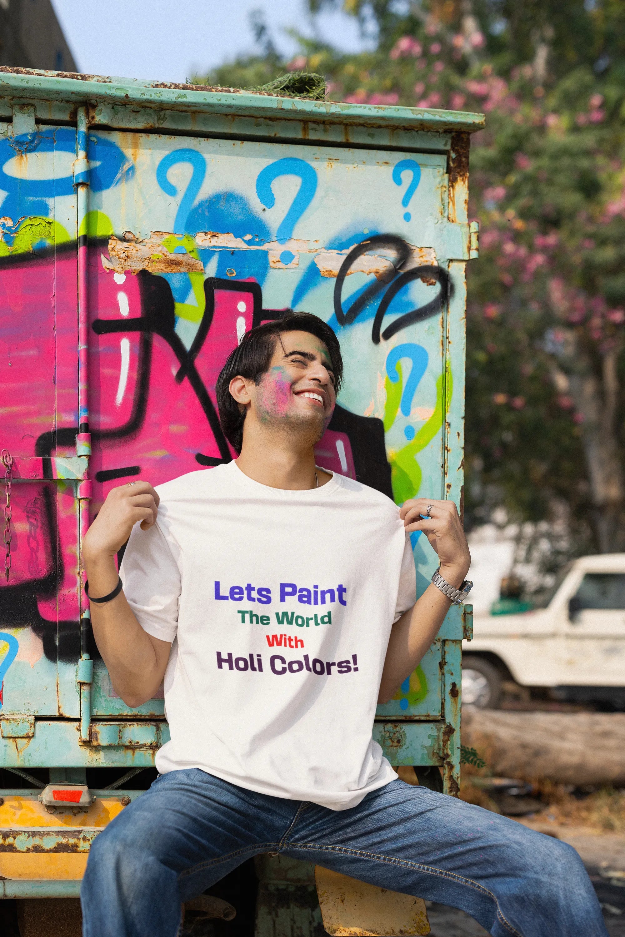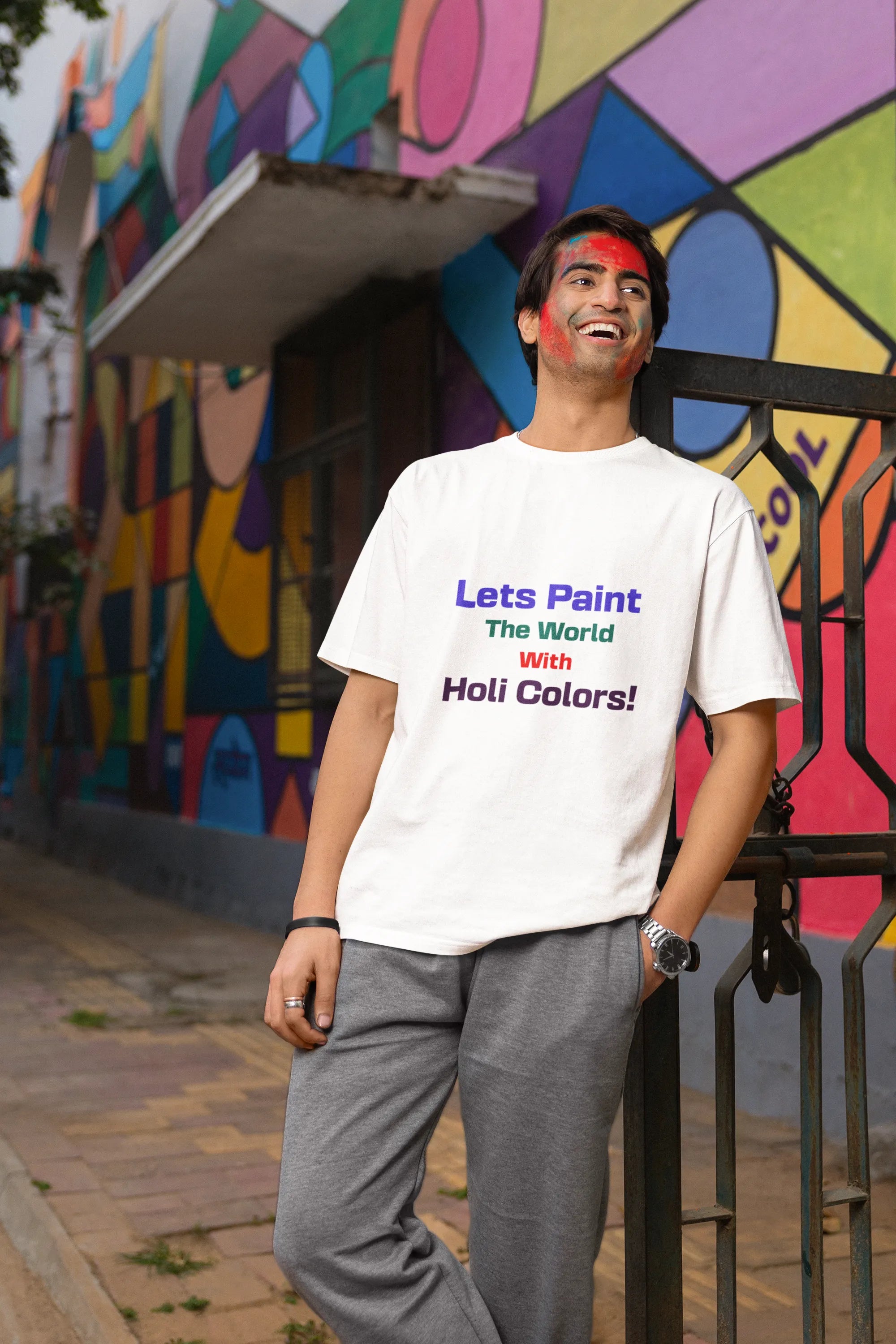 The "Let's Paint the World with Holi Colors" T-shirt design bursts with vibrant splashes of color, capturing the festive spirit of Holi. Featuring playful brush strokes, color splatters, and bold typography, it radiates joy, unity, and celebration, making it the perfect festive wear.