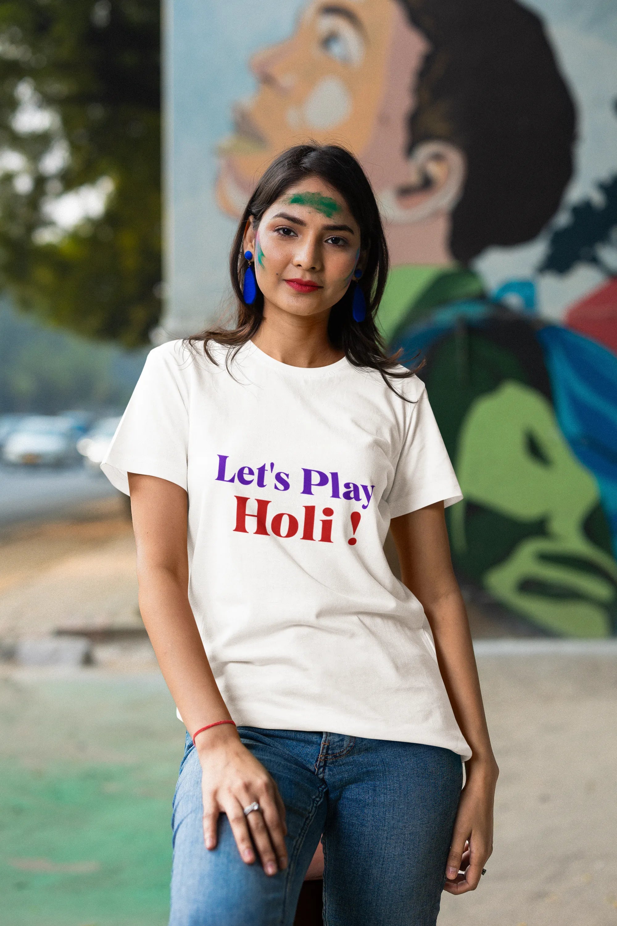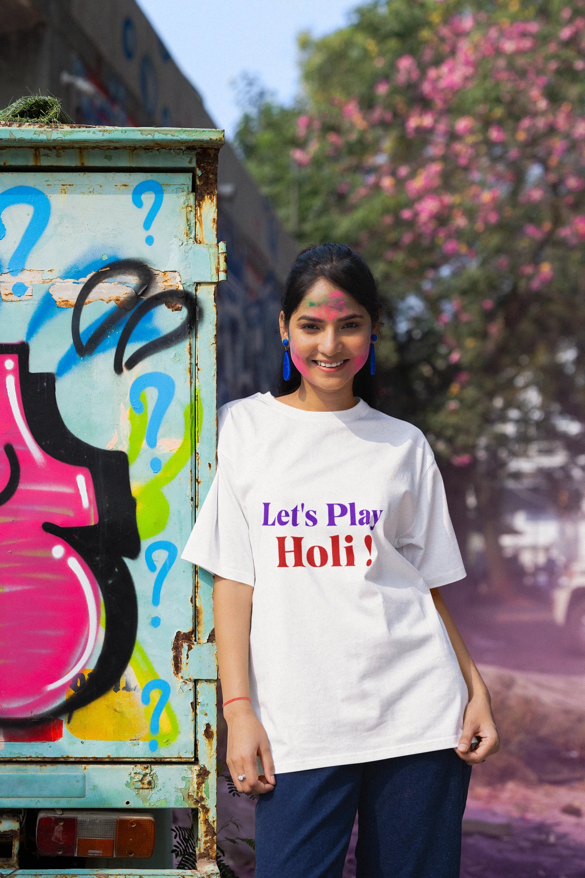 Person wearing a white t-shirt with 'Let's Play Holi!' text in front of a colorful geometric-patterned wall.